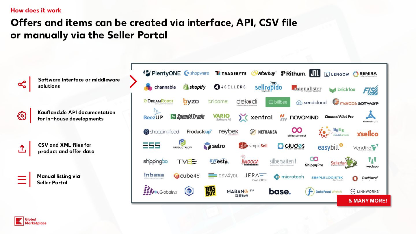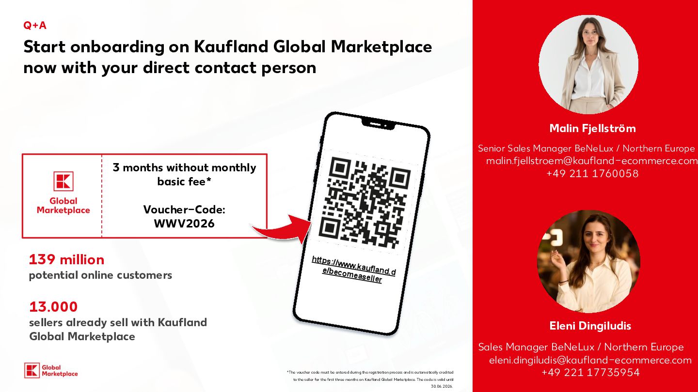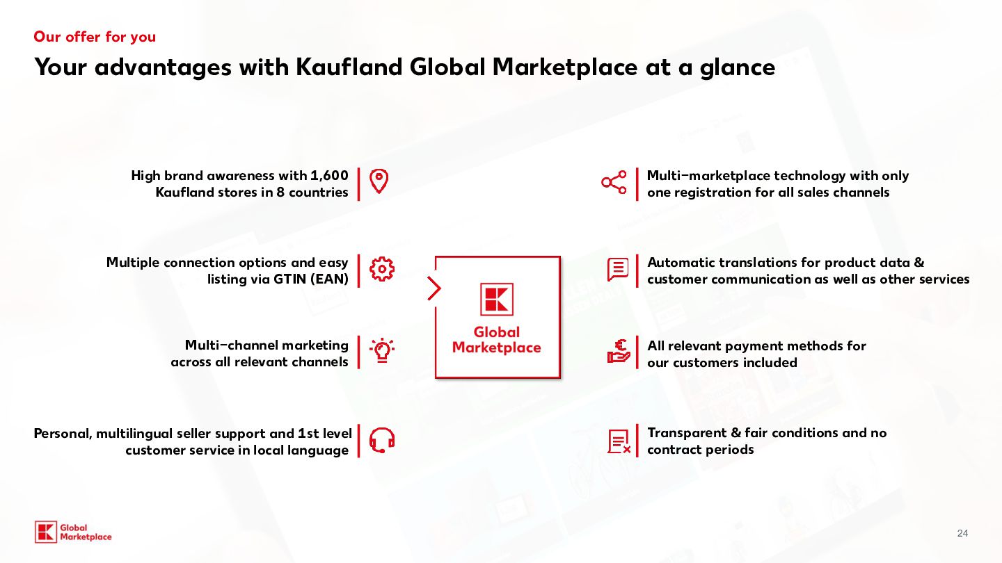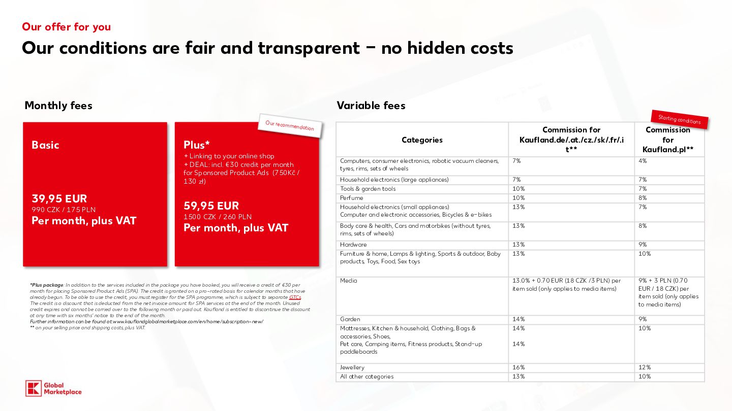 costs Monthly fees Variable fees Categories Commission for Kaufland.de/.at./cz./sk/.fr/.i t** Commission for Kaufland.pl** Computers, consumer electronics, robotic vacuum cleaners, tyres, rims, sets of wheels 7% 4% Household electronics (large appliances) 7% 7% Tools & garden tools 10% 7% Perfume 10% 8% Household electronics (small appliances) Computer and electronic accessories, Bicycles & e-bikes 13% 7% Body care & health, Cars and motorbikes (without tyres, rims, sets of wheels) 13% 8% Hardware 13% 9% Furniture & home, Lamps & lighting, Sports & outdoor, Baby products, Toys, Food, Sex toys 13% 10% Media 13.0% + 0.70 EUR (18 CZK /3 PLN) per item sold (only applies to media items) 9% + 3 PLN (0.70 EUR / 18 CZK) per item sold (only applies to media items) Garden 14% 9% Mattresses, Kitchen & household, Clothing, Bags & accessories, Shoes, Pet care, Camping items, Fitness products, Stand-up paddleboards 14% 14% 10% Jewellery 16% 12% All other categories 13% 10% Our offer for you Starting conditions Basic 39,95 EUR 990 CZK / 175 PLN Per month, plus VAT Plus* + Linking to your online shop + DEAL: incl. €30 credit per month for Sponsored Product Ads (750Kč / 130 zł) 59,95 EUR 1500 CZK / 260 PLN Per month, plus VAT *Plus package: In addition to the services included in the package you have booked, you will receive a credit of €30 per month for placing Sponsored Product Ads (SPA). The credit is granted on a pro-rated basis for calendar months that have already begun. To be able to use the credit, you must register for the SPA programme, which is subject to separate GTCs. The credit is a discount that is deducted from the net invoice amount for SPA services at the end of the month. Unused credit expires and cannot be carried over to the following month or paid out. Kaufland is entitled to discontinue the discount at any time with six months’ notice to the end of the month. Further information can be found at:www.kauflandglobalmarketplace.com/en/home/subscription-new/ ** on your selling price and shipping costs, plus VAT. Our recommendation
