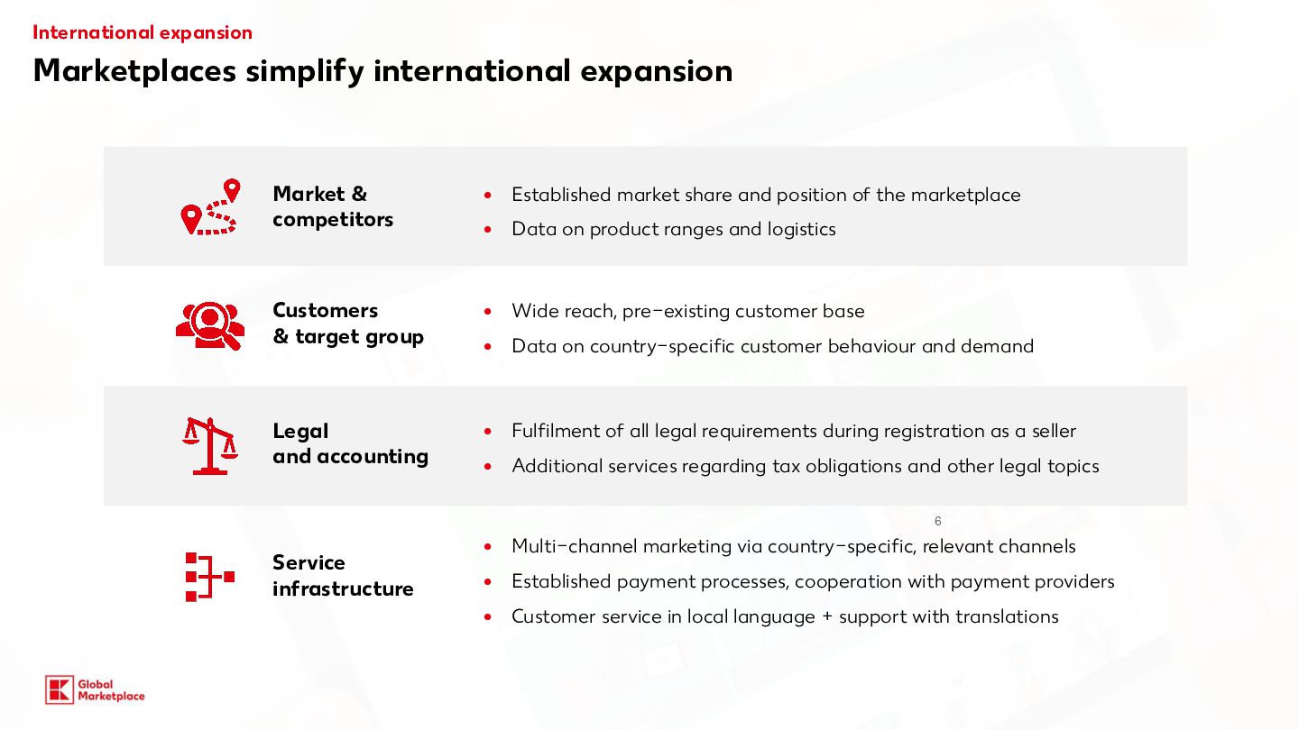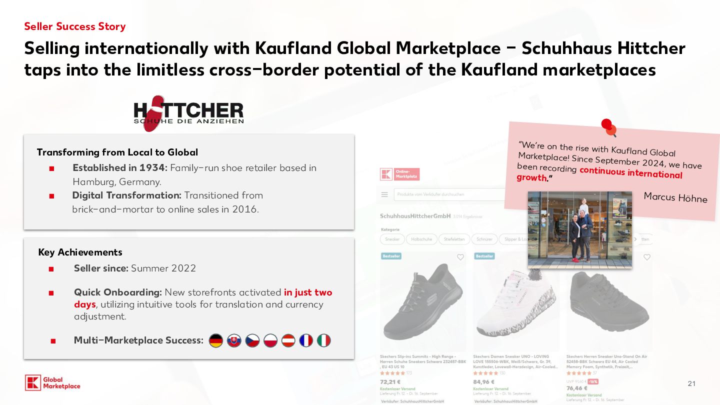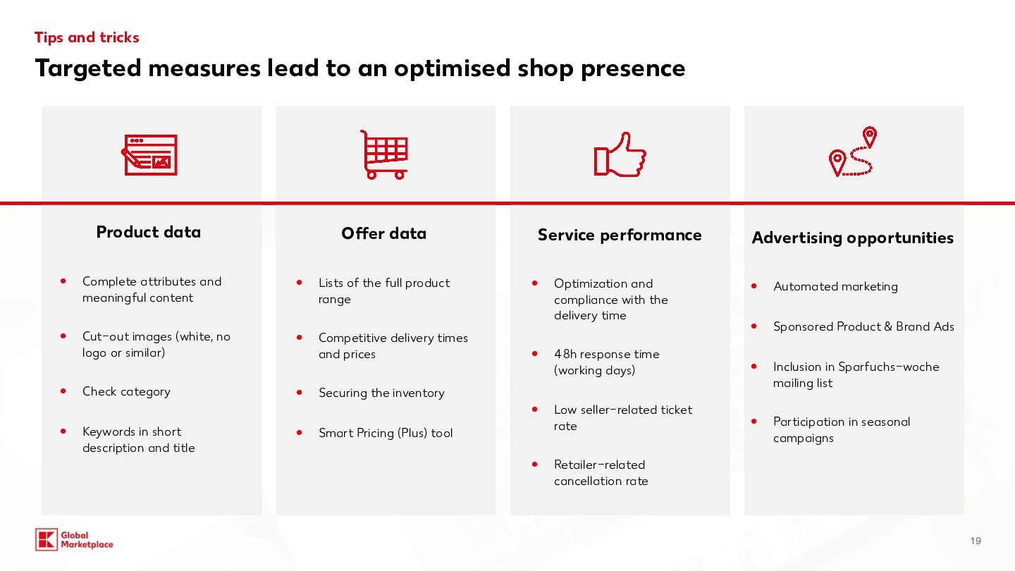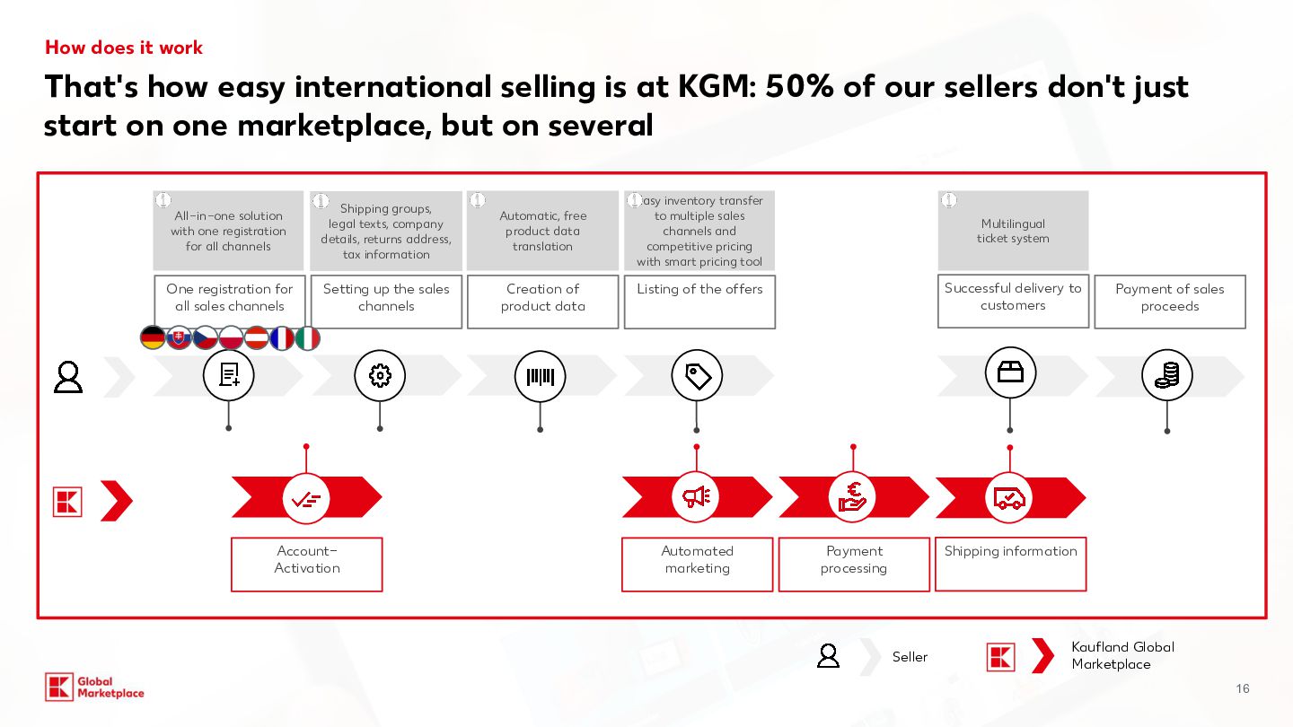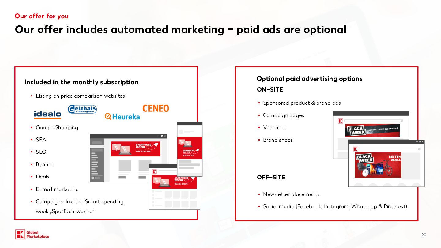 costs Monthly fees Variable fees Categories Commission for Kaufland.de/.at./cz./sk/.fr/.i t** Commission for Kaufland.pl** Computers, consumer electronics, robotic vacuum cleaners, tyres, rims, sets of wheels 7% 4% Household electronics (large appliances) 7% 7% Tools & garden tools 10% 7% Perfume 10% 8% Household electronics (small appliances) Computer and electronic accessories, Bicycles & e-bikes 13% 7% Body care & health, Cars and motorbikes (without tyres, rims, sets of wheels) 13% 8% Hardware 13% 9% Furniture & home, Lamps & lighting, Sports & outdoor, Baby products, Toys, Food, Sex toys 13% 10% Media 13.0% + 0.70 EUR (18 CZK /3 PLN) per item sold (only applies to media items) 9% + 3 PLN (0.70 EUR / 18 CZK) per item sold (only applies to media items) Garden 14% 9% Mattresses, Kitchen & household, Clothing, Bags & accessories, Shoes, Pet care, Camping items, Fitness products, Stand-up paddleboards 14% 14% 10% Jewellery 16% 12% All other categories 13% 10% Our offer for you Starting conditions Basic 39,95 EUR 990 CZK / 175 PLN Per month, plus VAT Plus* + Linking to your online shop + DEAL: incl. €30 credit per month for Sponsored Product Ads (750Kč / 130 zł) 59,95 EUR 1500 CZK / 260 PLN Per month, plus VAT *Plus package: In addition to the services included in the package you have booked, you will receive a credit of €30 per month for placing Sponsored Product Ads (SPA). The credit is granted on a pro-rated basis for calendar months that have already begun. To be able to use the credit, you must register for the SPA programme, which is subject to separate GTCs. The credit is a discount that is deducted from the net invoice amount for SPA services at the end of the month. Unused credit expires and cannot be carried over to the following month or paid out. Kaufland is entitled to discontinue the discount at any time with six months’ notice to the end of the month. Further information can be found at:www.kauflandglobalmarketplace.com/en/home/subscription-new/ ** on your selling price and shipping costs, plus VAT. Our recommendation