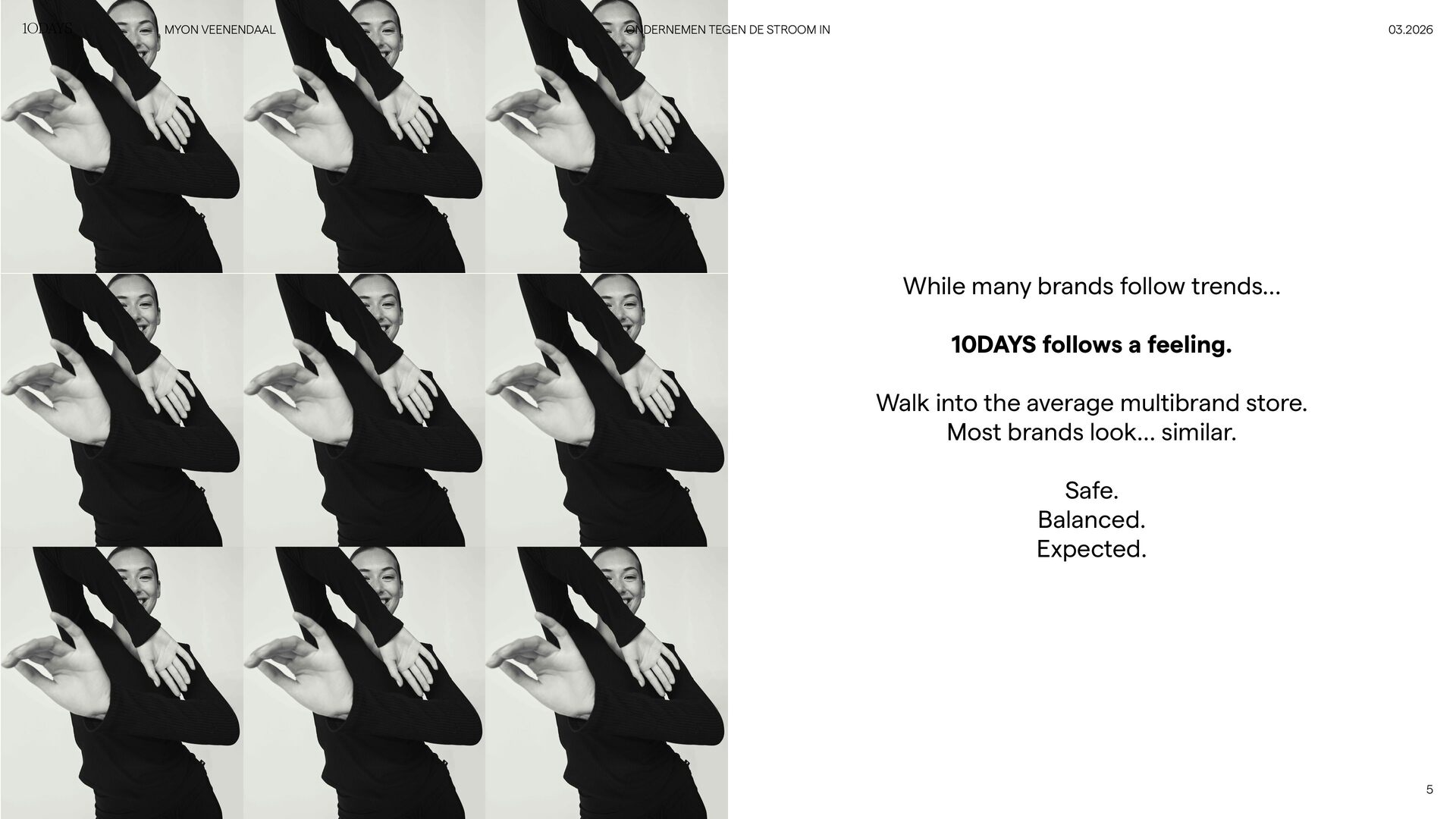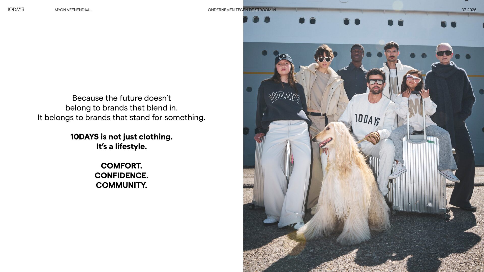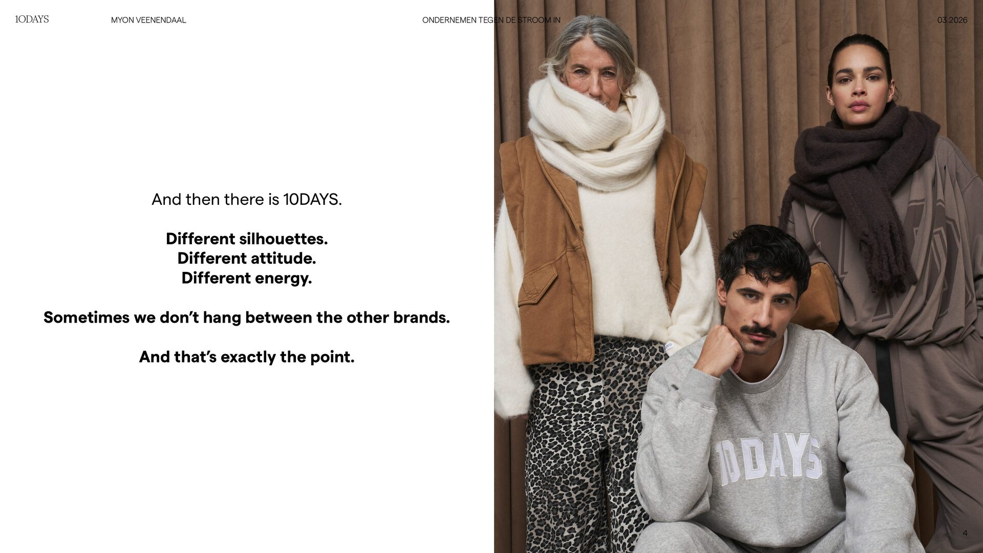 It belongs to brands that stand for something. 10DAYS is not just clothing. It’s a lifestyle. COMFORT. CONFIDENCE. COMMUNITY. 6 03.2026 ONDERNEMEN TEGEN DE STROOM IN MYON VEENENDAAL