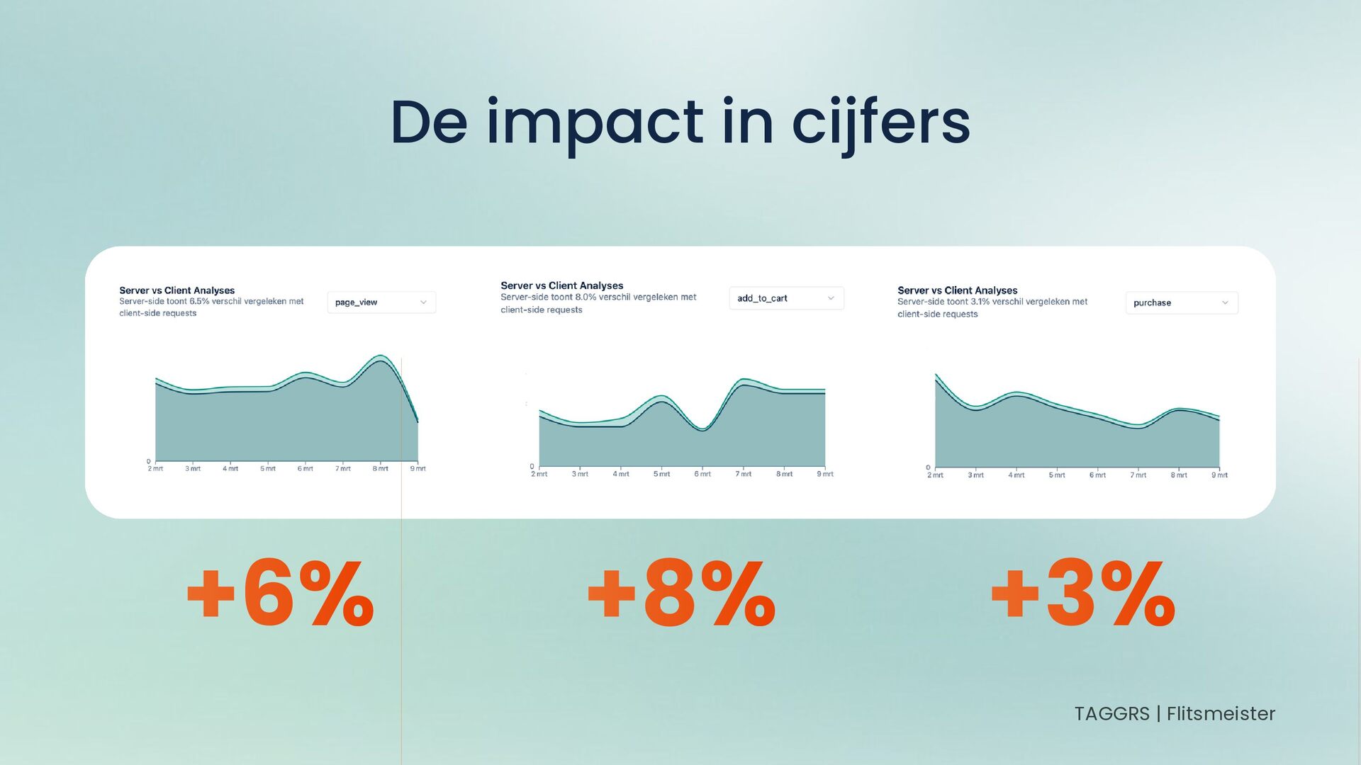 Meer volume op conversiepunten Verkeer: +6% page views Intentie: +8% add-to-carts Conversies: +3% purchases +6% De impact in cijfers TAGGRS | Flitsmeister +8% +3%