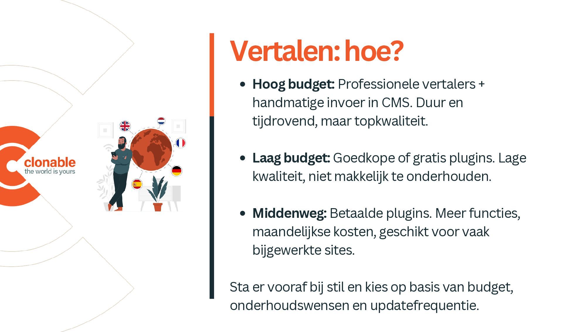 CMS. Duur en tijdrovend, maar topkwaliteit. Laag budget: Goedkope of gratis plugins. Lage kwaliteit, niet makkelijk te onderhouden. Middenweg: Betaalde plugins. Meer functies, maandelijkse kosten, geschikt voor vaak bijgewerkte sites. Sta er vooraf bij stil en kies op basis van budget, onderhoudswensen en updatefrequentie.