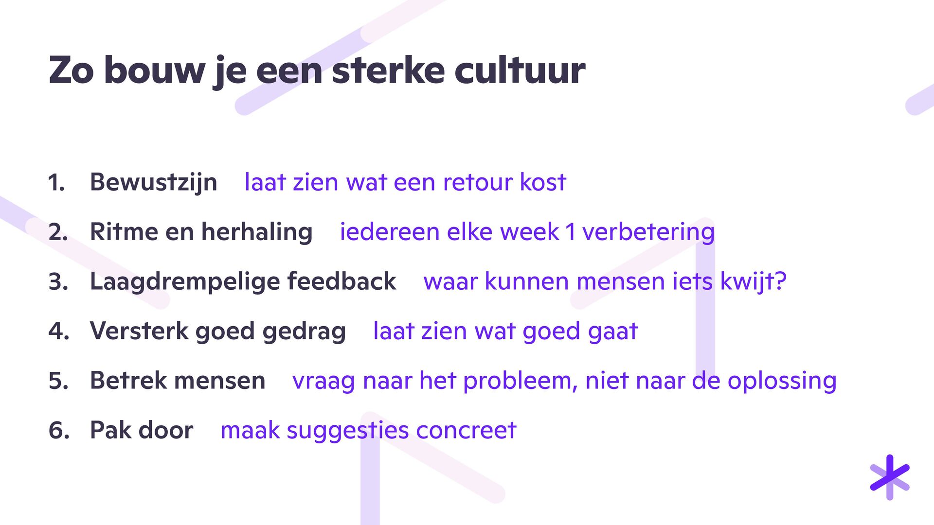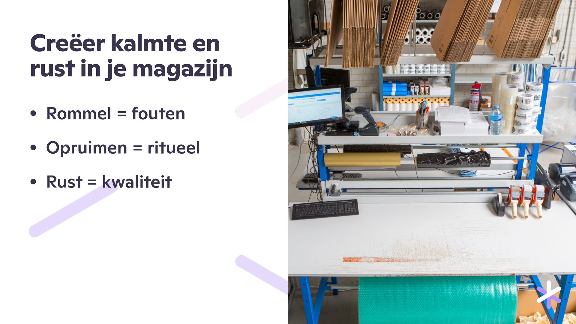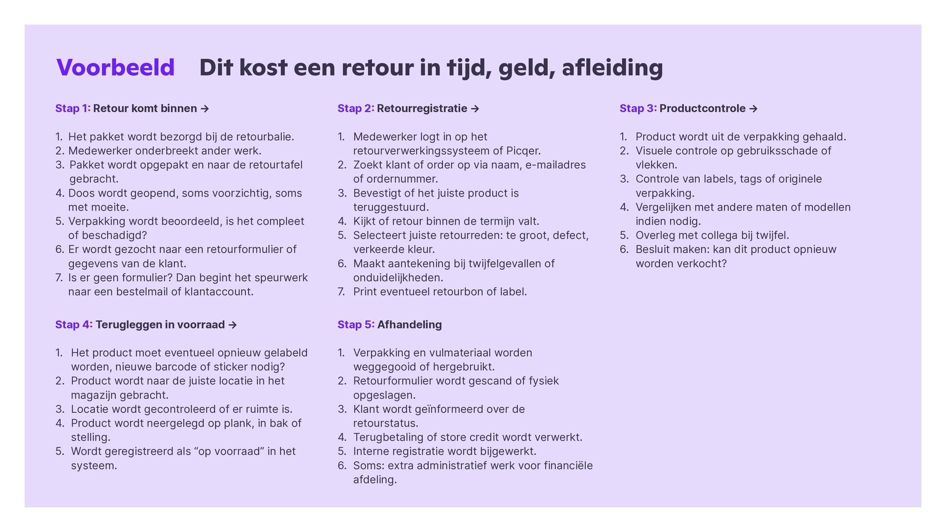 eiding Stap 1 : Retour komt binnen → 1. Het pakket wordt bezorgd bij de retourbalie. 2. Medewerker onderbreekt ander werk. 3. Pakket wordt opgepakt en naar de retourtafel gebracht. 4. Doos wordt geopend, soms voorzichtig, soms met moeite. 5. Verpakking wordt beoordeeld, is het compleet of beschadigd? 6. Er wordt gezocht naar een retourformulier of gegevens van de klant. 7. Is er geen formulier? Dan begint het speurwerk naar een bestelmail of klantaccount. Stap 2 : Retourregistratie → 1. Medewerker logt in op het retourverwerkingssysteem of Picqer. 2. Zoekt klant of order op via naam, e-mailadres of ordernummer. 3. Bevestigt of het juiste product is teruggestuurd. 4. Kijkt of retour binnen de termijn valt. 5. Selecteert juiste retourreden: te groot, defect, verkeerde kleur. 6. Maakt aantekening bij twijfelgevallen of onduidelijkheden. 7. Print eventueel retourbon of label. Stap 3 : Productcontrole → 1. Product wordt uit de verpakking gehaald. 2. Visuele controle op gebruiksschade of vlekken. 3. Controle van labels, tags of originele verpakking. 4. Vergelijken met andere maten of modellen indien nodig. 5. Overleg met collega bij twijfel. 6. Besluit maken: kan dit product opnieuw worden verkocht? Stap 4 : Terugleggen in voorraad → 1. Het product moet eventueel opnieuw gelabeld worden, nieuwe barcode of sticker nodig? 2. Product wordt naar de juiste locatie in het magazijn gebracht. 3. Locatie wordt gecontroleerd of er ruimte is. 4. Product wordt neergelegd op plank, in bak of stelling. 5. Wordt geregistreerd als “op voorraad” in het systeem. Stap 5 : Afhandeling 1. Verpakking en vulmateriaal worden weggegooid of hergebruikt. 2. Retourformulier wordt gescand of fysiek opgeslagen. 3. Klant wordt geïnformeerd over de retourstatus. 4. Terugbetaling of store credit wordt verwerkt. 5. Interne registratie wordt bijgewerkt. 6. Soms: extra administratief werk voor financiële afdeling.