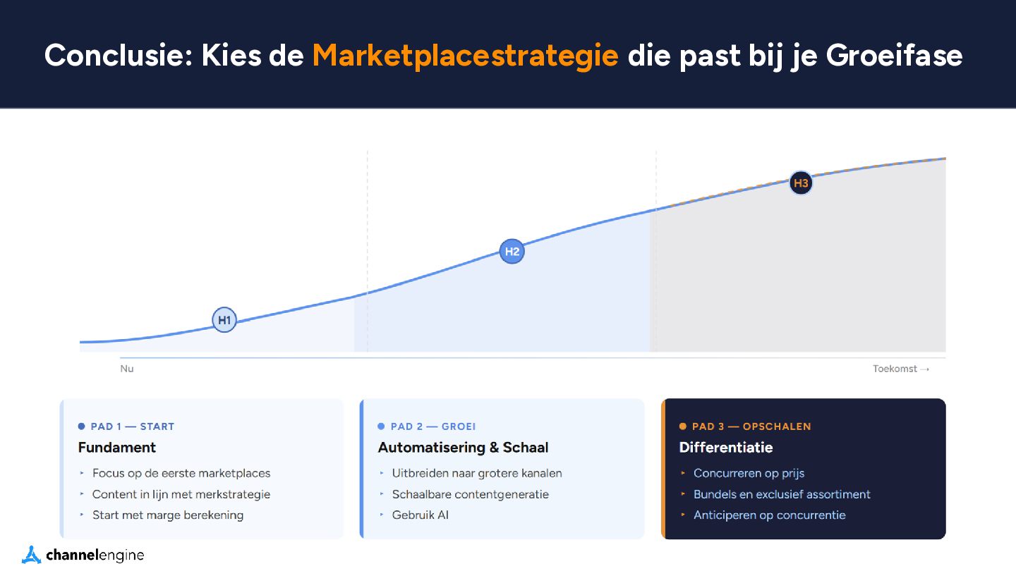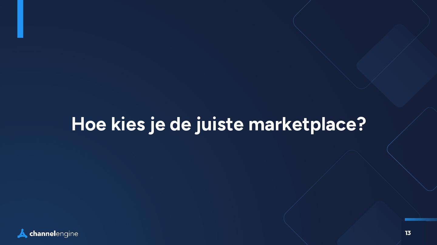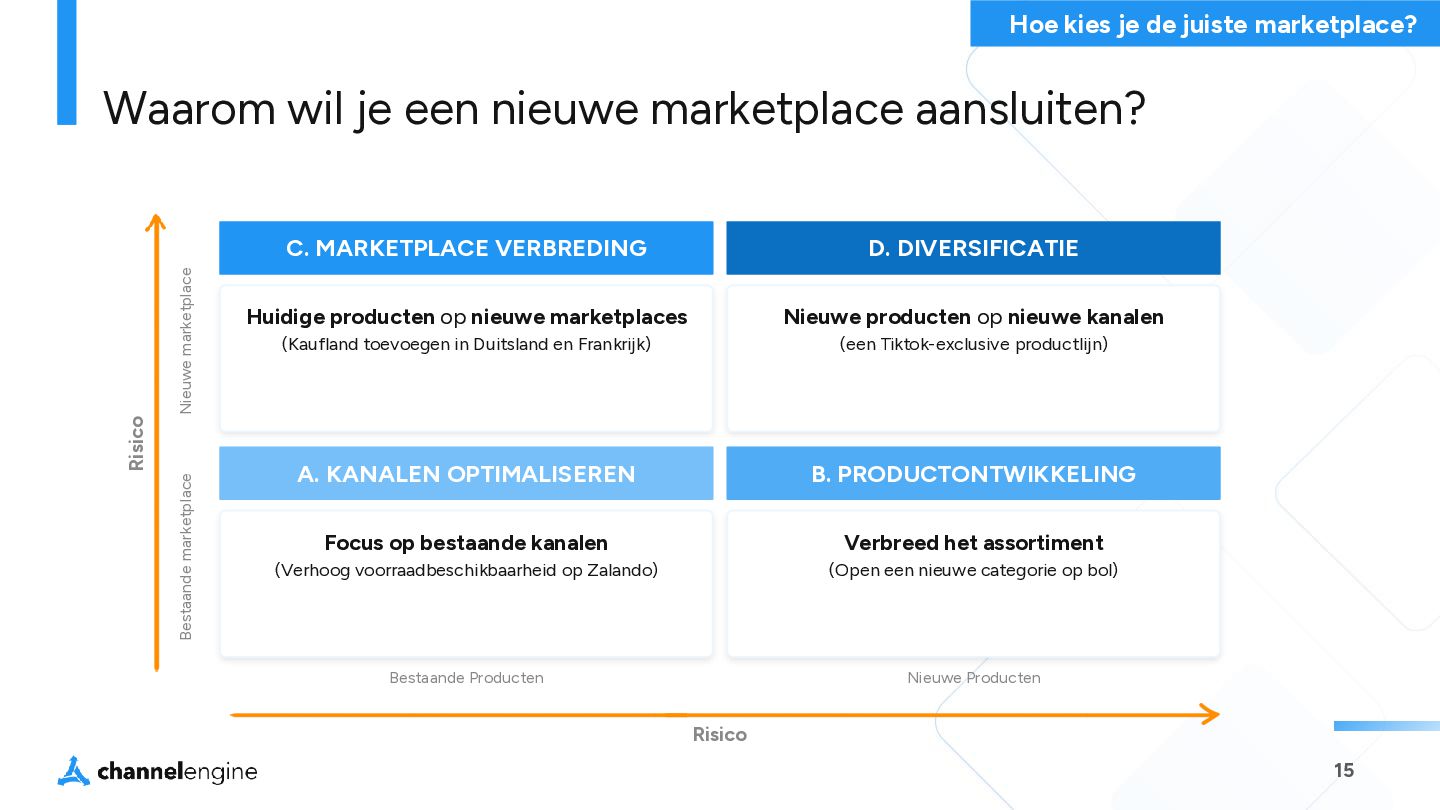 VERBREDING Huidige producten op nieuwe marketplaces (Kaufland toevoegen in Duitsland en Frankrijk) D. DIVERSIFICATIE Nieuwe producten op nieuwe kanalen (een Tiktok-exclusive productlijn) A. KANALEN OPTIMALISEREN Focus op bestaande kanalen (Verhoog voorraadbeschikbaarheid op Zalando) B. PRODUCTONTWIKKELING Verbreed het assortiment (Open een nieuwe categorie op bol) Bestaande marketplace Nieuwe marketplace Bestaande Producten Nieuwe Producten Risico Risico Hoe kies je de juiste marketplace?