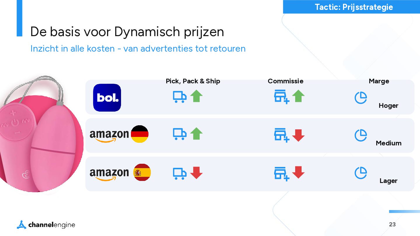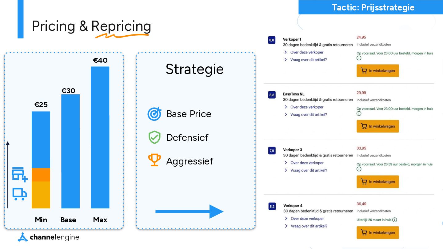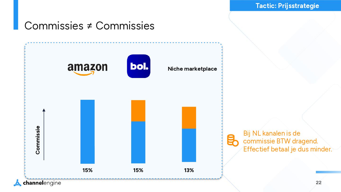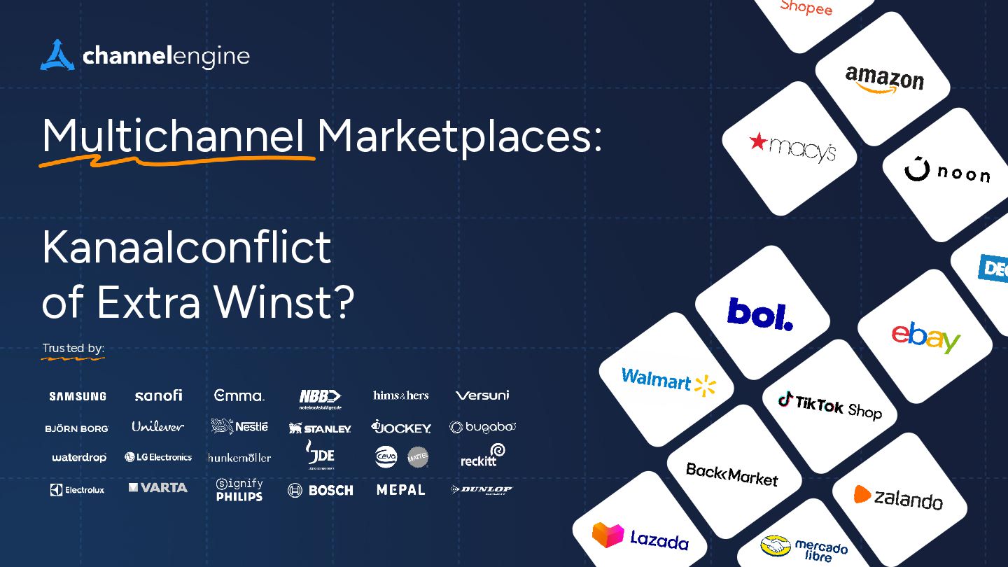 VERBREDING Huidige producten op nieuwe marketplaces (Kaufland toevoegen in Duitsland en Frankrijk) D. DIVERSIFICATIE Nieuwe producten op nieuwe kanalen (een Tiktok-exclusive productlijn) A. KANALEN OPTIMALISEREN Focus op bestaande kanalen (Verhoog voorraadbeschikbaarheid op Zalando) B. PRODUCTONTWIKKELING Verbreed het assortiment (Open een nieuwe categorie op bol) Bestaande marketplace Nieuwe marketplace Bestaande Producten Nieuwe Producten Risico Risico Hoe kies je de juiste marketplace?