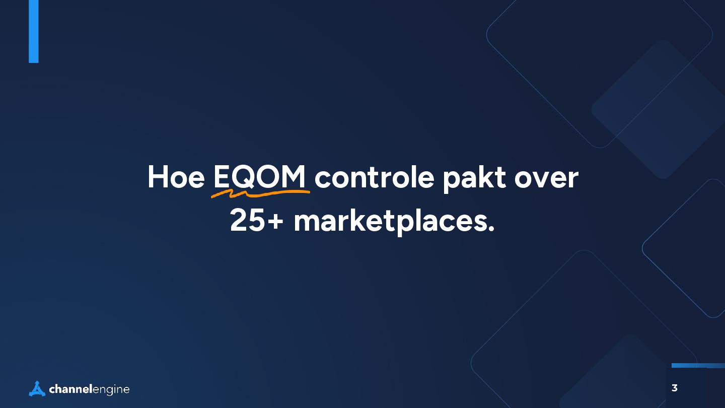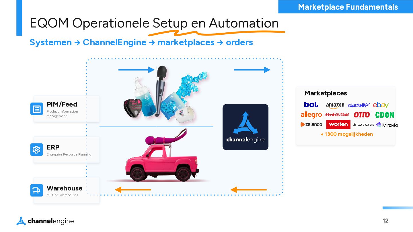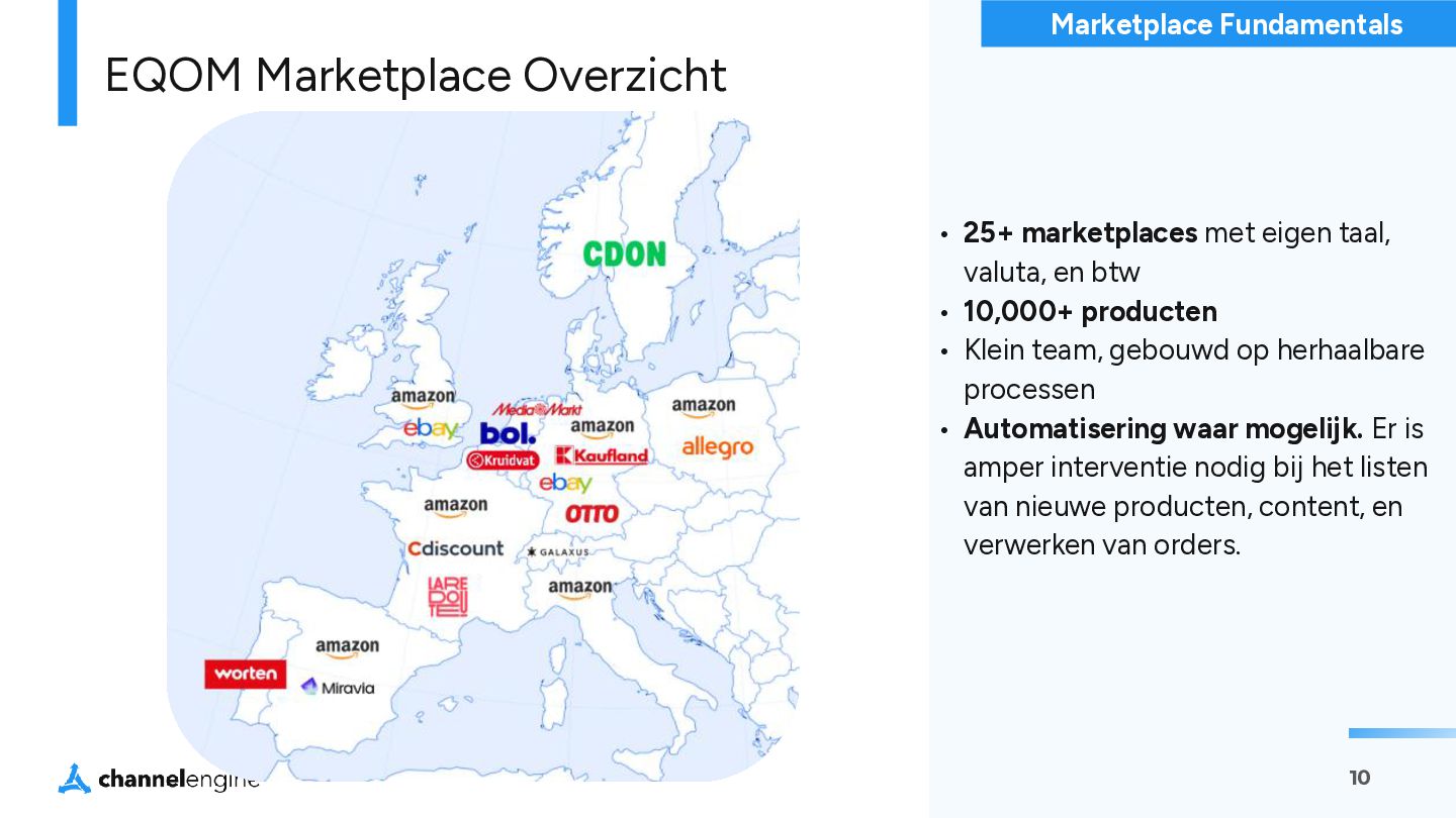 btw • 10,000+ producten • Klein team, gebouwd op herhaalbare processen • Automatisering waar mogelijk. Er is amper interventie nodig bij het listen van nieuwe producten, content, en verwerken van orders. EQOM Marketplace Overzicht Marketplace Fundamentals