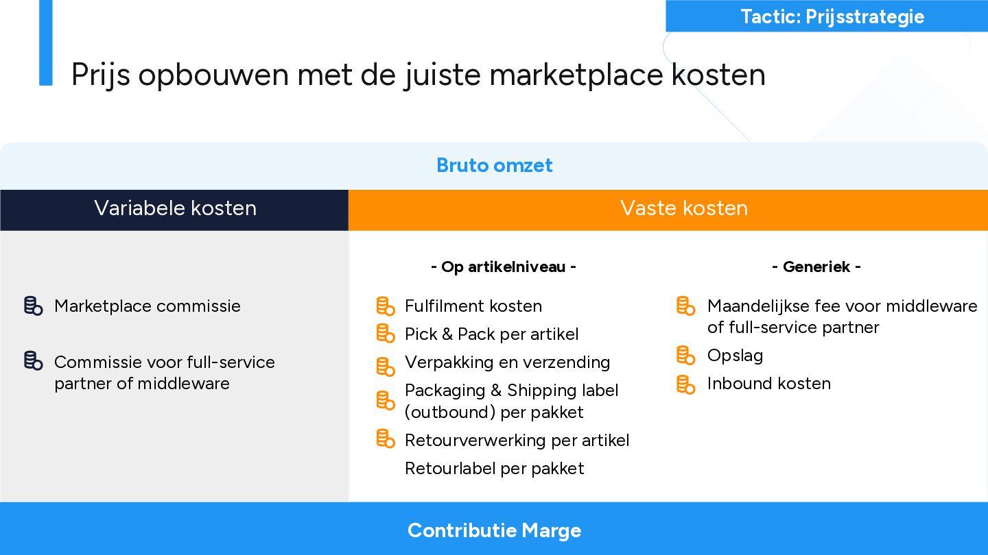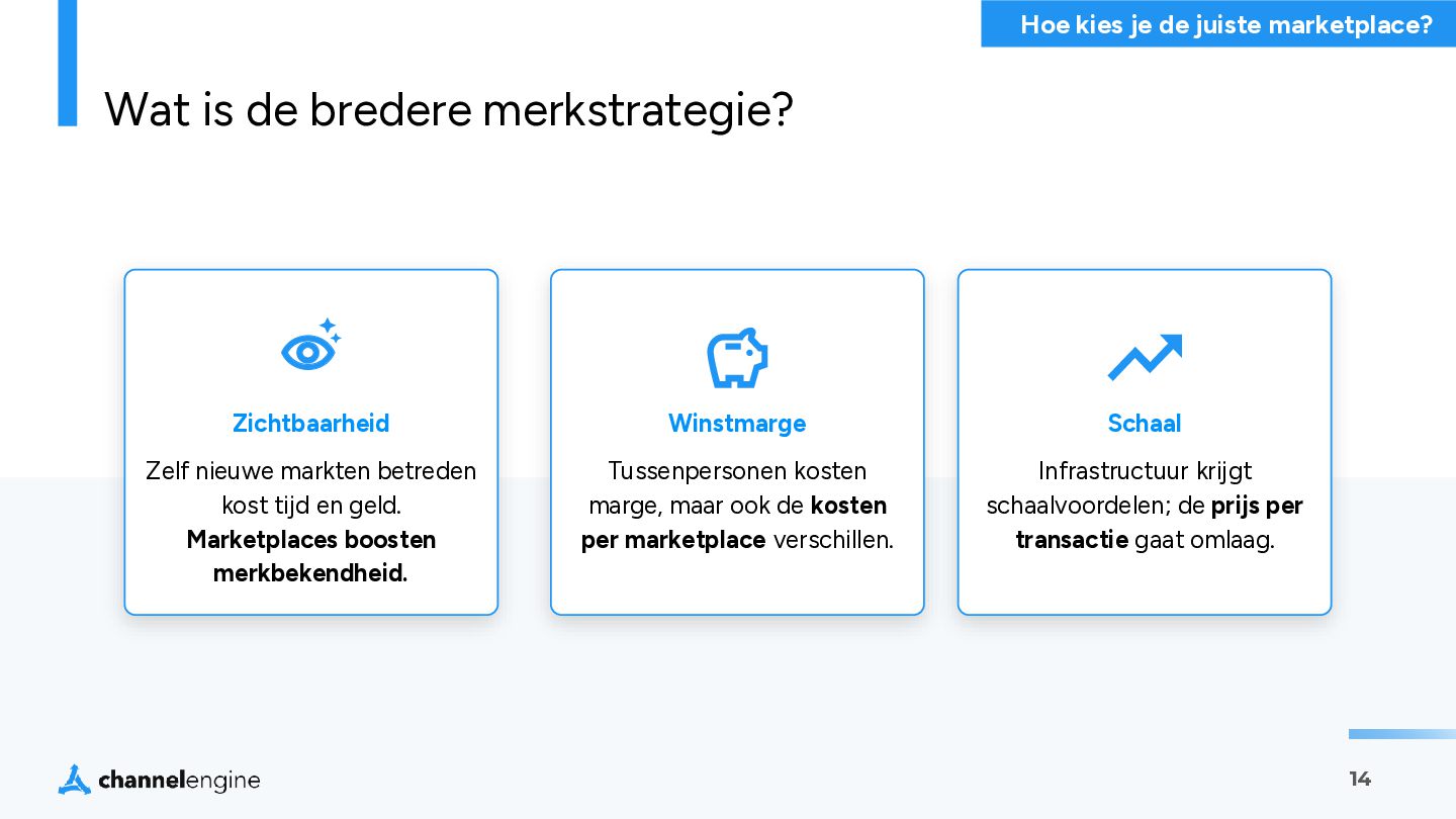 geld. Marketplaces boosten merkbekendheid. Wat is de bredere merkstrategie? Schaal Infrastructuur krijgt schaalvoordelen; de prijs per transactie gaat omlaag. Winstmarge Tussenpersonen kosten marge, maar ook de kosten per marketplace verschillen. Hoe kies je de juiste marketplace?