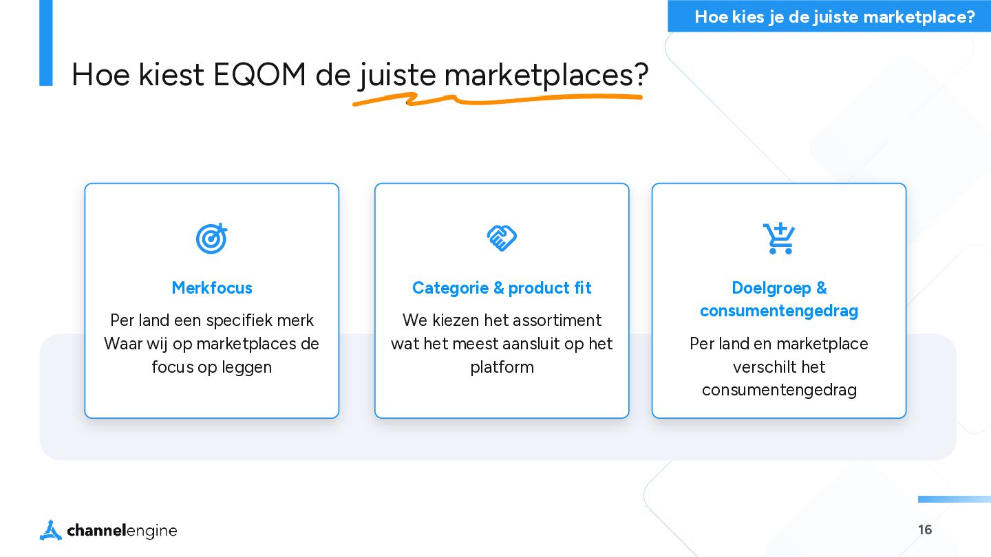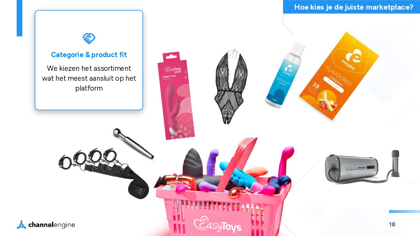 een specifiek merk Waar wij op marketplaces de focus op leggen Categorie & product fit We kiezen het assortiment wat het meest aansluit op het platform Doelgroep & consumentengedrag Per land en marketplace verschilt het consumentengedrag