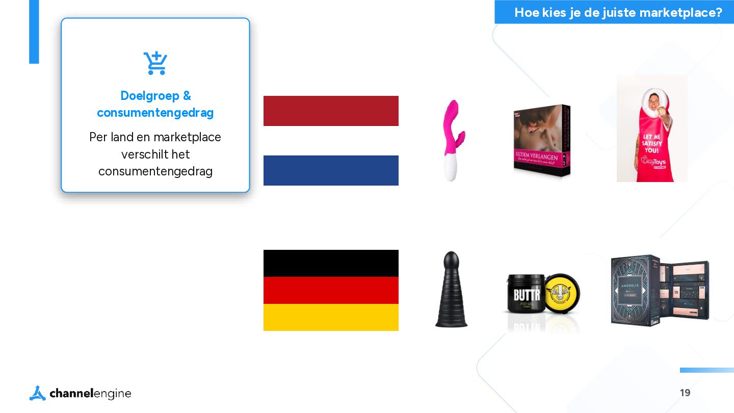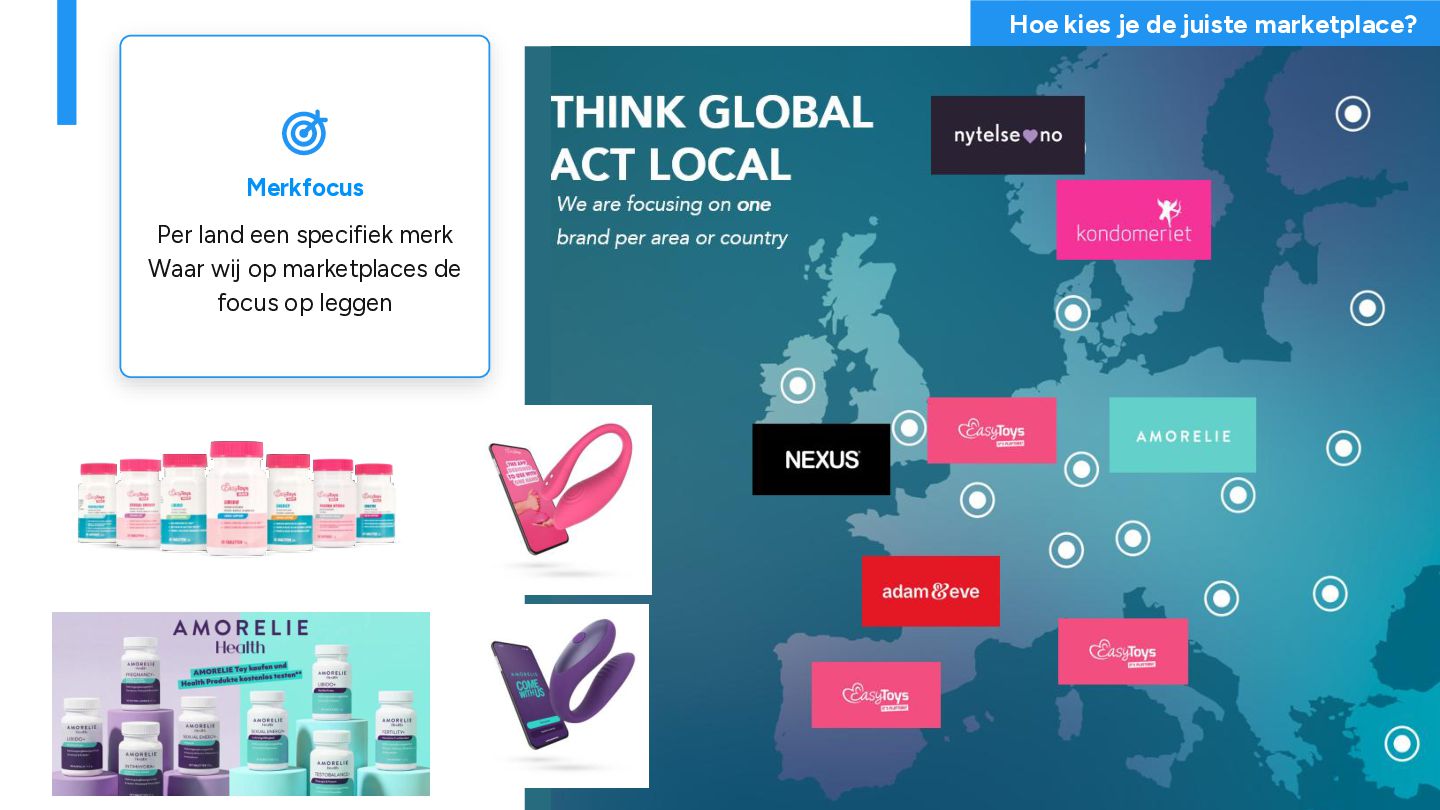 de juiste marketplace? Merkfocus Per land een specifiek merk Waar wij op marketplaces de focus op leggen Doelgroep & consumentengedrag Per land en marketplace verschilt het consumentengedrag Categorie & product fit We kiezen het assortiment wat het meest aansluit op het platform