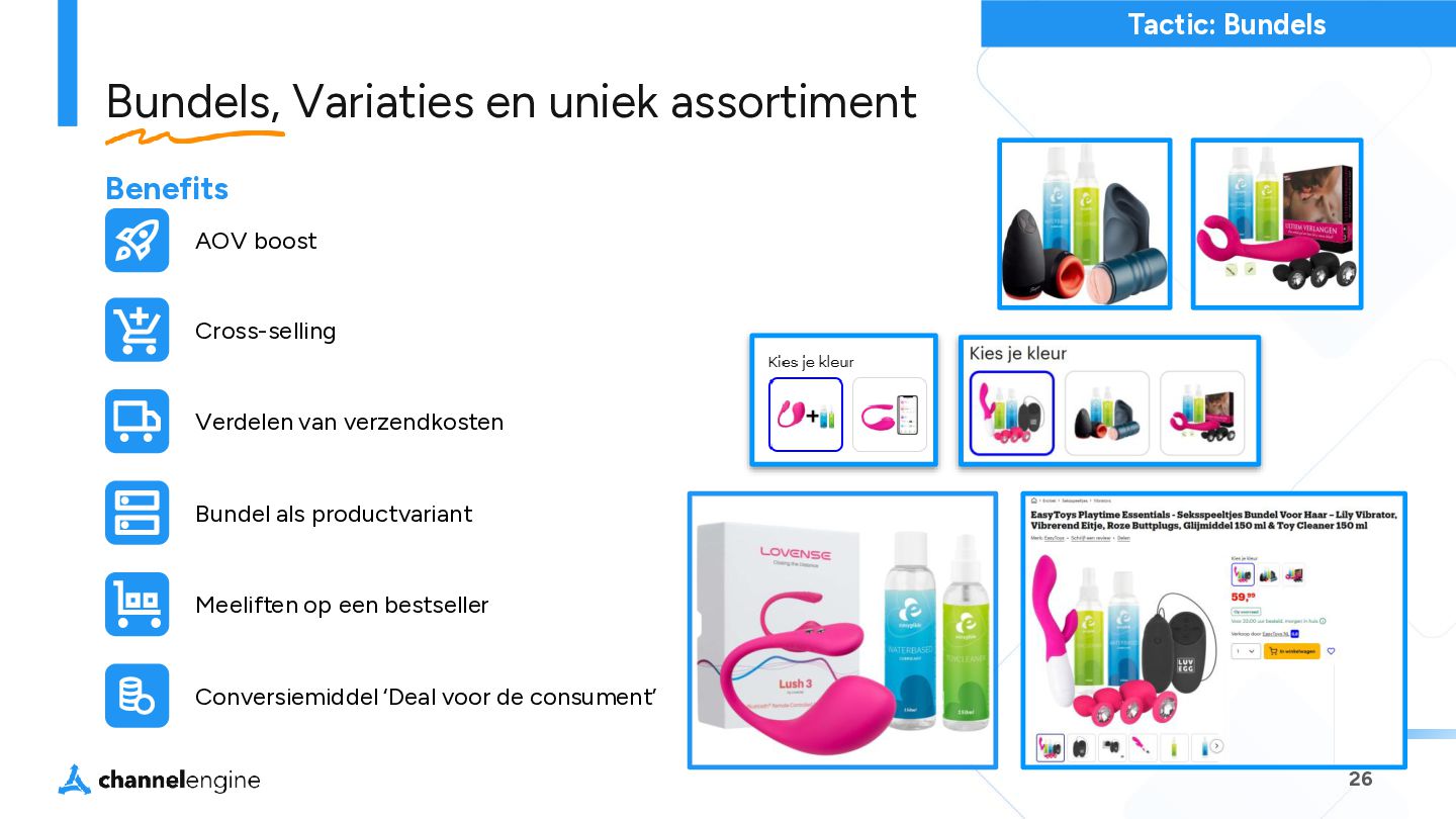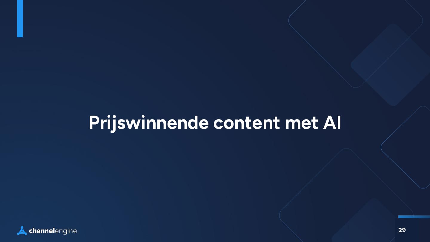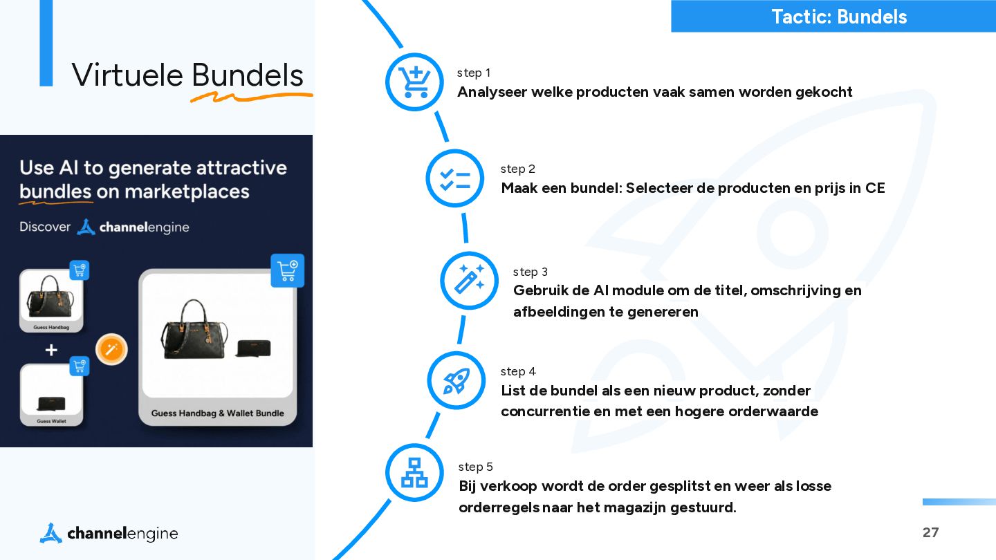 step 2 Maak een bundel: Selecteer de producten en prijs in CE step 3 Gebruik de AI module om de titel, omschrijving en afbeeldingen te genereren step 4 List de bundel als een nieuw product, zonder concurrentie en met een hogere orderwaarde step 5 Bij verkoop wordt de order gesplitst en weer als losse orderregels naar het magazijn gestuurd. Virtuele Bundels Tactic: Bundels
