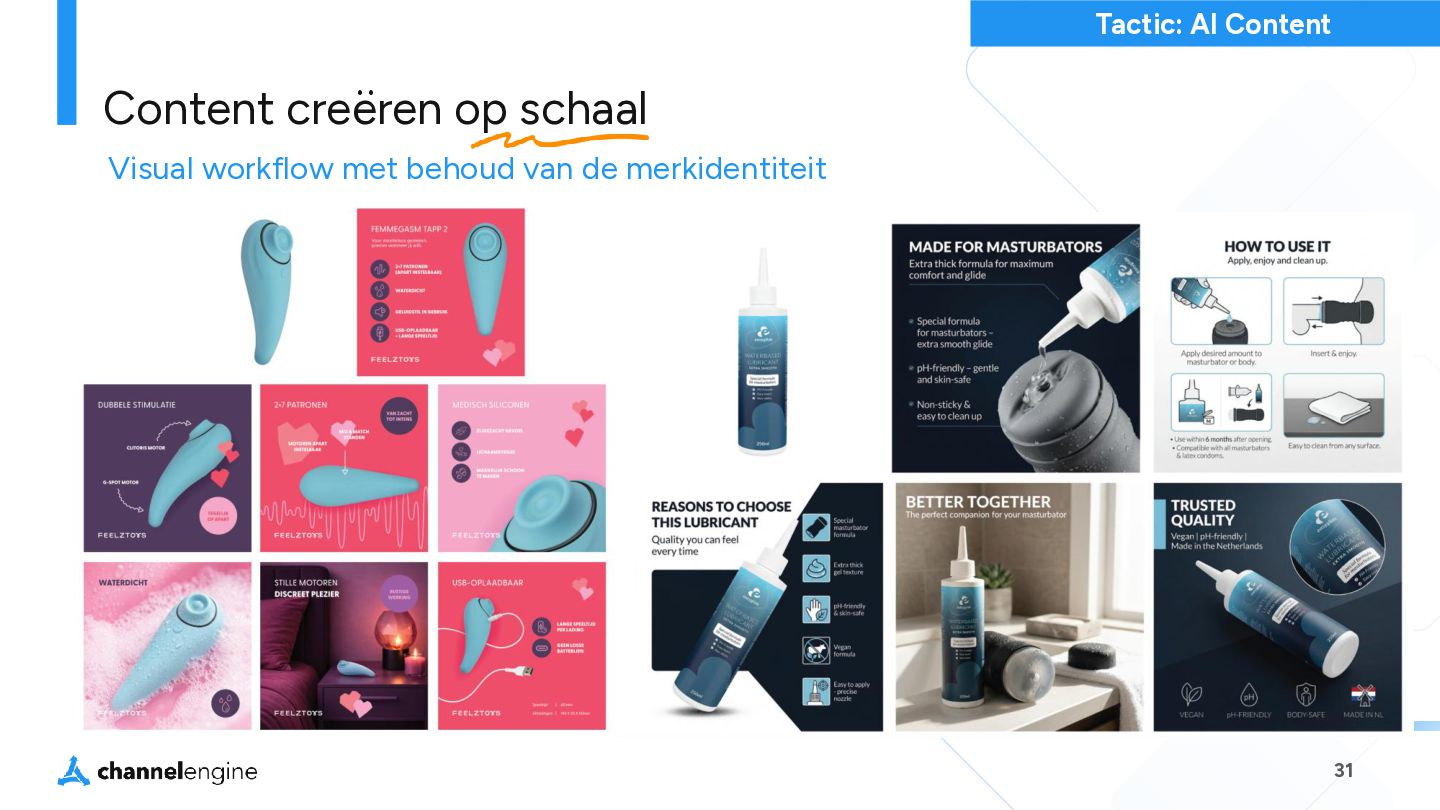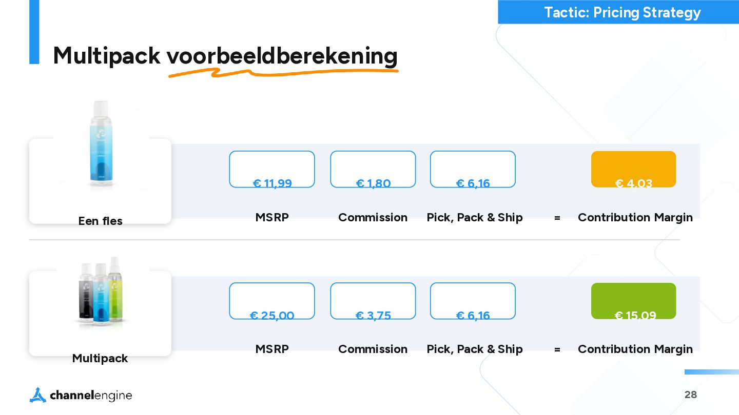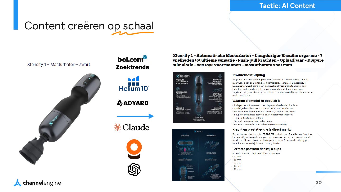 step 2 Maak een bundel: Selecteer de producten en prijs in CE step 3 Gebruik de AI module om de titel, omschrijving en afbeeldingen te genereren step 4 List de bundel als een nieuw product, zonder concurrentie en met een hogere orderwaarde step 5 Bij verkoop wordt de order gesplitst en weer als losse orderregels naar het magazijn gestuurd. Virtuele Bundels Tactic: Bundels