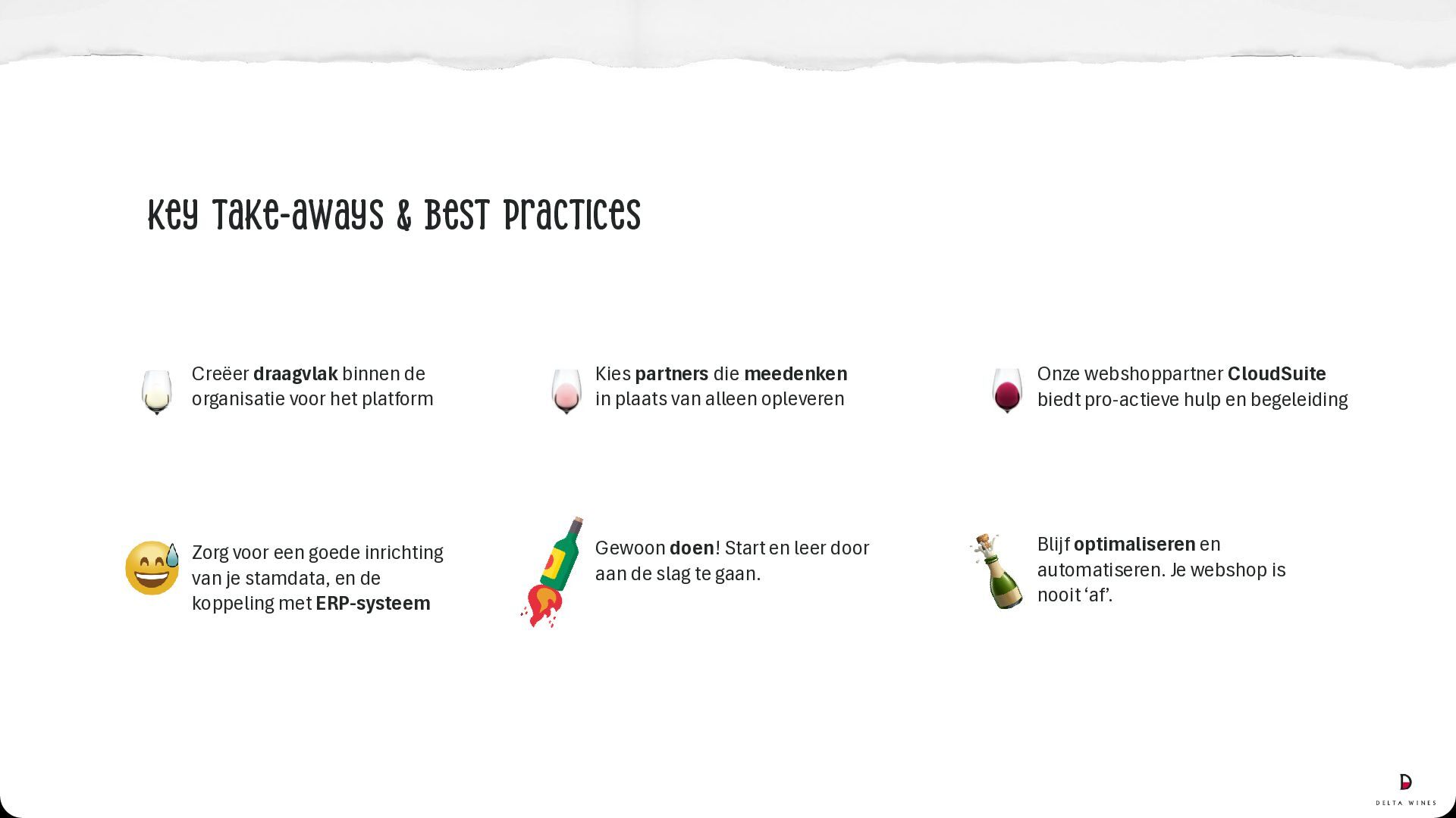 die meedenken in plaats van alleen opleveren Onze webshoppartner CloudSuite biedt pro-actieve hulp en begeleiding Blijf optimaliseren en automatiseren. Je webshop is nooit ‘af’. Zorg voor een goede inrichting van je stamdata, en de koppeling met ERP-systeem Gewoon doen! Start en leer door aan de slag te gaan. Key Take-aways & Best Practices