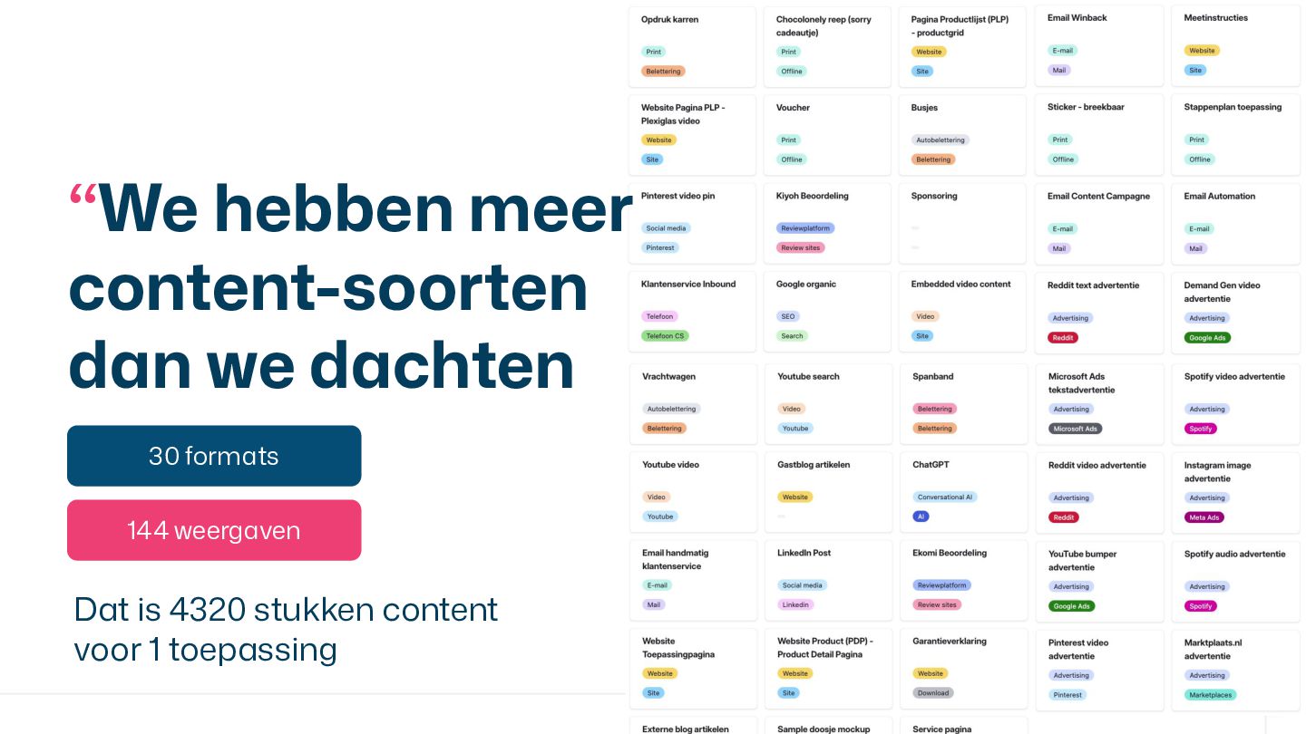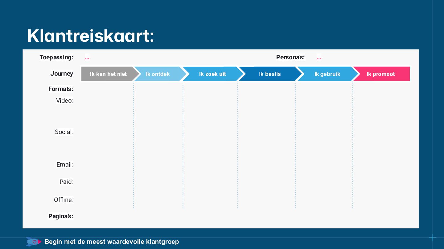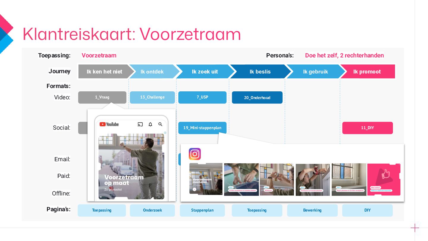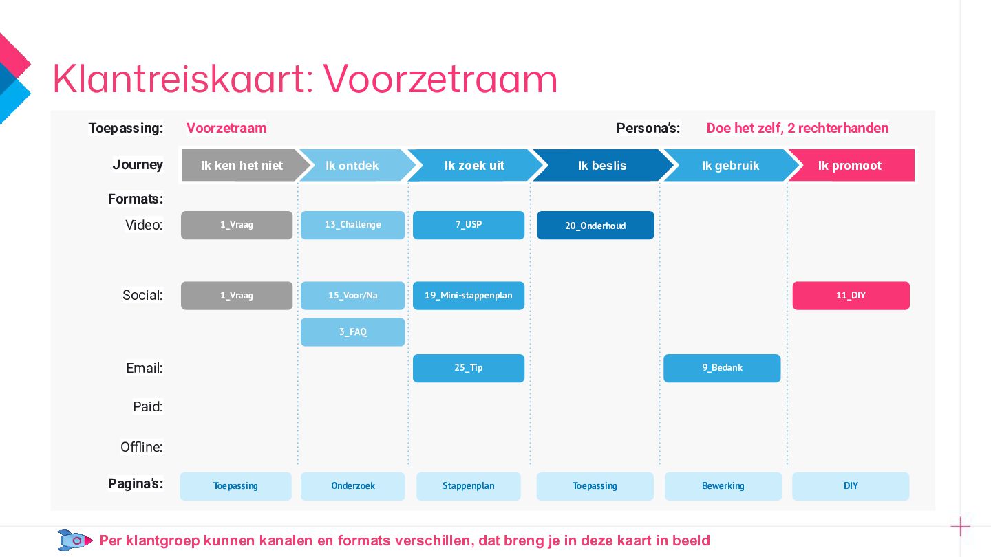 beslis Ik gebruik 3_FAQ 13_Challenge 15_Voor/Na 7_USP 25_Tip 19_Mini-stappenplan 9_Bedank 11_DIY 20_Onderhoud Ik ken het niet 1_Vraag Journey Pagina’s: Toepassing Onderzoek Stappenplan Bewerking Toepassing Formats: Toepassing: Voorzetraam Video: Social: Email: DIY 1_Vraag Paid: Offline: Persona’s: Doe het zelf, 2 rechterhanden Per klantgroep kunnen kanalen en formats verschillen, dat breng je in deze kaart in beeld