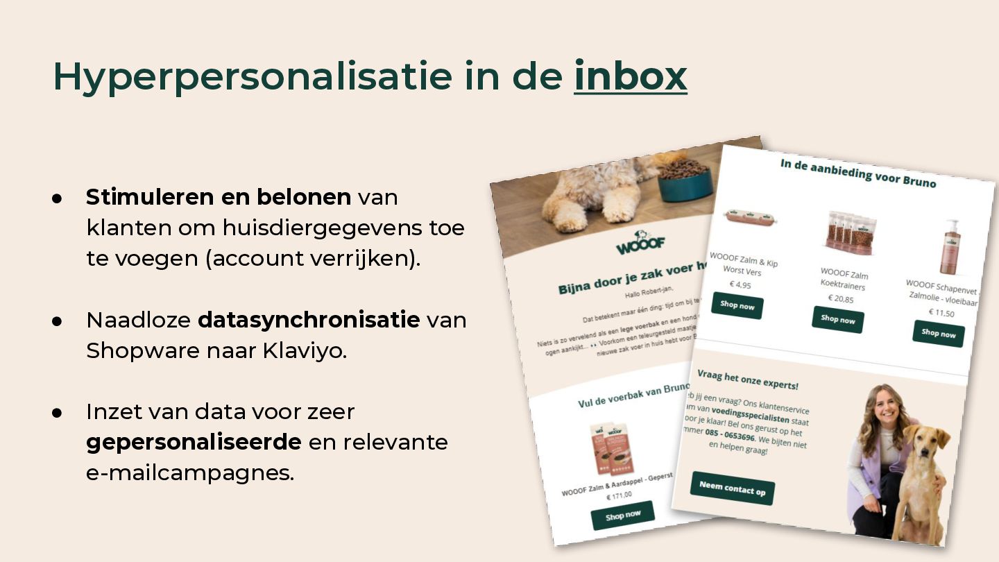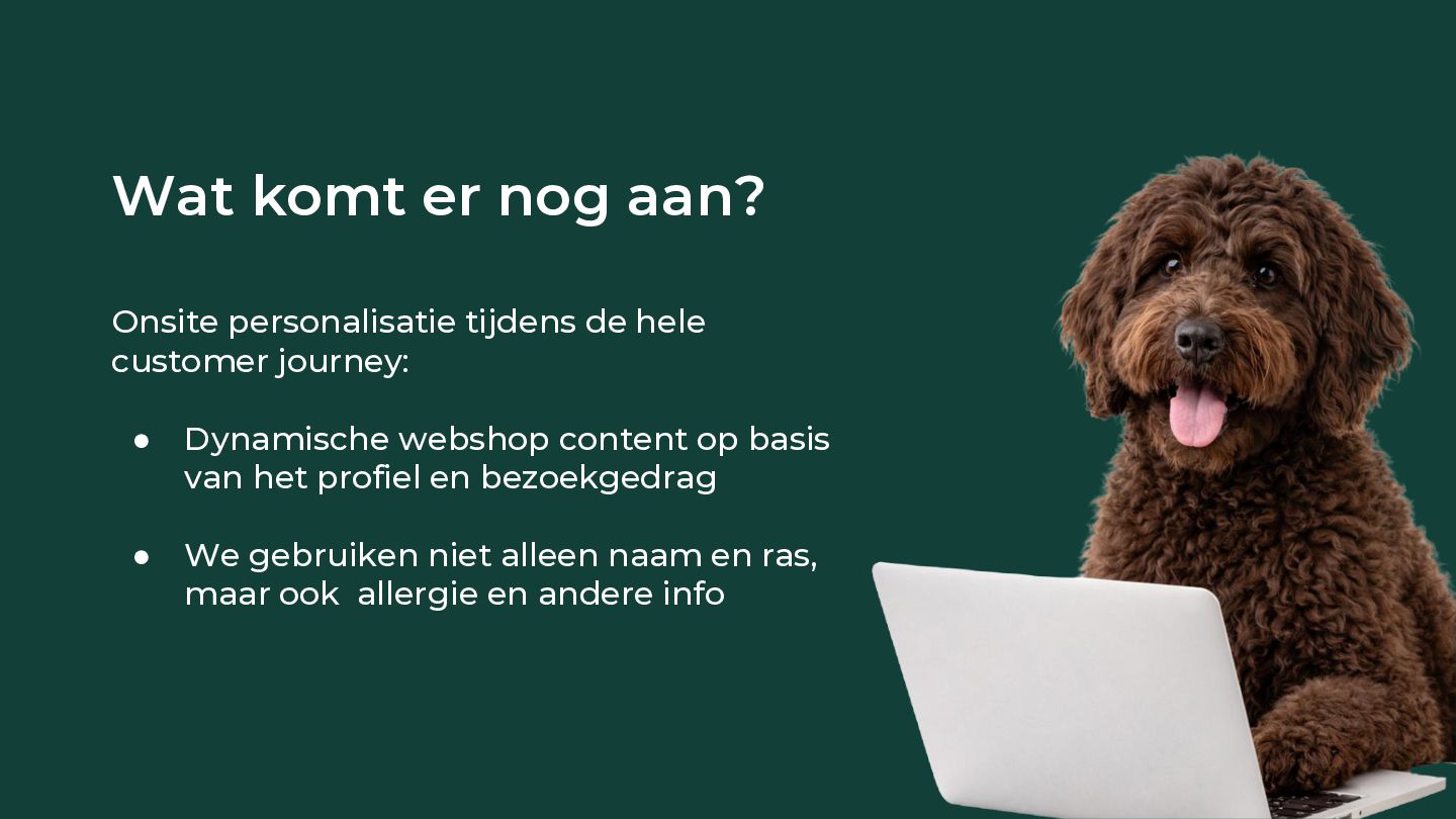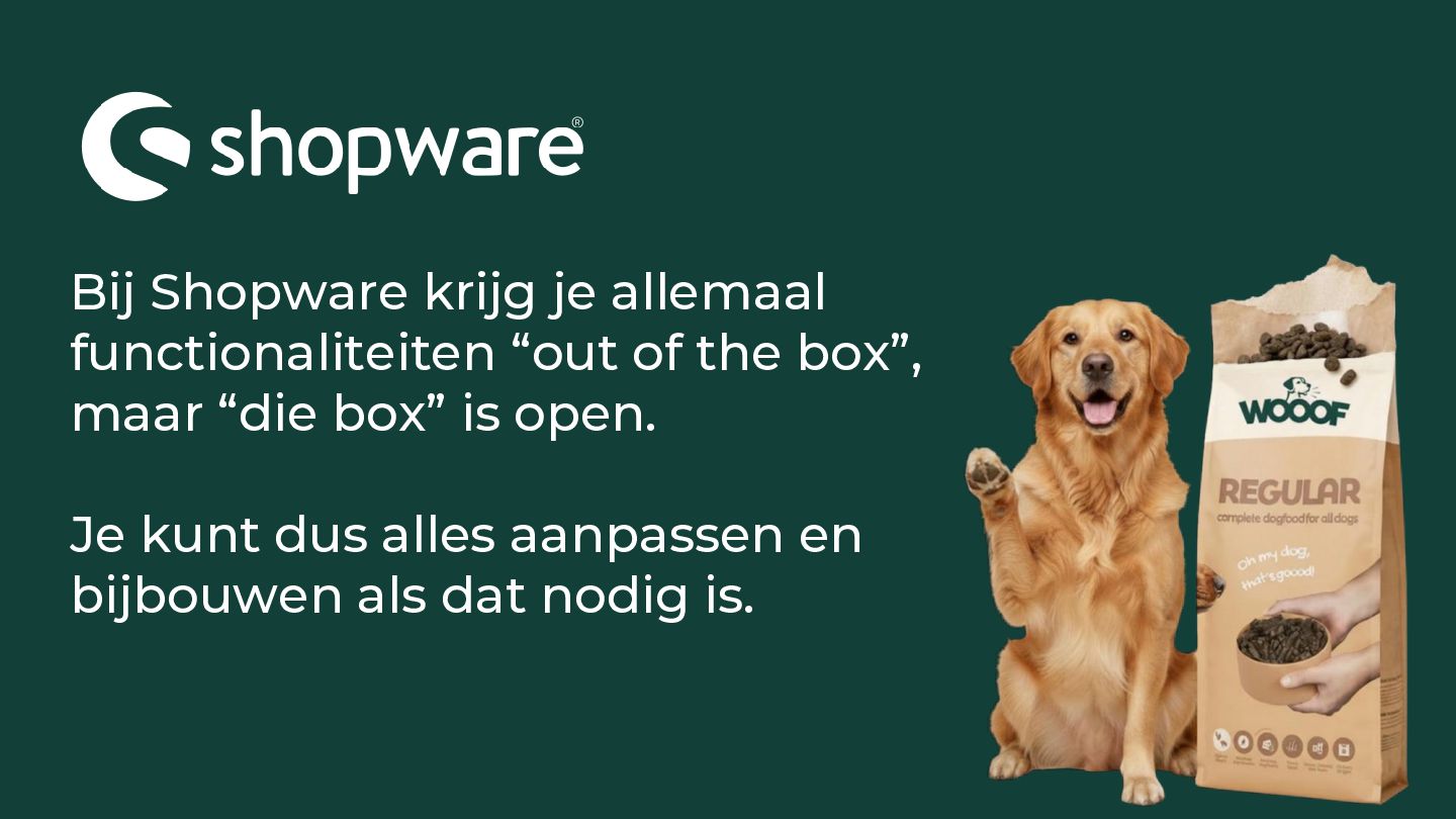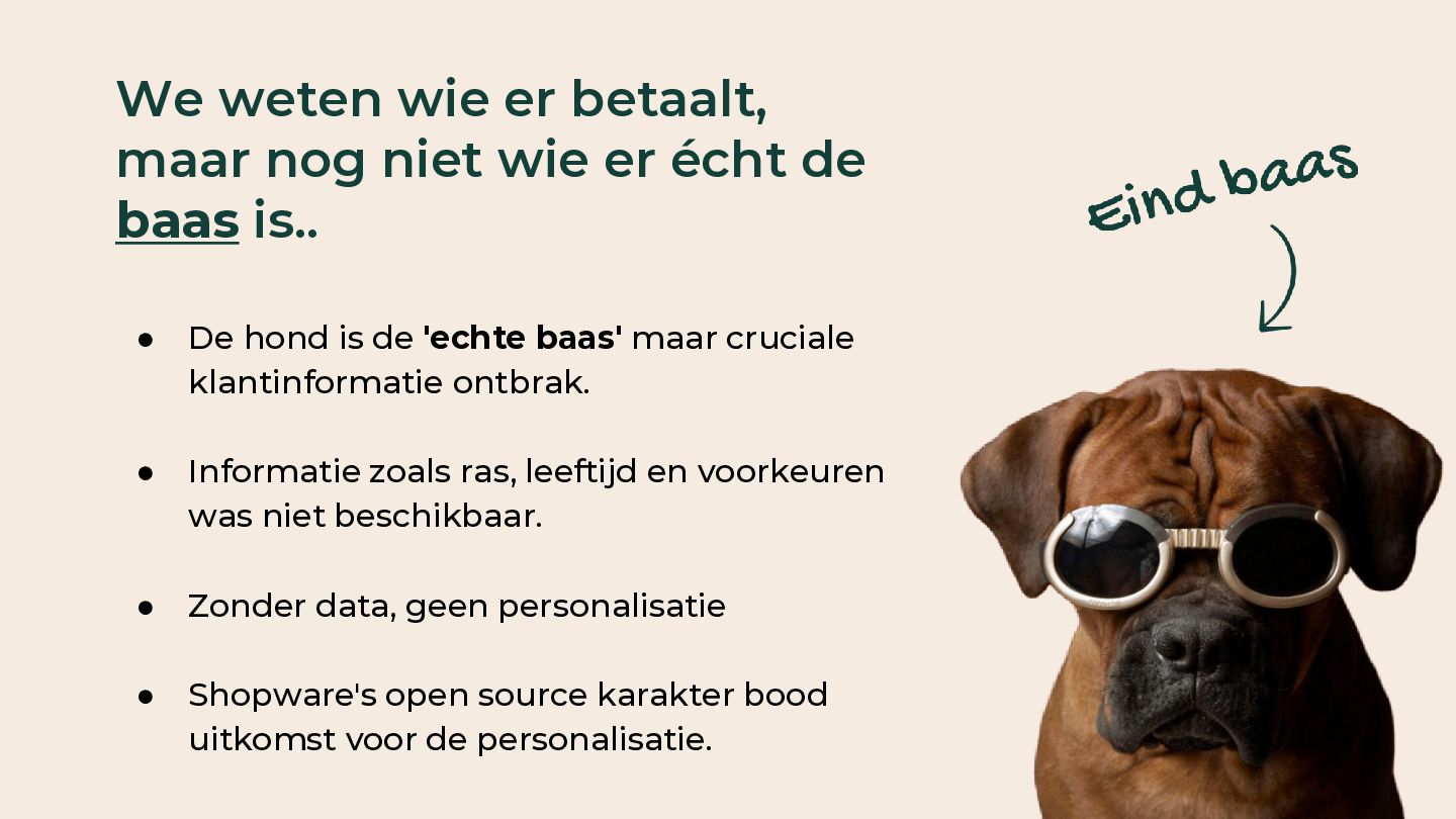 écht de baas is.. • De hond is de 'echte baas' maar cruciale klantinformatie ontbrak. • Informatie zoals ras, leeftijd en voorkeuren was niet beschikbaar. • Zonder data, geen personalisatie • Shopware's open source karakter bood uitkomst voor de personalisatie.