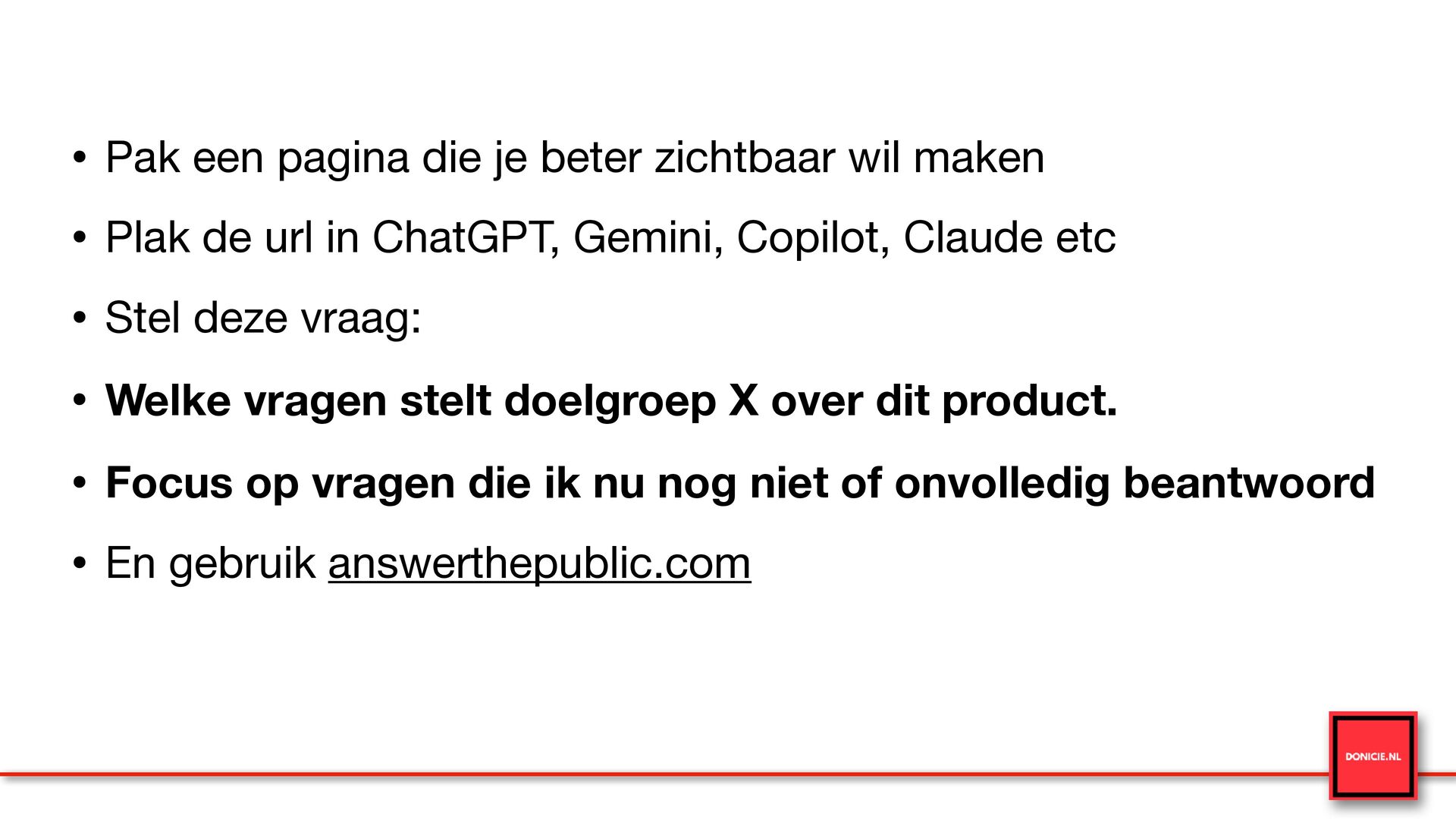 • Plak de url in ChatGPT, Gemini, Copilot, Claude etc • Stel deze vraag: • Welke vragen stelt doelgroep X over dit product. • Focus op vragen die ik nu nog niet of onvolledig beantwoord • En gebruik answerthepublic.com