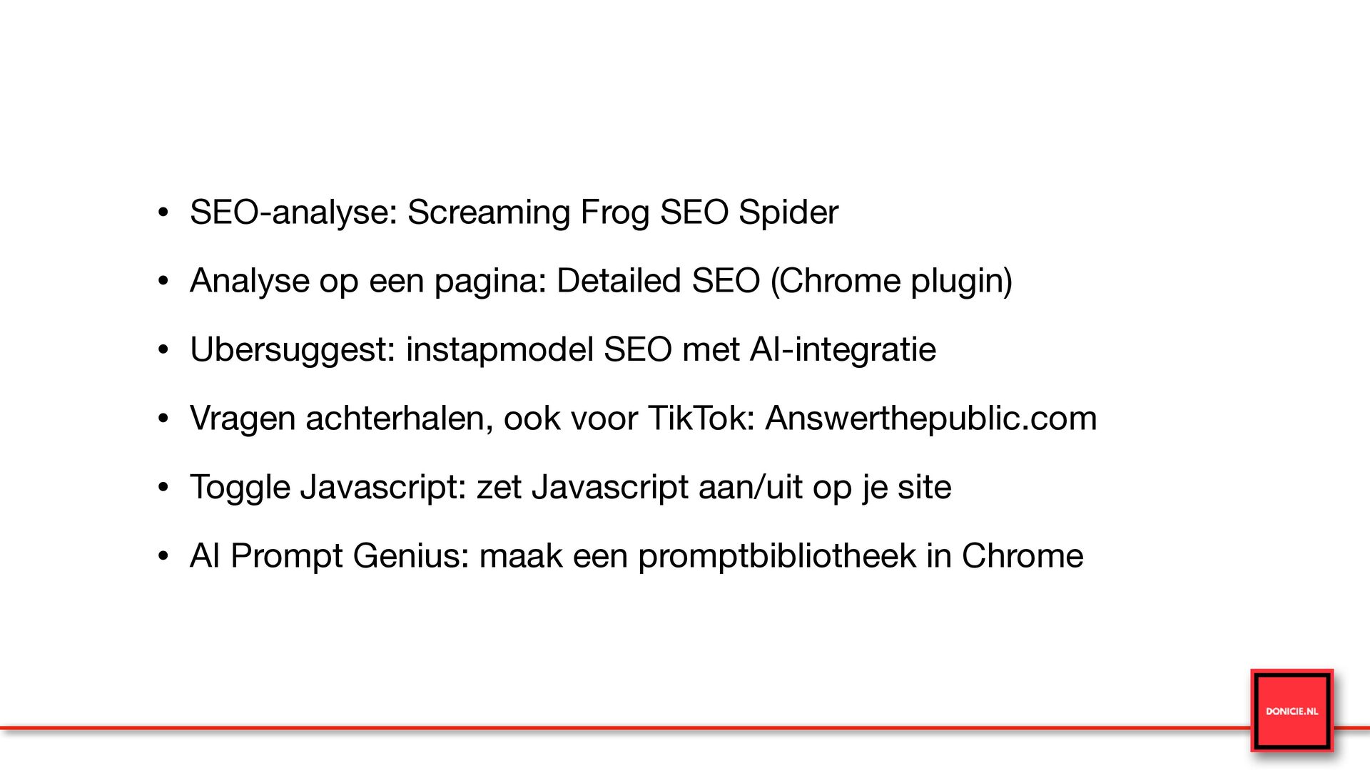 pagina: Detailed SEO (Chrome plugin) • Ubersuggest: instapmodel SEO met AI-integratie • Vragen achterhalen, ook voor TikTok: Answerthepublic.com • Toggle Javascript: zet Javascript aan/uit op je site • AI Prompt Genius: maak een promptbibliotheek in Chrome