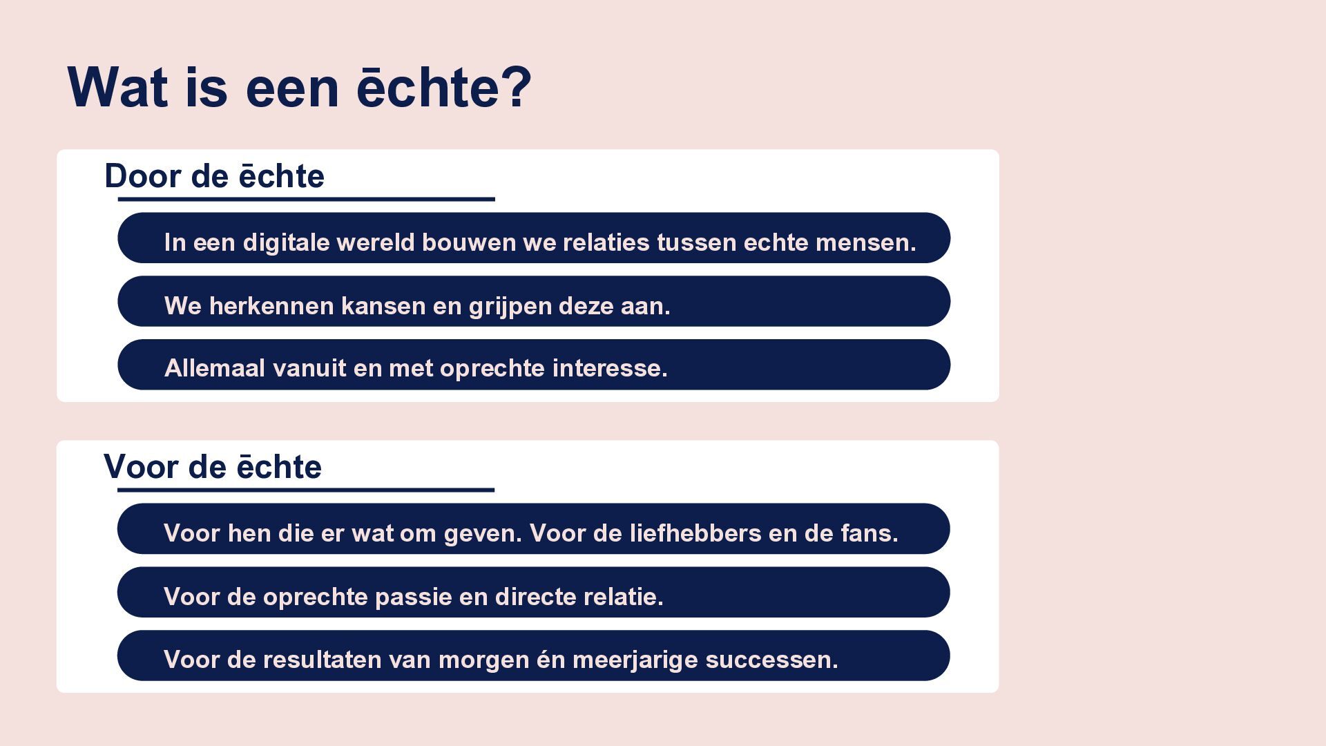 en grijpen deze aan. Allemaal vanuit en met oprechte interesse. In een digitale wereld bouwen we relaties tussen echte mensen. Voor de ēchte Voor de oprechte passie en directe relatie. Voor de resultaten van morgen én meerjarige successen. Voor hen die er wat om geven. Voor de liefhebbers en de fans.