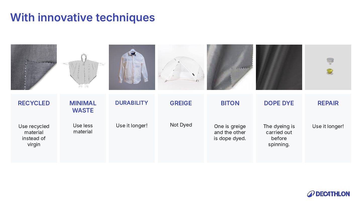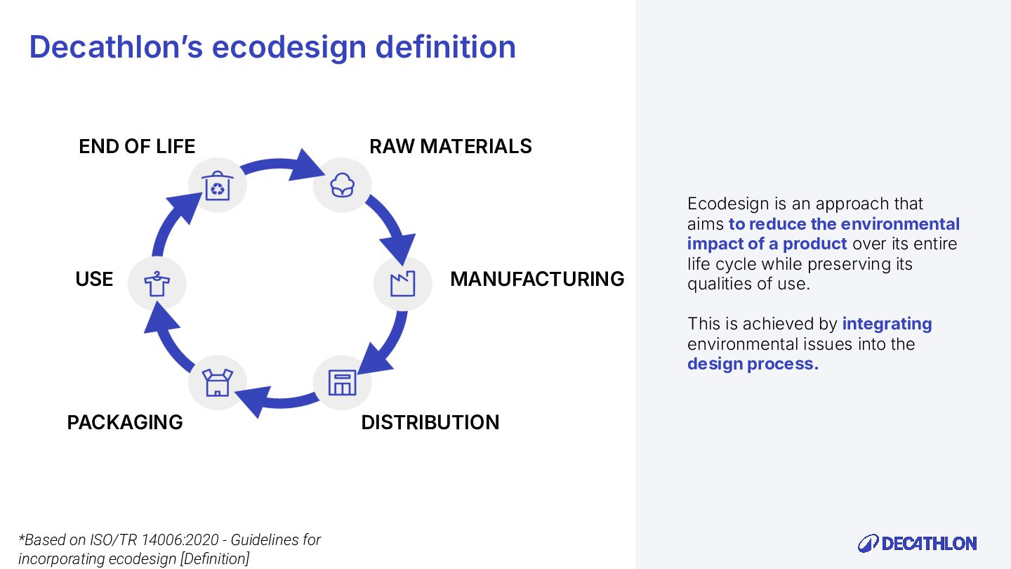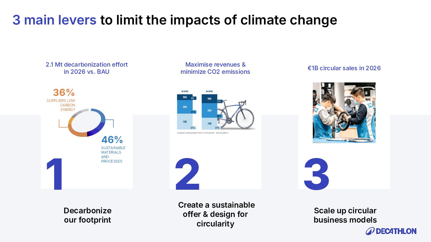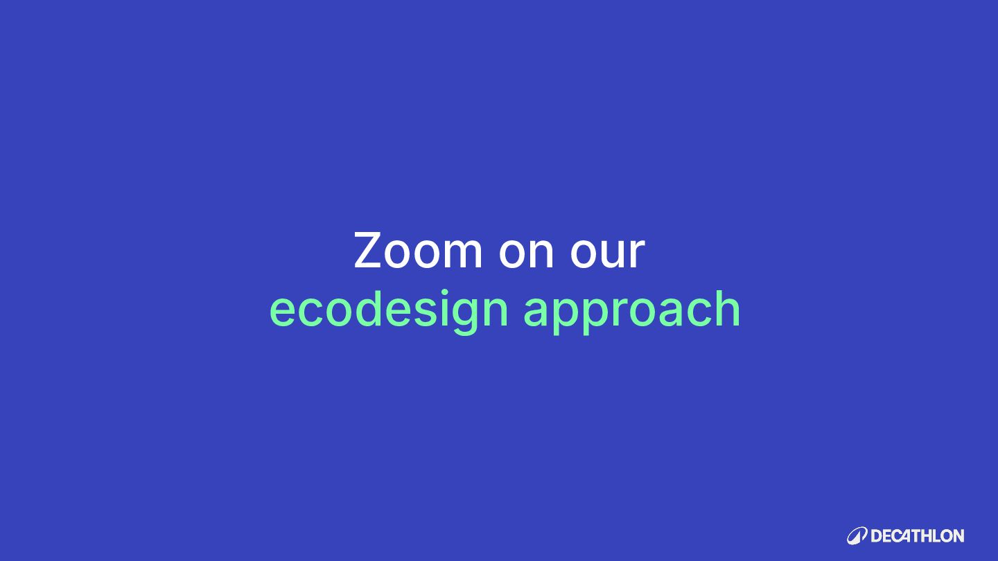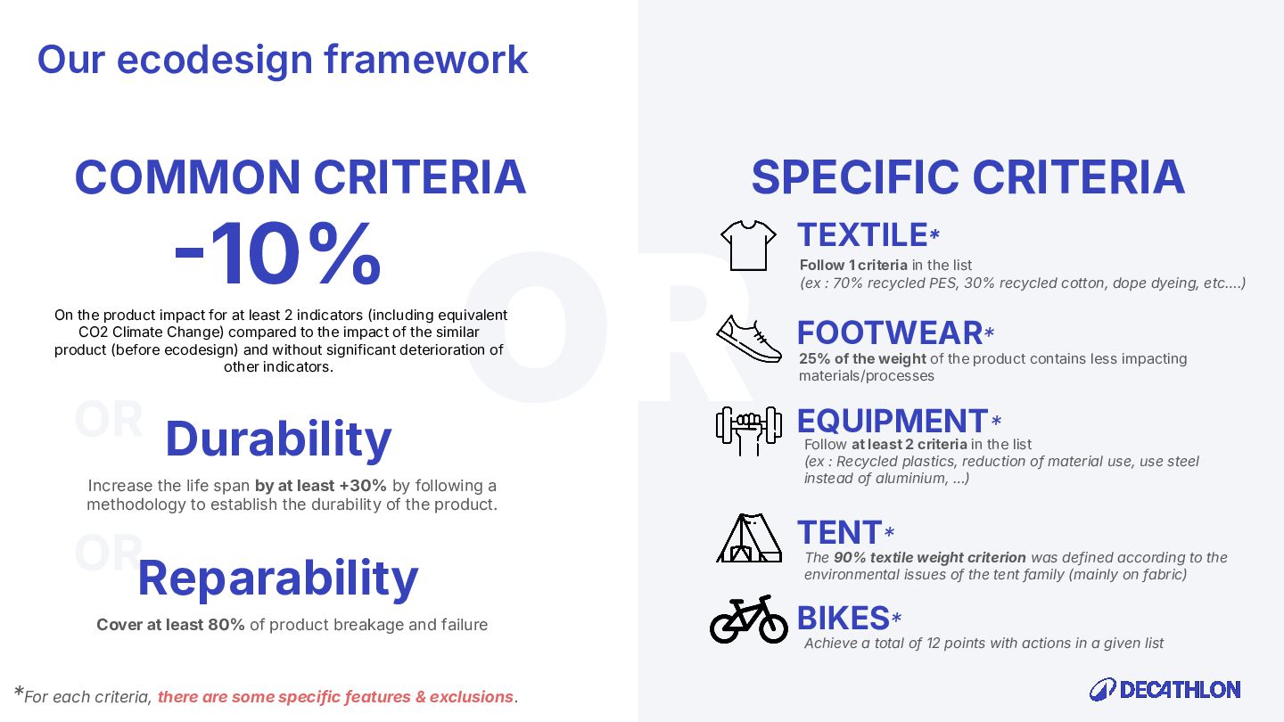 (including equivalent CO2 Climate Change) compared to the impact of the similar product (before ecodesign) and without significant deterioration of other indicators. 10% SPECIFIC CRITERIA TEXTILE* EQUIPMENT* FOOTWEAR* Follow 1 criteria in the list (ex : 70% recycled PES, 30% recycled cotton, dope dyeing, etc….) 25% of the weight of the product contains less impacting materials/processes Follow at least 2 criteria in the list (ex : Recycled plastics, reduction of material use, use steel instead of aluminium, …) COMMON CRITERIA Increase the life span by at least 30% by following a methodology to establish the durability of the product. Cover at least 80% of product breakage and failure OR OR The 90% textile weight criterion was defined according to the environmental issues of the tent family (mainly on fabric) TENT* *For each criteria, there are some specific features & exclusions. Achieve a total of 12 points with actions in a given list BIKES* Our ecodesign framework Durability Reparability