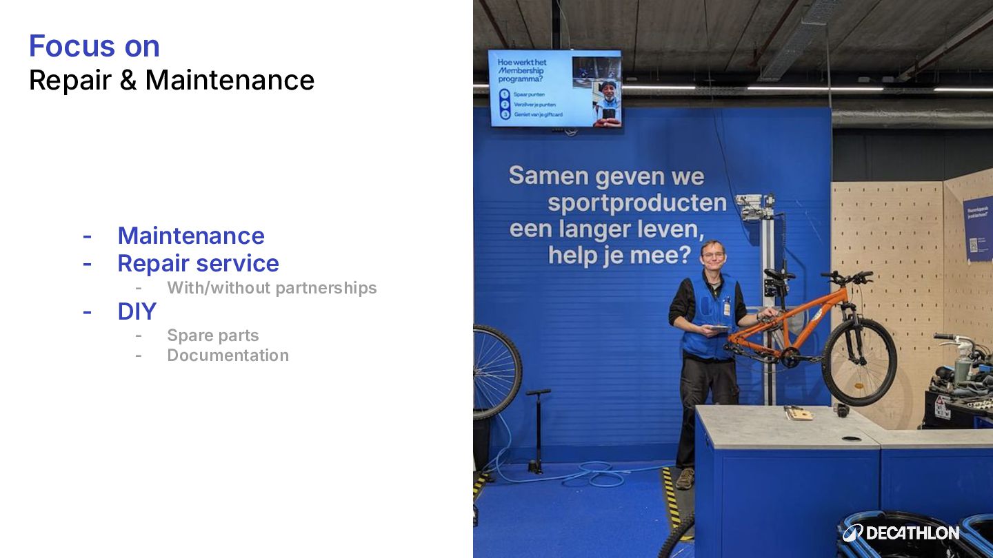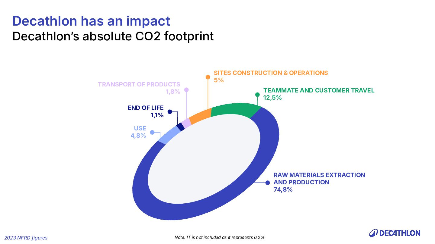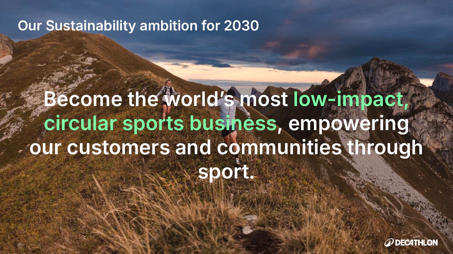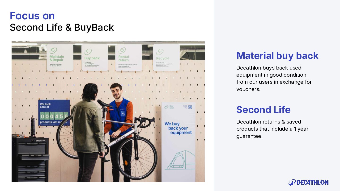 (including equivalent CO2 Climate Change) compared to the impact of the similar product (before ecodesign) and without significant deterioration of other indicators. 10% SPECIFIC CRITERIA TEXTILE* EQUIPMENT* FOOTWEAR* Follow 1 criteria in the list (ex : 70% recycled PES, 30% recycled cotton, dope dyeing, etc….) 25% of the weight of the product contains less impacting materials/processes Follow at least 2 criteria in the list (ex : Recycled plastics, reduction of material use, use steel instead of aluminium, …) COMMON CRITERIA Increase the life span by at least 30% by following a methodology to establish the durability of the product. Cover at least 80% of product breakage and failure OR OR The 90% textile weight criterion was defined according to the environmental issues of the tent family (mainly on fabric) TENT* *For each criteria, there are some specific features & exclusions. Achieve a total of 12 points with actions in a given list BIKES* Our ecodesign framework Durability Reparability