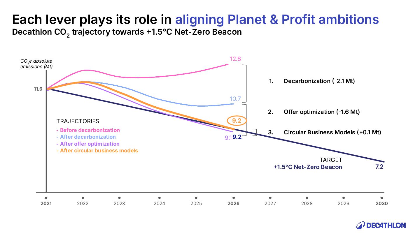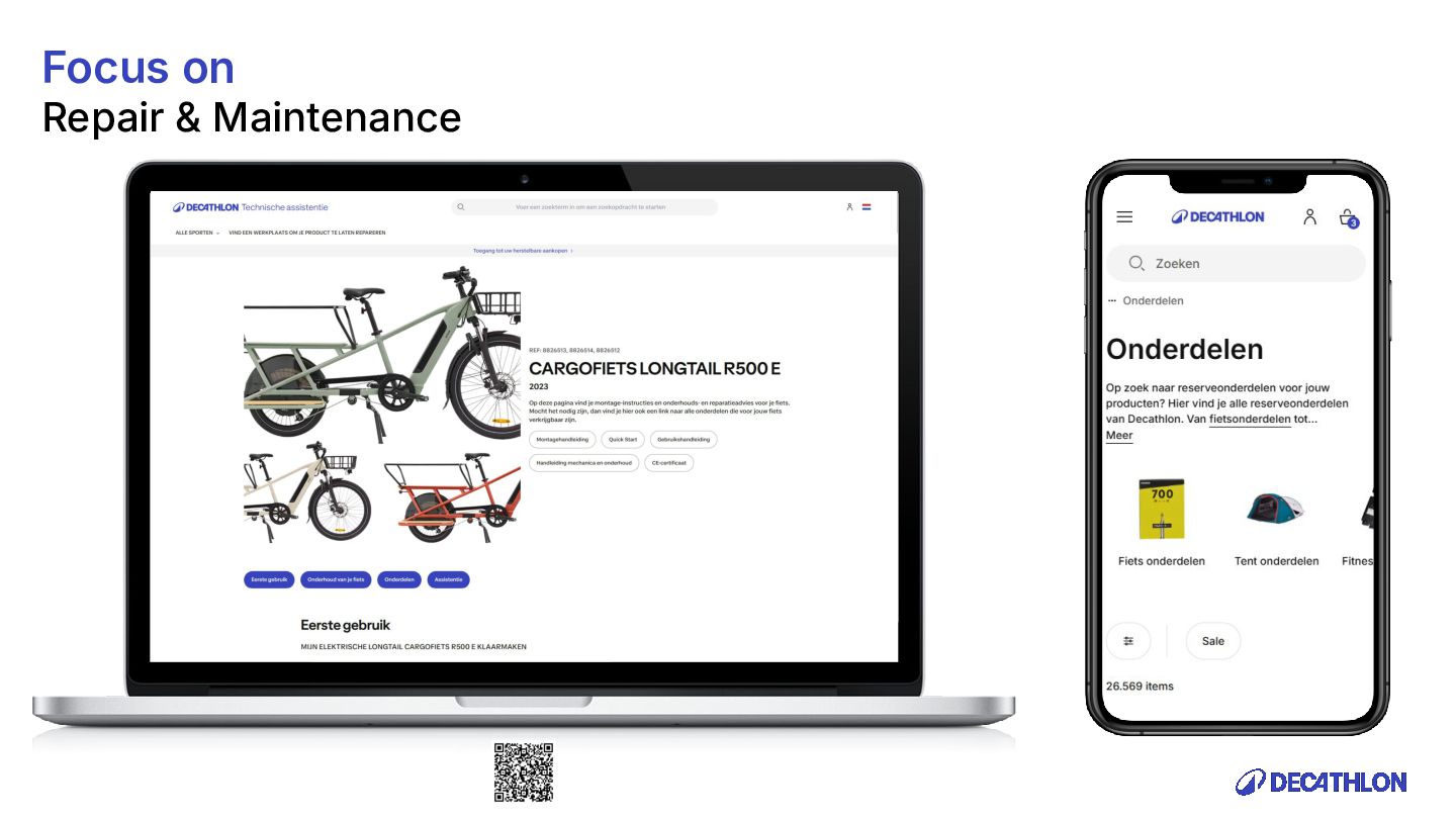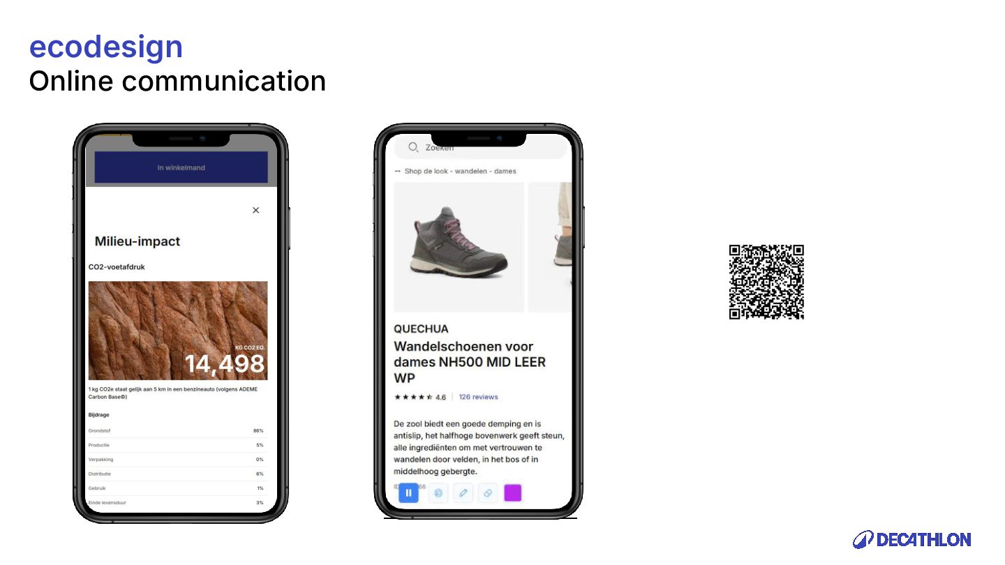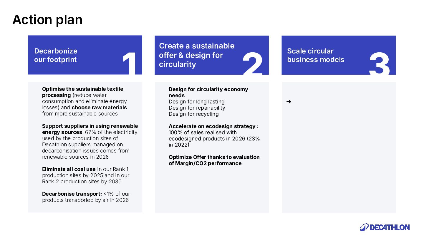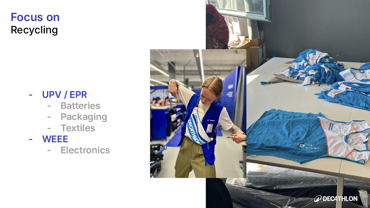 (including equivalent CO2 Climate Change) compared to the impact of the similar product (before ecodesign) and without significant deterioration of other indicators. 10% SPECIFIC CRITERIA TEXTILE* EQUIPMENT* FOOTWEAR* Follow 1 criteria in the list (ex : 70% recycled PES, 30% recycled cotton, dope dyeing, etc….) 25% of the weight of the product contains less impacting materials/processes Follow at least 2 criteria in the list (ex : Recycled plastics, reduction of material use, use steel instead of aluminium, …) COMMON CRITERIA Increase the life span by at least 30% by following a methodology to establish the durability of the product. Cover at least 80% of product breakage and failure OR OR The 90% textile weight criterion was defined according to the environmental issues of the tent family (mainly on fabric) TENT* *For each criteria, there are some specific features & exclusions. Achieve a total of 12 points with actions in a given list BIKES* Our ecodesign framework Durability Reparability