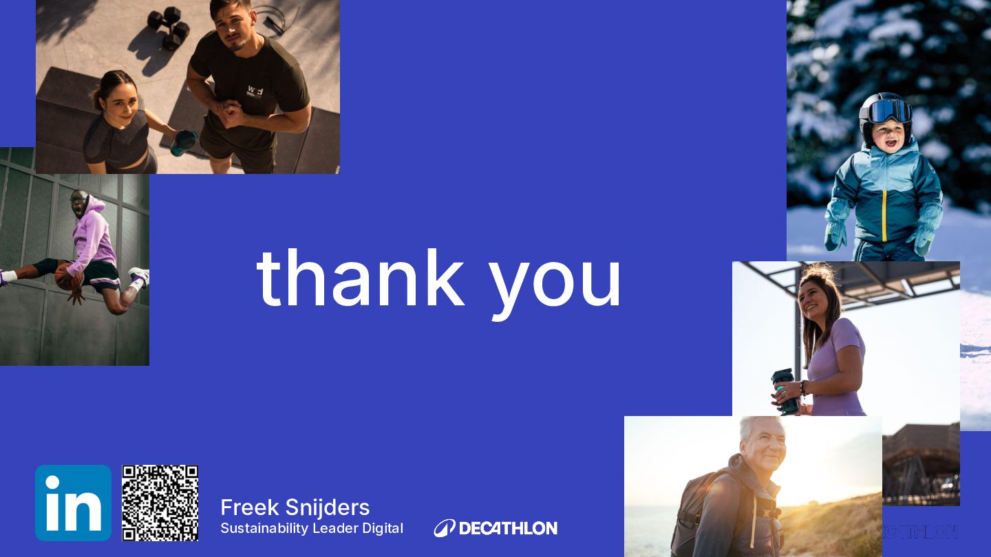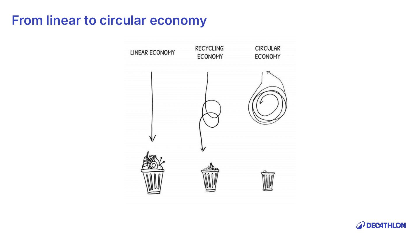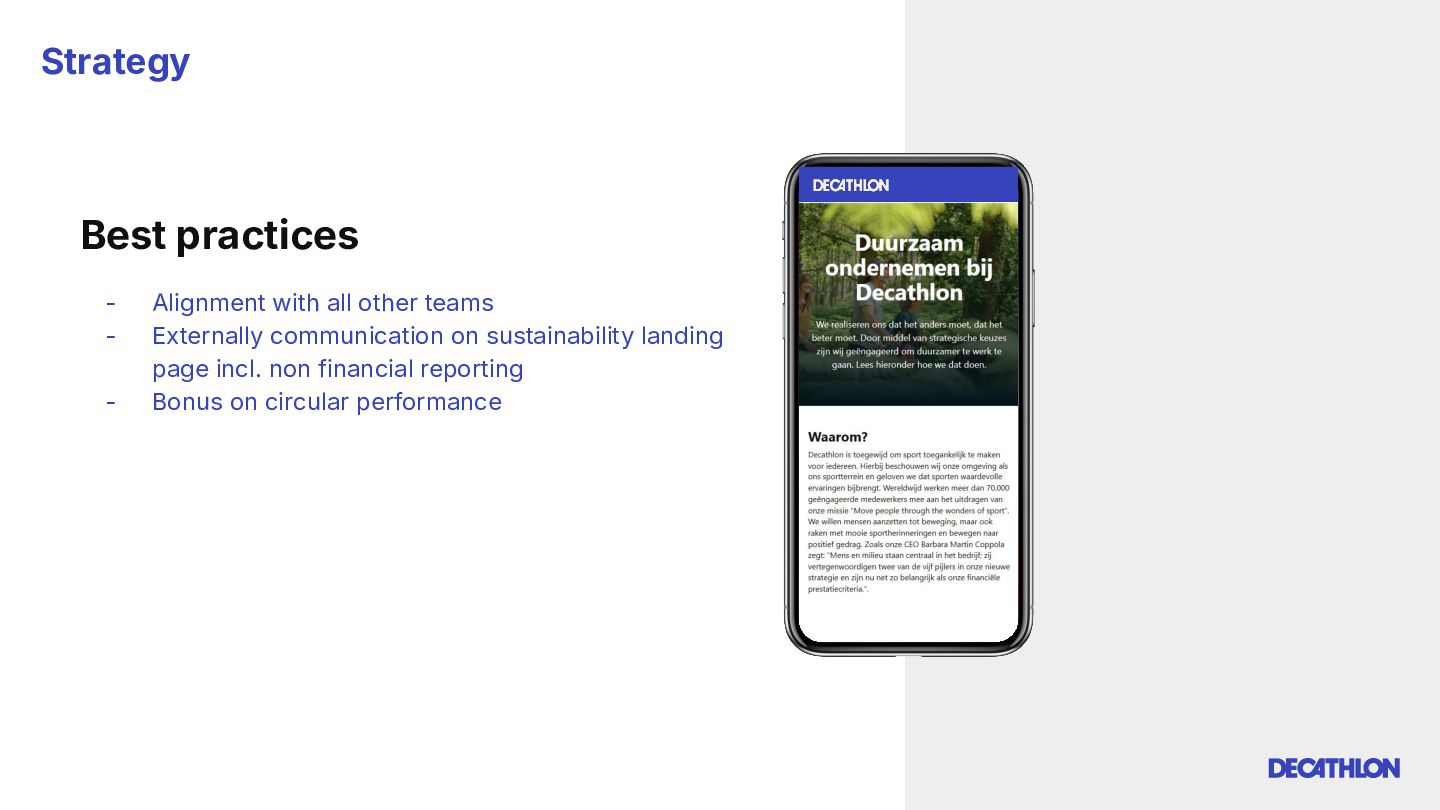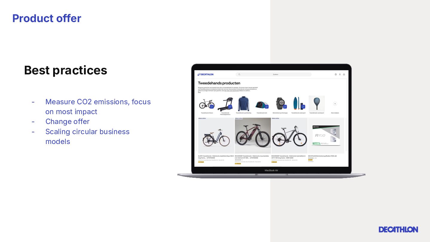 (including equivalent CO2 Climate Change) compared to the impact of the similar product (before ecodesign) and without significant deterioration of other indicators. 10% SPECIFIC CRITERIA TEXTILE* EQUIPMENT* FOOTWEAR* Follow 1 criteria in the list (ex : 70% recycled PES, 30% recycled cotton, dope dyeing, etc….) 25% of the weight of the product contains less impacting materials/processes Follow at least 2 criteria in the list (ex : Recycled plastics, reduction of material use, use steel instead of aluminium, …) COMMON CRITERIA Increase the life span by at least 30% by following a methodology to establish the durability of the product. Cover at least 80% of product breakage and failure OR OR The 90% textile weight criterion was defined according to the environmental issues of the tent family (mainly on fabric) TENT* *For each criteria, there are some specific features & exclusions. Achieve a total of 12 points with actions in a given list BIKES* Our ecodesign framework Durability Reparability