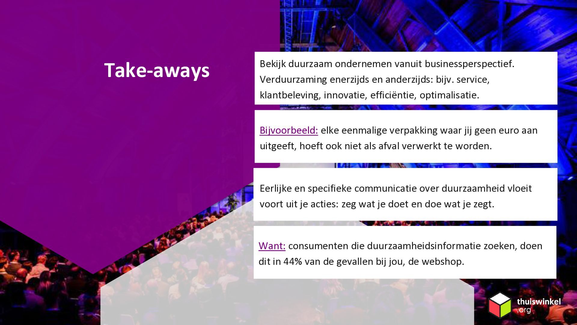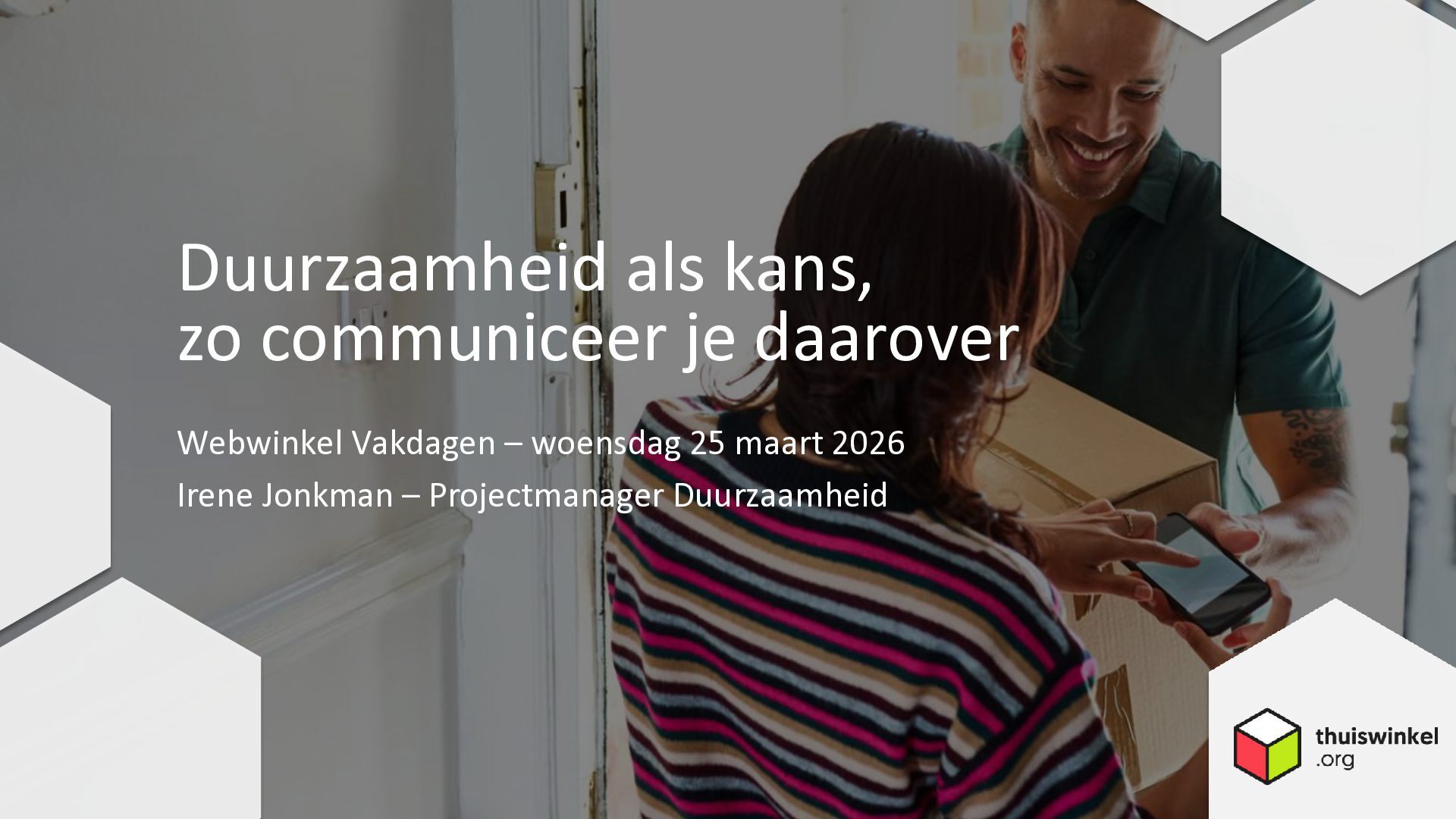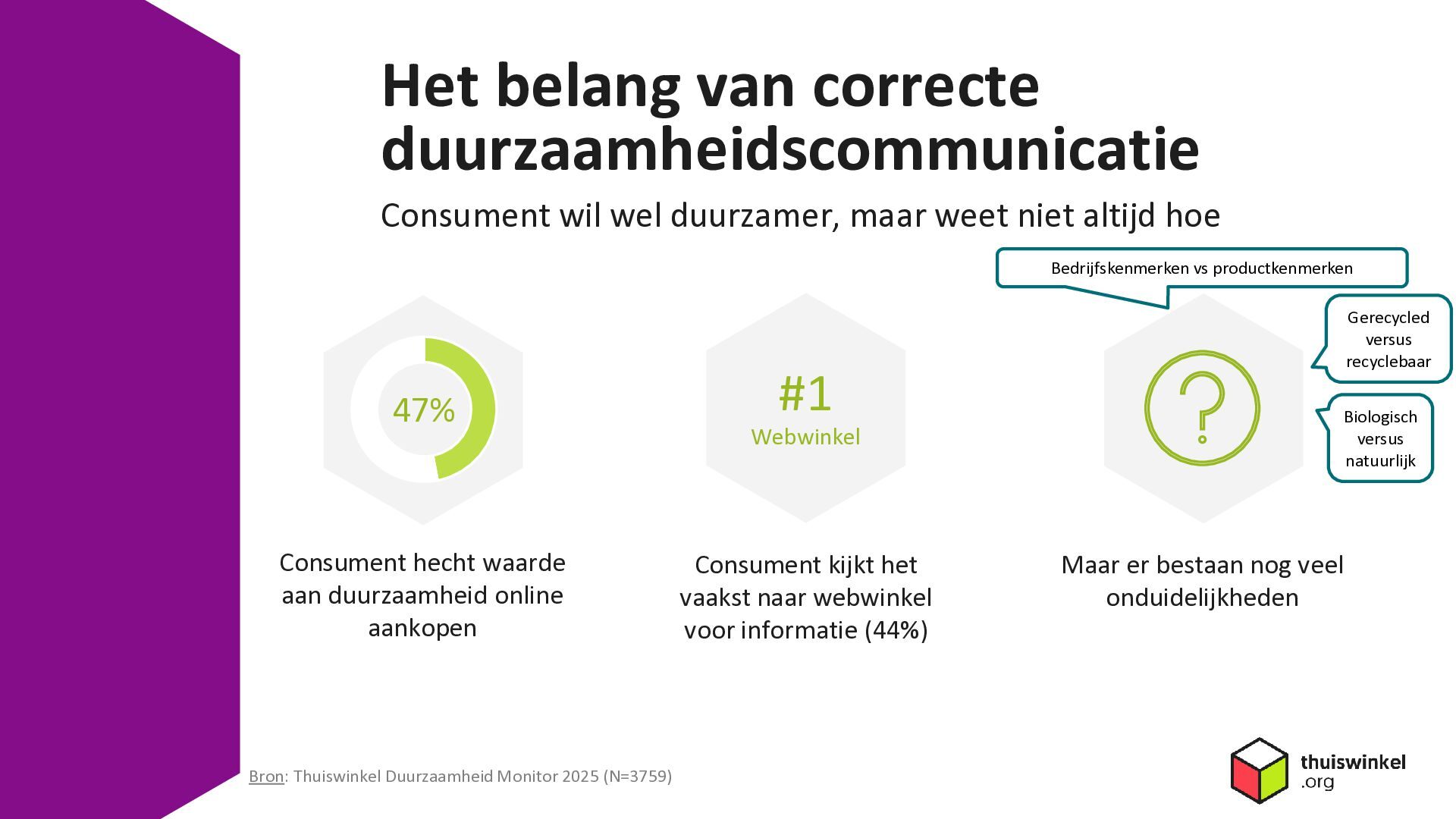 bijv. service, klantbeleving, innovatie, efficiëntie, optimalisatie. Bijvoorbeeld: elke eenmalige verpakking waar jij geen euro aan uitgeeft, hoeft ook niet als afval verwerkt te worden. Eerlijke en specifieke communicatie over duurzaamheid vloeit voort uit je acties: zeg wat je doet en doe wat je zegt. Want: consumenten die duurzaamheidsinformatie zoeken, doen dit in 44% van de gevallen bij jou, de webshop.