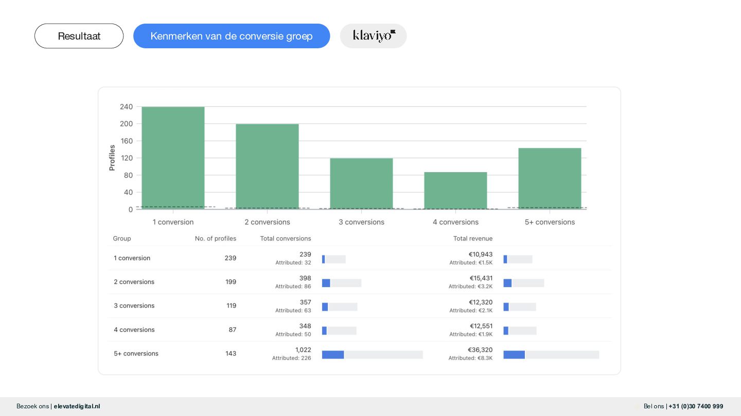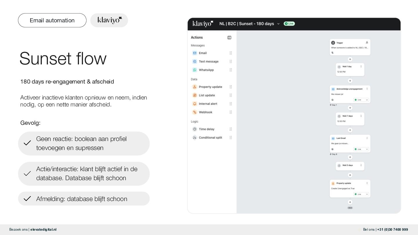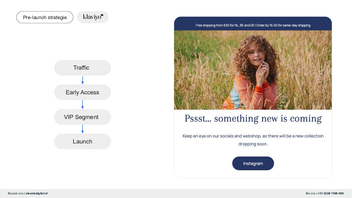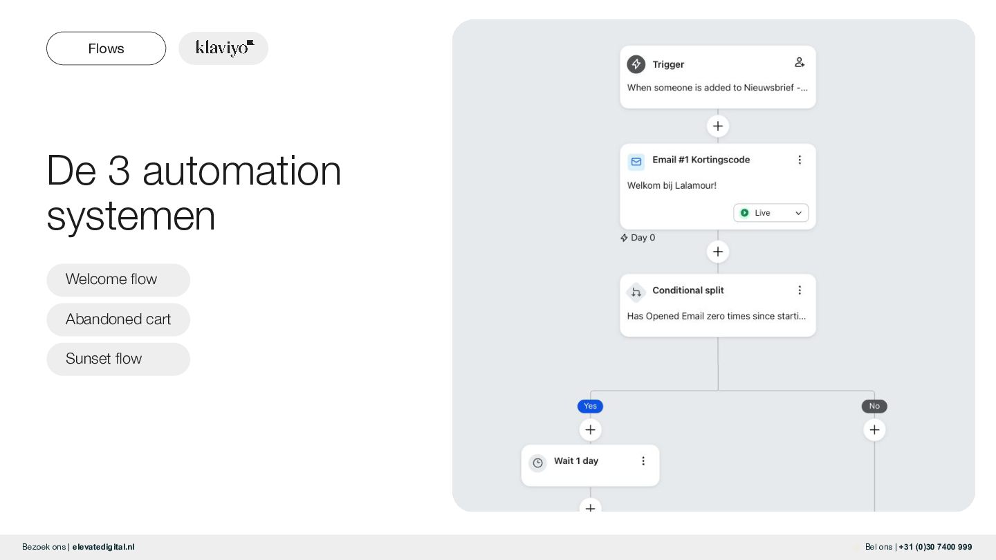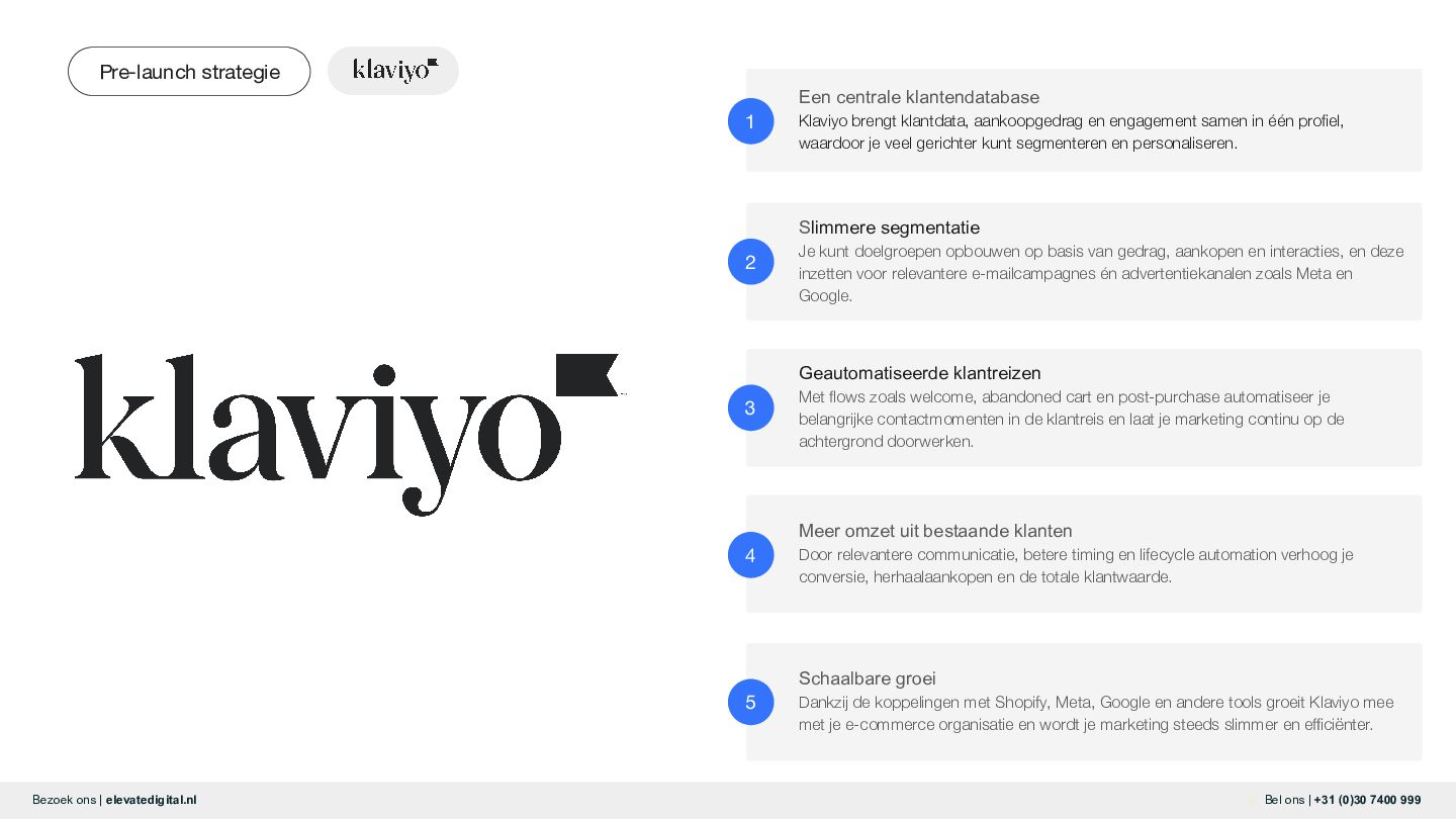 999 Een centrale klantendatabase Klaviyo brengt klantdata, aankoopgedrag en engagement samen in één profiel, waardoor je veel gerichter kunt segmenteren en personaliseren. 1 Slimmere segmentatie Je kunt doelgroepen opbouwen op basis van gedrag, aankopen en interacties, en deze inzetten voor relevantere e-mailcampagnes én advertentiekanalen zoals Meta en Google. 2 Geautomatiseerde klantreizen Met flows zoals welcome, abandoned cart en post-purchase automatiseer je belangrijke contactmomenten in de klantreis en laat je marketing continu op de achtergrond doorwerken. 3 Meer omzet uit bestaande klanten Door relevantere communicatie, betere timing en lifecycle automation verhoog je conversie, herhaalaankopen en de totale klantwaarde. 4 Schaalbare groei Dankzij de koppelingen met Shopify, Meta, Google en andere tools groeit Klaviyo mee met je e-commerce organisatie en wordt je marketing steeds slimmer en efficiënter. 5 Pre-launch strategie