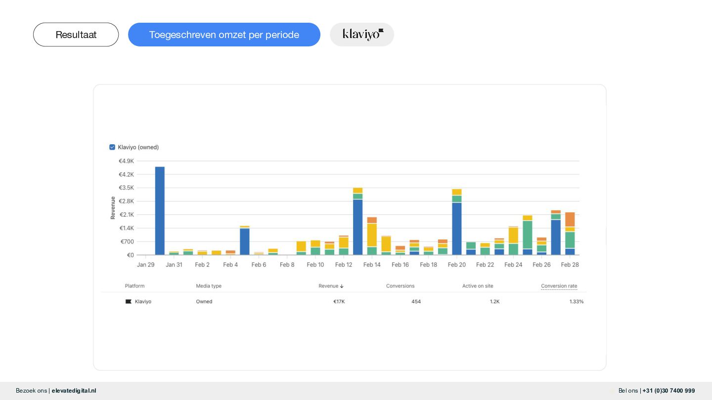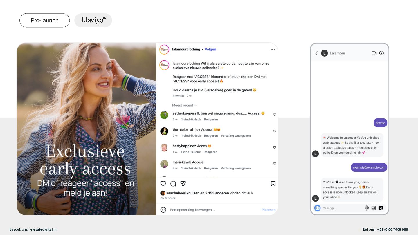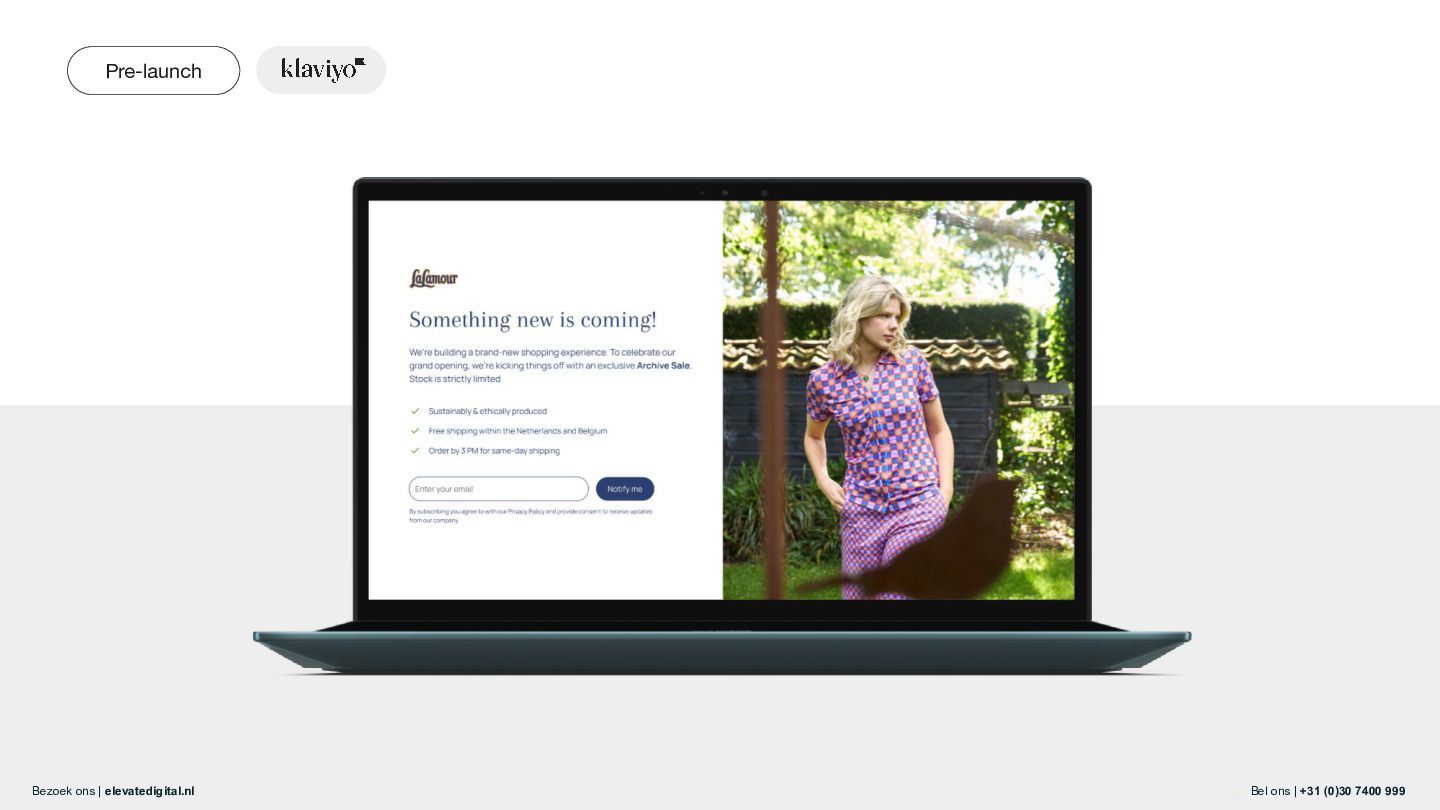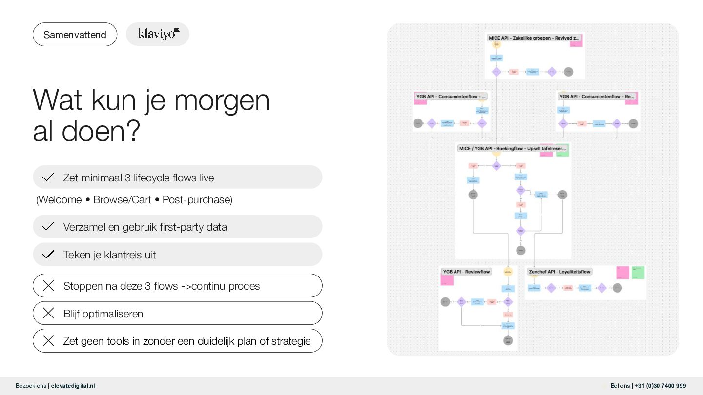 999 Een centrale klantendatabase Klaviyo brengt klantdata, aankoopgedrag en engagement samen in één profiel, waardoor je veel gerichter kunt segmenteren en personaliseren. 1 Slimmere segmentatie Je kunt doelgroepen opbouwen op basis van gedrag, aankopen en interacties, en deze inzetten voor relevantere e-mailcampagnes én advertentiekanalen zoals Meta en Google. 2 Geautomatiseerde klantreizen Met flows zoals welcome, abandoned cart en post-purchase automatiseer je belangrijke contactmomenten in de klantreis en laat je marketing continu op de achtergrond doorwerken. 3 Meer omzet uit bestaande klanten Door relevantere communicatie, betere timing en lifecycle automation verhoog je conversie, herhaalaankopen en de totale klantwaarde. 4 Schaalbare groei Dankzij de koppelingen met Shopify, Meta, Google en andere tools groeit Klaviyo mee met je e-commerce organisatie en wordt je marketing steeds slimmer en efficiënter. 5 Pre-launch strategie