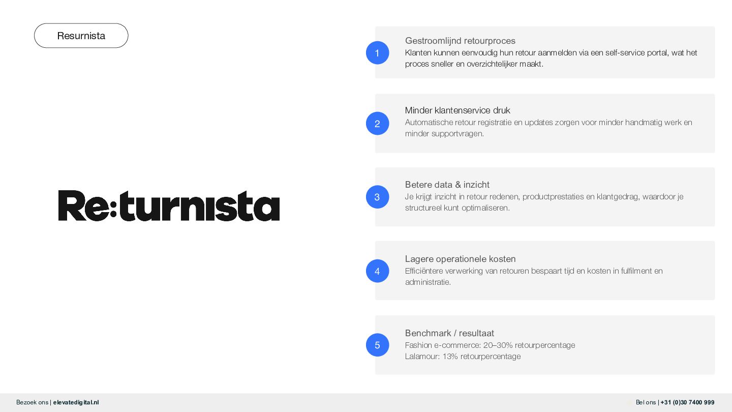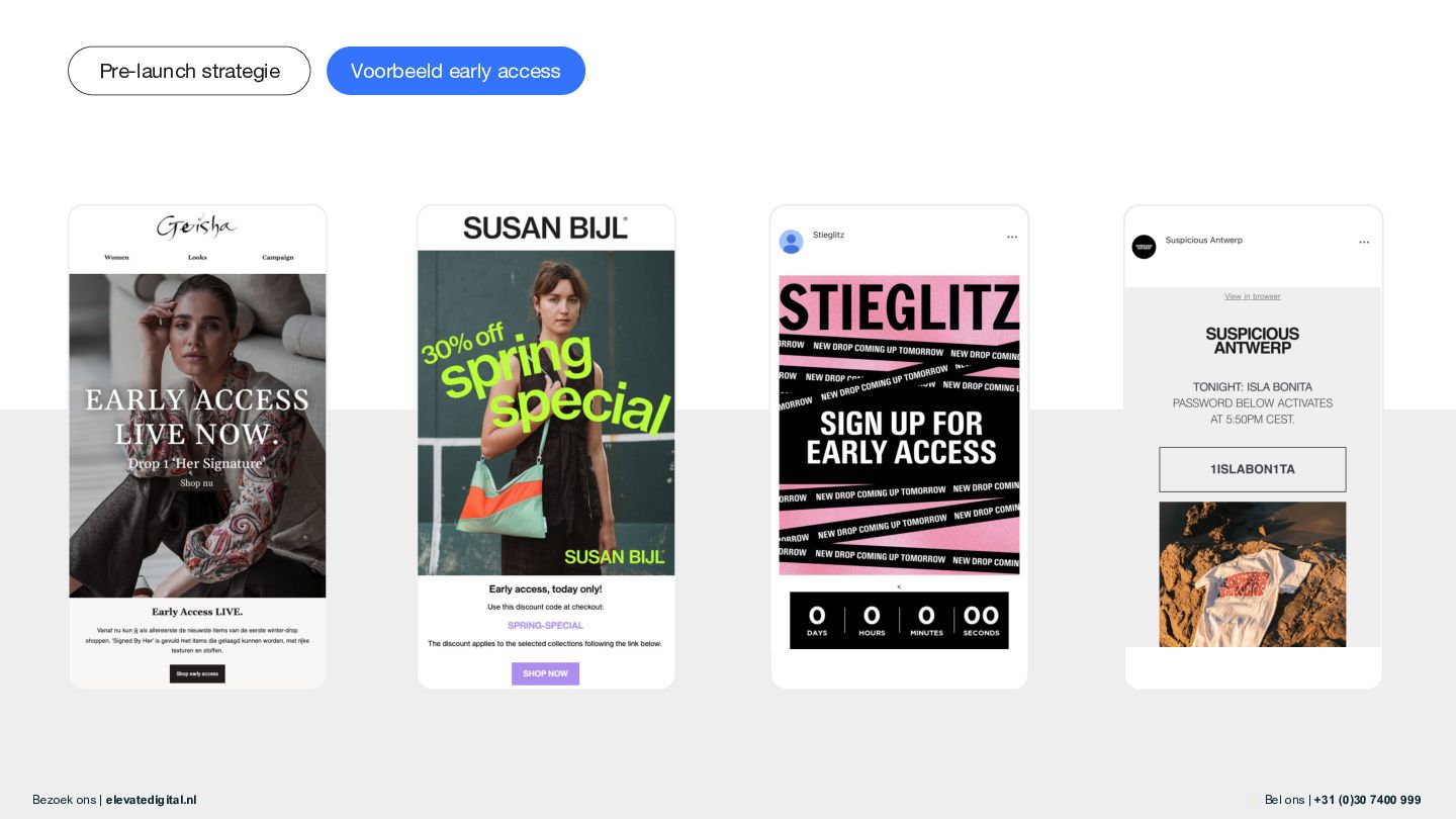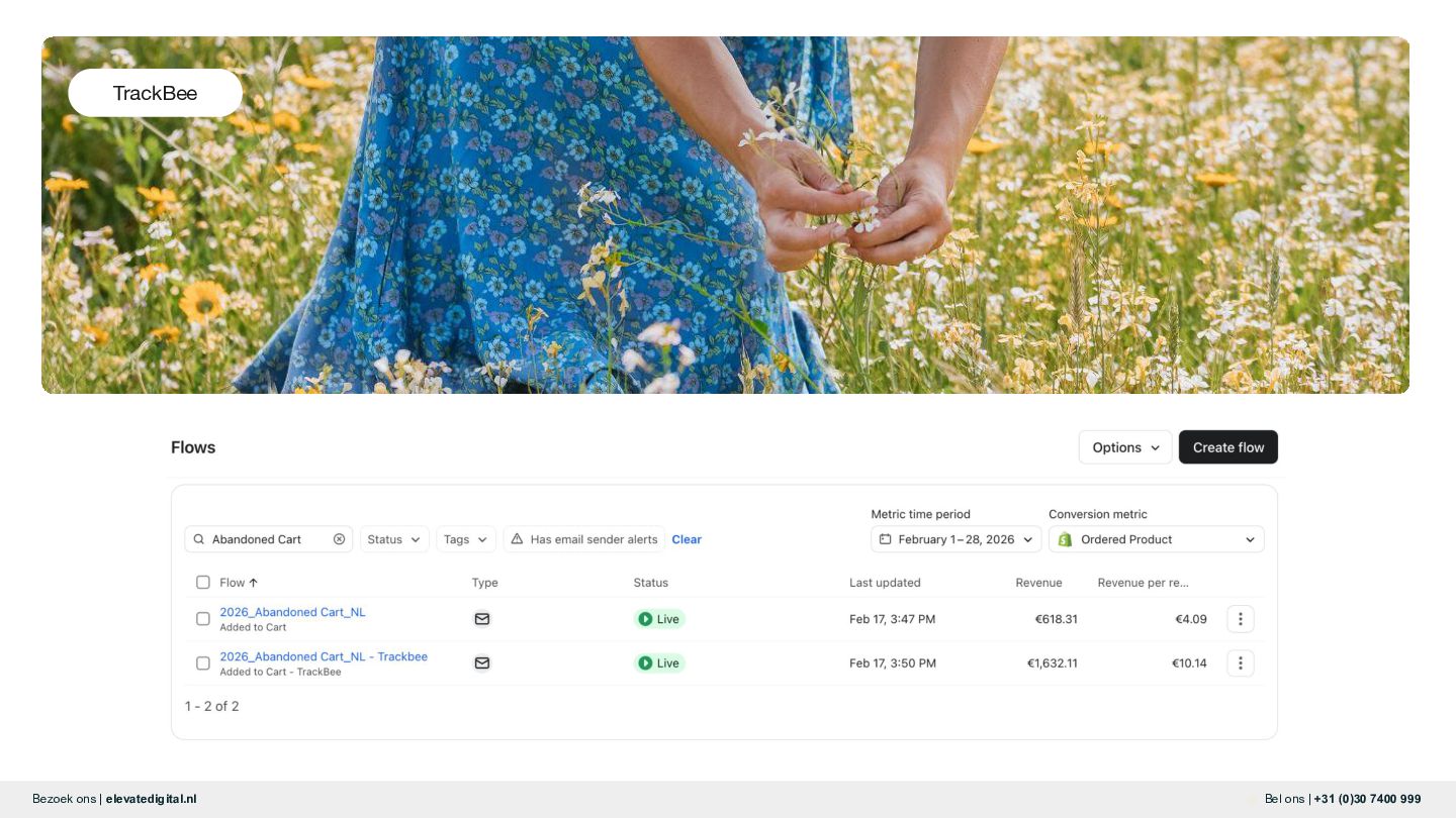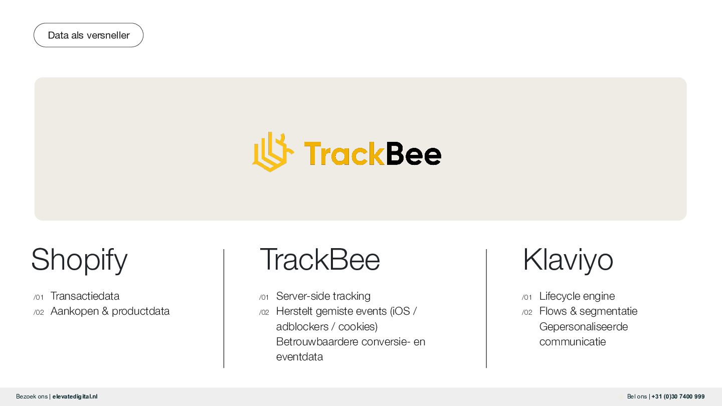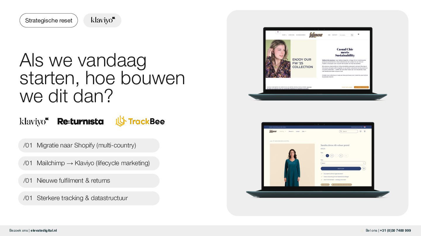 999 Een centrale klantendatabase Klaviyo brengt klantdata, aankoopgedrag en engagement samen in één profiel, waardoor je veel gerichter kunt segmenteren en personaliseren. 1 Slimmere segmentatie Je kunt doelgroepen opbouwen op basis van gedrag, aankopen en interacties, en deze inzetten voor relevantere e-mailcampagnes én advertentiekanalen zoals Meta en Google. 2 Geautomatiseerde klantreizen Met flows zoals welcome, abandoned cart en post-purchase automatiseer je belangrijke contactmomenten in de klantreis en laat je marketing continu op de achtergrond doorwerken. 3 Meer omzet uit bestaande klanten Door relevantere communicatie, betere timing en lifecycle automation verhoog je conversie, herhaalaankopen en de totale klantwaarde. 4 Schaalbare groei Dankzij de koppelingen met Shopify, Meta, Google en andere tools groeit Klaviyo mee met je e-commerce organisatie en wordt je marketing steeds slimmer en efficiënter. 5 Pre-launch strategie
