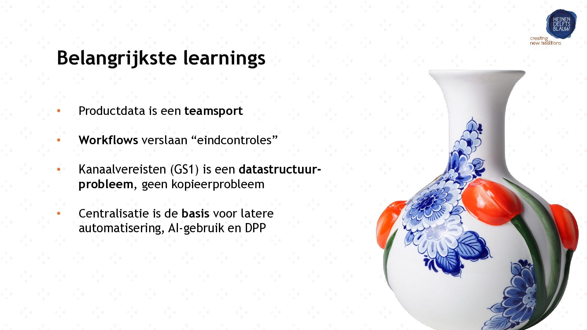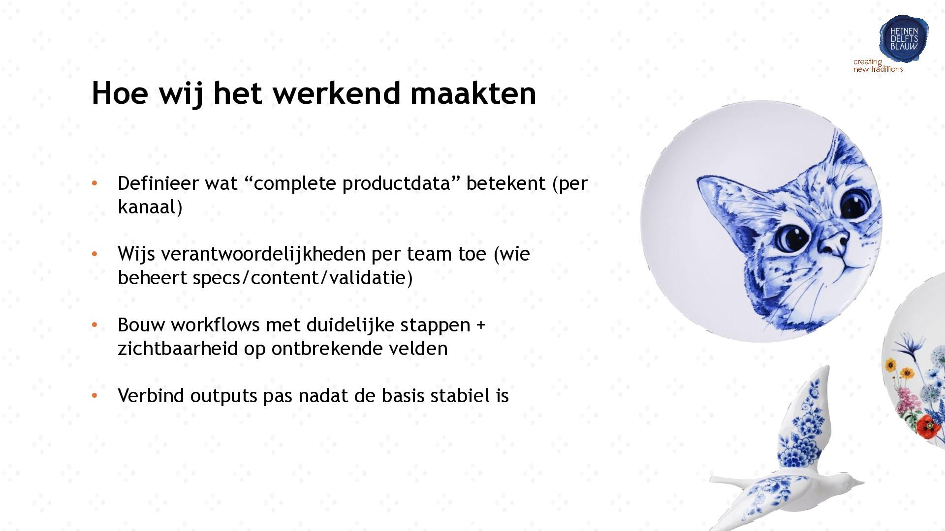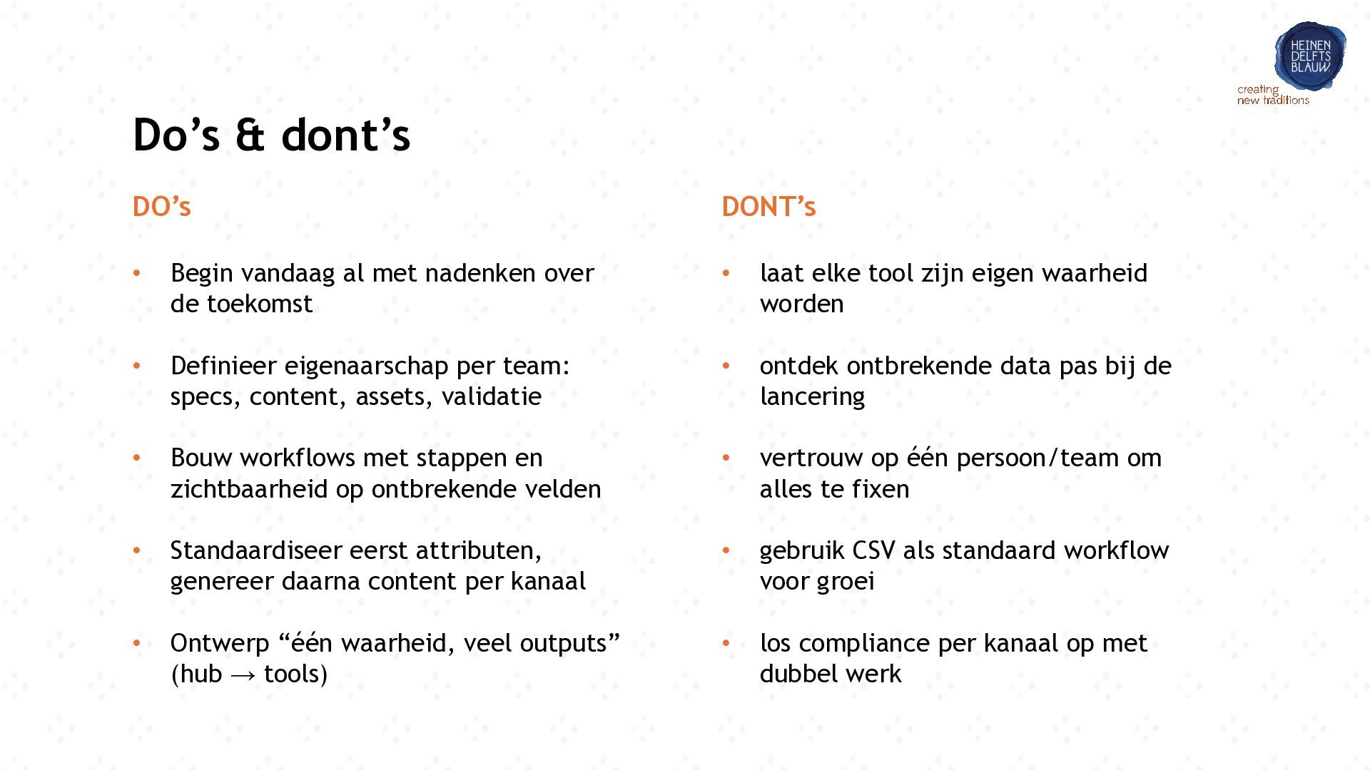 over de toekomst • Definieer eigenaarschap per team: specs, content, assets, validatie • Bouw workflows met stappen en zichtbaarheid op ontbrekende velden • Standaardiseer eerst attributen, genereer daarna content per kanaal • Ontwerp “één waarheid, veel outputs” (hub → tools) DONT’s • laat elke tool zijn eigen waarheid worden • ontdek ontbrekende data pas bij de lancering • vertrouw op één persoon/team om alles te fixen • gebruik CSV als standaard workflow voor groei • los compliance per kanaal op met dubbel werk