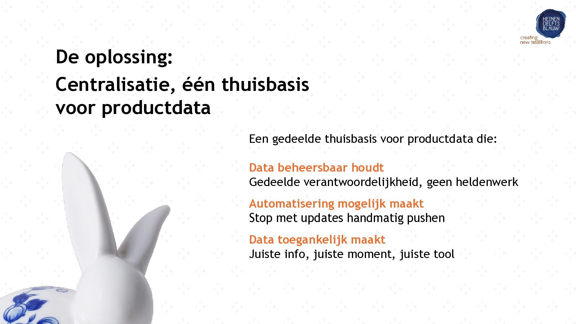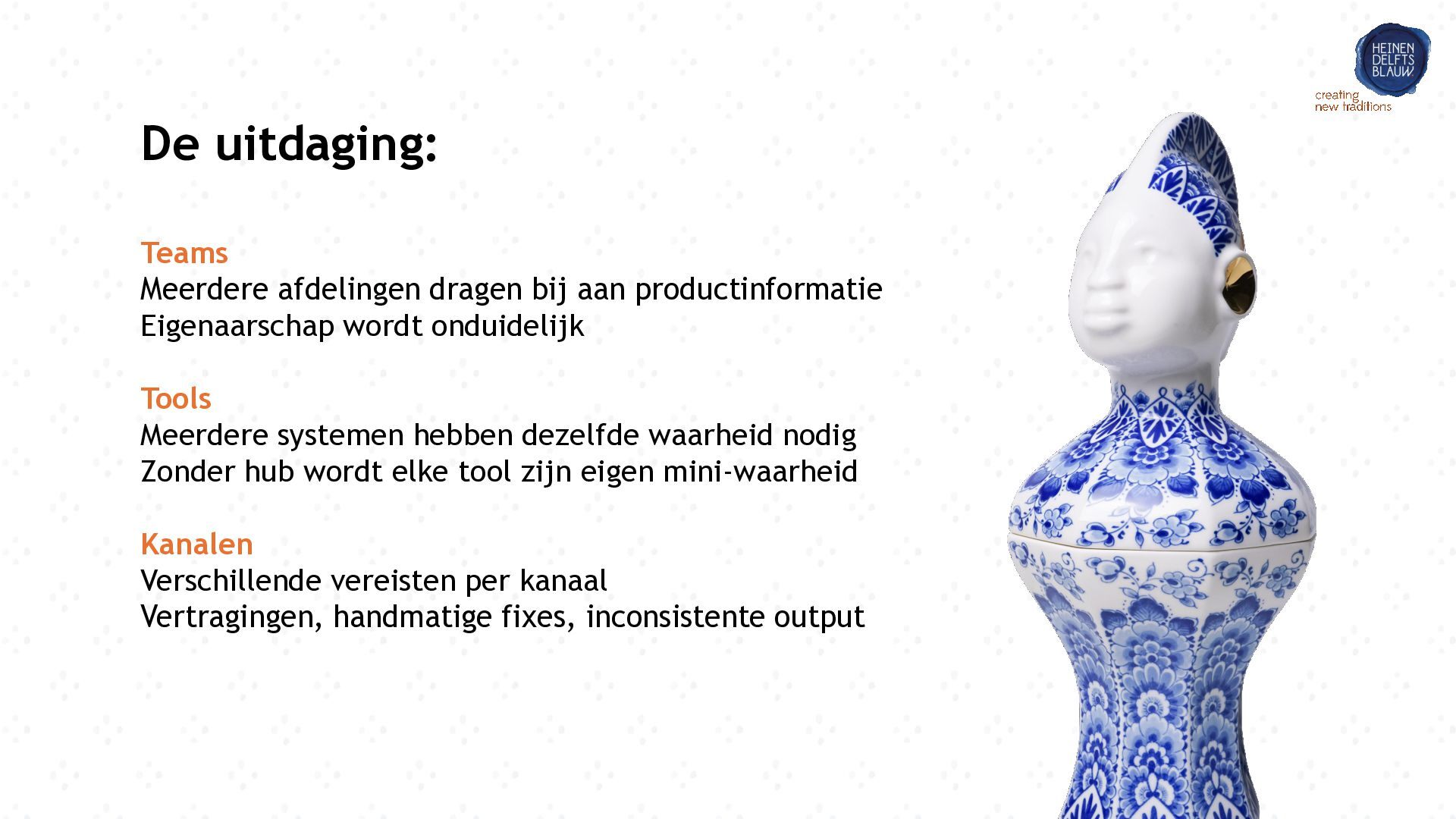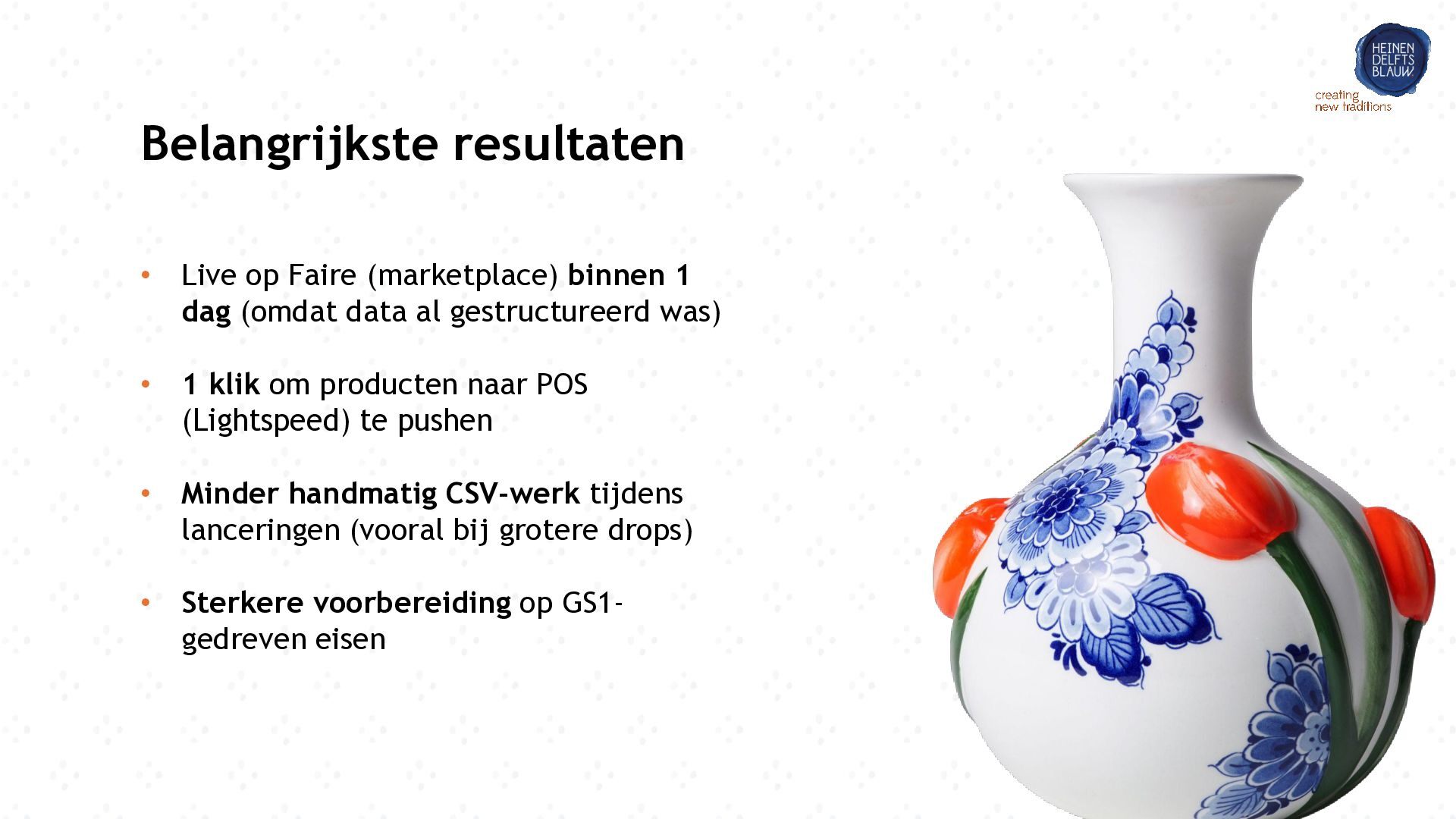 over de toekomst • Definieer eigenaarschap per team: specs, content, assets, validatie • Bouw workflows met stappen en zichtbaarheid op ontbrekende velden • Standaardiseer eerst attributen, genereer daarna content per kanaal • Ontwerp “één waarheid, veel outputs” (hub → tools) DONT’s • laat elke tool zijn eigen waarheid worden • ontdek ontbrekende data pas bij de lancering • vertrouw op één persoon/team om alles te fixen • gebruik CSV als standaard workflow voor groei • los compliance per kanaal op met dubbel werk