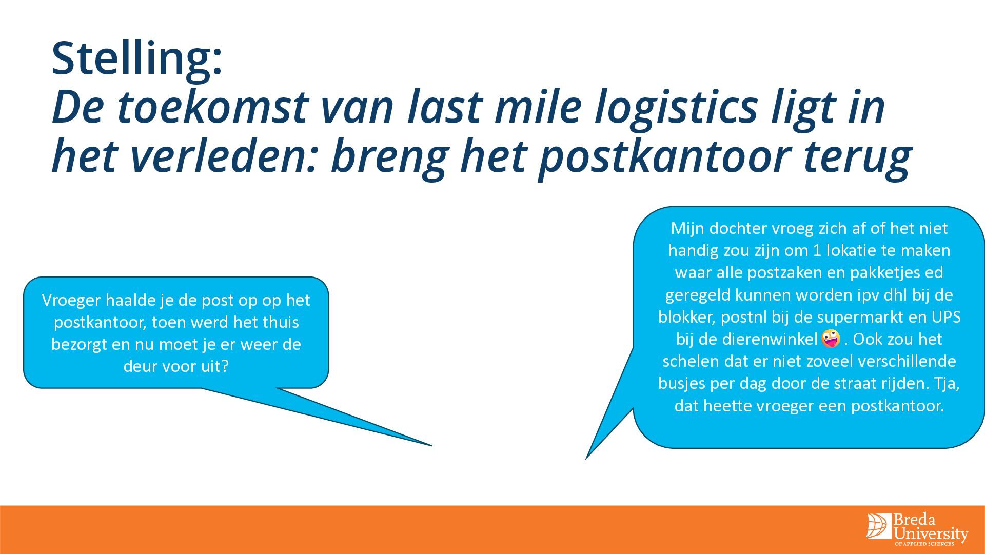 verleden: breng het postkantoor terug Vroeger haalde je de post op op het postkantoor, toen werd het thuis bezorgt en nu moet je er weer de deur voor uit? Mijn dochter vroeg zich af of het niet handig zou zijn om 1 lokatie te maken waar alle postzaken en pakketjes ed geregeld kunnen worden ipv dhl bij de blokker, postnl bij de supermarkt en UPS bij de dierenwinkel . Ook zou het schelen dat er niet zoveel verschillende busjes per dag door de straat rijden. Tja, dat heette vroeger een postkantoor.