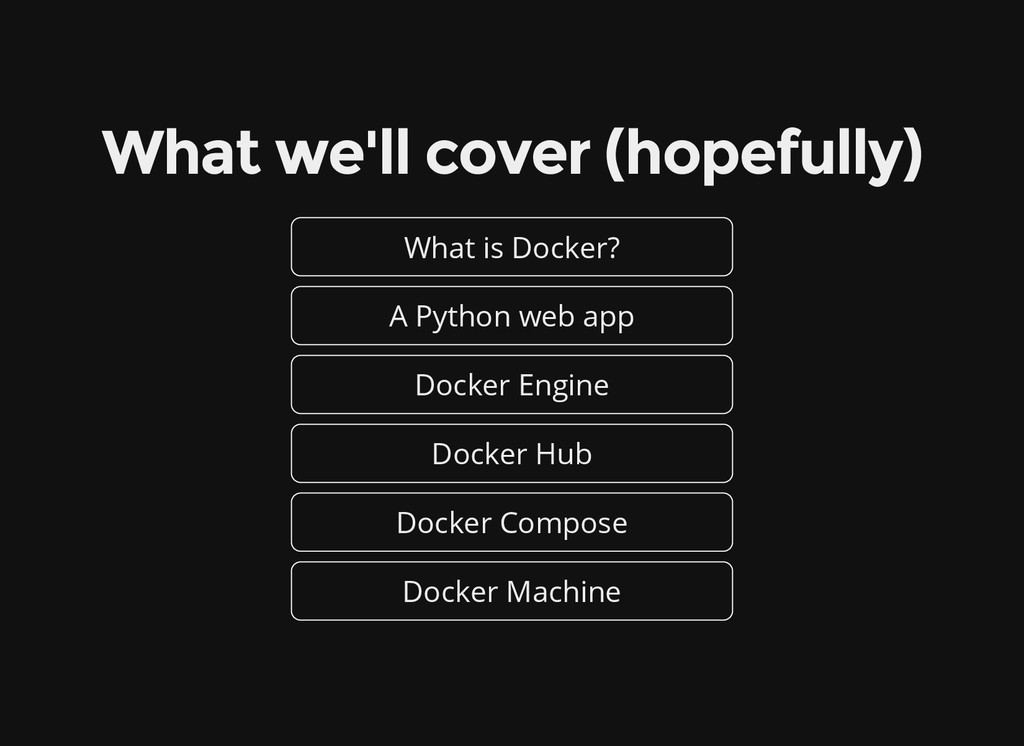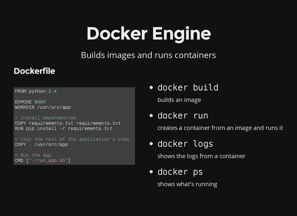 O M p y t h o n : 3 . 4 E X P O S E 8 0 0 0 W O R K D I R / u s r / s r c / a p p # I n s t a l l d e p e n d e n c i e s C O P Y r e q u i r e m e n t s . t x t r e q u i r e m e n t s . t x t R U N p i p i n s t a l l r r e q u i r e m e n t s . t x t # C o p y t h e r e s t o f t h e a p p l i c a t i o n ' s c o d e C O P Y . / u s r / s r c / a p p # R u n t h e a p p C M D [ " . / r u n _ a p p . s h " ] d o c k e r b u i l d builds an image d o c k e r r u n creates a container from an image and runs it d o c k e r l o g s shows the logs from a container d o c k e r p s shows what's running