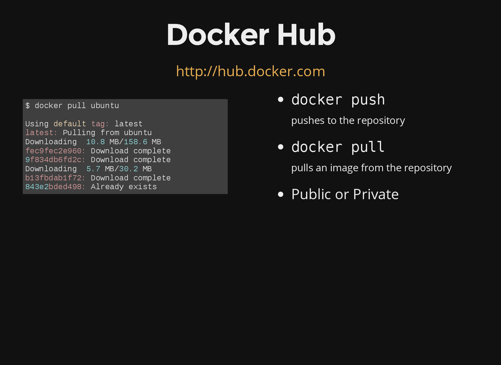 p u l l u b u n t u U s i n g d e f a u l t t a g : l a t e s t l a t e s t : P u l l i n g f r o m u b u n t u D o w n l o a d i n g 1 0 . 8 M B / 1 5 8 . 6 M B f e c 9 f e c 2 e 9 6 0 : D o w n l o a d c o m p l e t e 9 f 8 3 4 d b 6 f d 2 c : D o w n l o a d c o m p l e t e D o w n l o a d i n g 5 . 7 M B / 3 0 . 2 M B b 1 3 f b d a b 1 f 7 2 : D o w n l o a d c o m p l e t e 8 4 3 e 2 b d e d 4 9 8 : A l r e a d y e x i s t s d o c k e r p u s h pushes to the repository d o c k e r p u l l pulls an image from the repository Public or Private