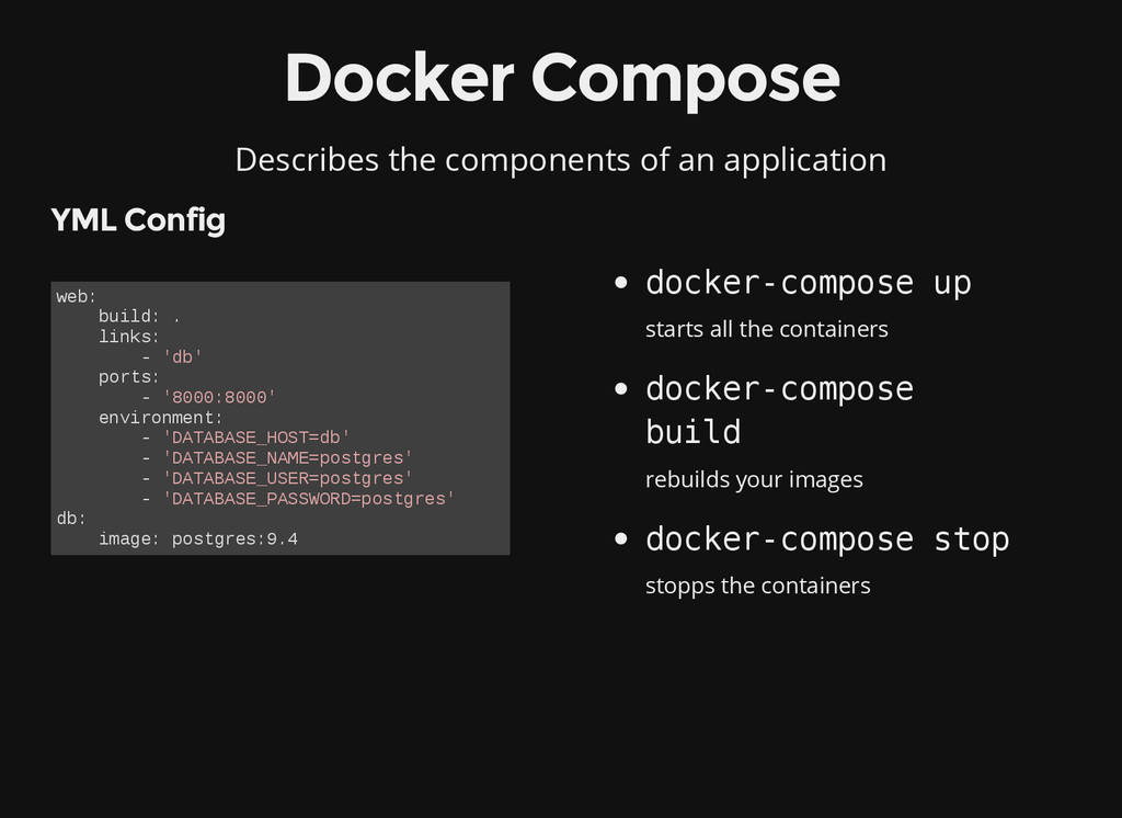 w e b : b u i l d : . l i n k s : ' d b ' p o r t s : ' 8 0 0 0 : 8 0 0 0 ' e n v i r o n m e n t : ' D A T A B A S E _ H O S T = d b ' ' D A T A B A S E _ N A M E = p o s t g r e s ' ' D A T A B A S E _ U S E R = p o s t g r e s ' ' D A T A B A S E _ P A S S W O R D = p o s t g r e s ' d b : i m a g e : p o s t g r e s : 9 . 4 d o c k e r - c o m p o s e u p starts all the containers d o c k e r - c o m p o s e b u i l d rebuilds your images d o c k e r - c o m p o s e s t o p stopps the containers