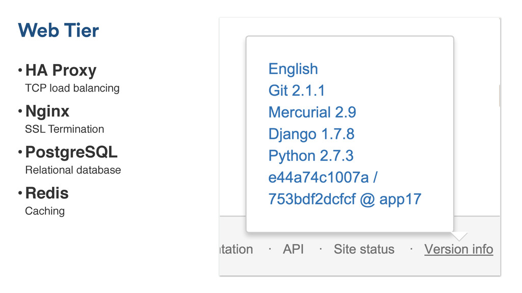 WSGI apps - One for Git, One for Hg •SSH • OpenSSH - Customized! • Launches another process (conq) to perform authentication and execute DVCS operations