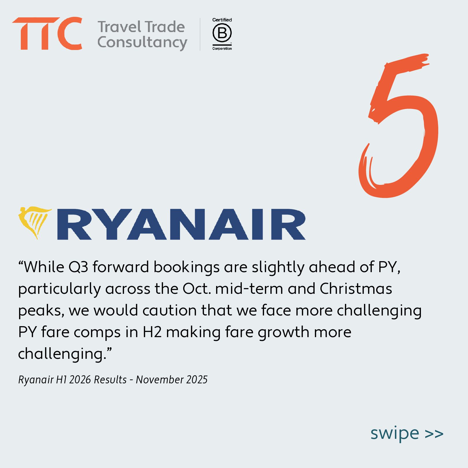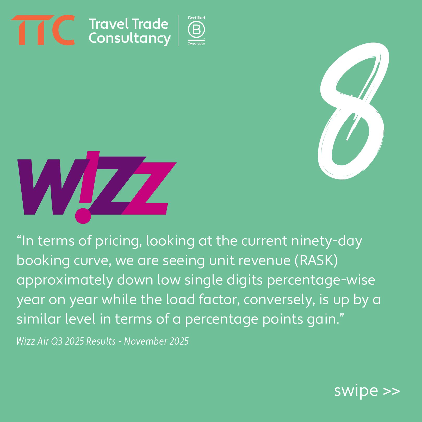 “In terms of pricing, looking at the current ninety-day booking curve, we are seeing unit revenue (RASK) approximately down low single digits percentage-wise year on year while the load factor, conversely, is up by a similar level in terms of a percentage points gain.”