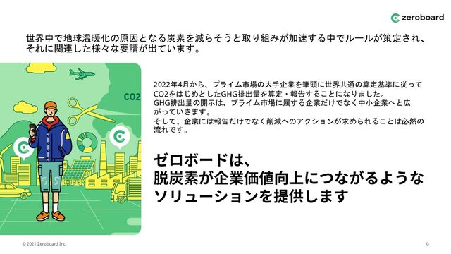 素経営の啓蒙にとどまらず、「zeroboard」のCO2排出量データ/サプライチェー ンデータに基づいた金融ソリューションの開発が検討されるところも強みです。 ゼロボードは、パートナー5社とともにタイで の脱炭素経営支援を開始しています。 かねてより国内拠点の省エネ化に取り組んで きた大手企業が、さらに排出量を削減するに は、取り組み余地が残されているサプライ チェーン上の取引先または海外製造拠点の脱 炭素化を進めることが肝要であることから、 タイを皮切りにアジア製造業サプライチェー ンの脱炭素実現を目指しています。 アジアを中心として グローバル製造業サプライチェーン のCO2排出量可視化・削減支援 金融機関 ゼロボードはCO2排出量の算定を通し、企業の脱炭素経営と地域のカーボンニュートラ ル実現を目指していますが、これは金融機関も同じです。金融機関自身がネットゼロを 目指すためには、Scope3 Cat.15にあたる投融資先企業のCO2排出量の把握が必要不可 欠です。彼らの積極的な施策への取り組みと大きな影響力は、金融機関を含むその他事 業者を巻き込んだOpen&Inclusiveなパートナシップの発展、さらにはソリューション プラットフォームの共同開発など、力強い支援施策ばかりです。また、算定・開示の ルールは今後も改変され続けるでしょうが、彼らと共に評価手法や可視化手段などを検 討していきます。