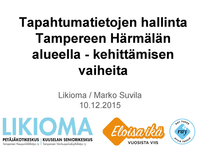 Tapahtumatietojen hallinta Tampereen Härmälän alueella - kehittämisen vaiheita kalvosetissä mainitaan vain muutamia prosessin tapahtumia. Paljon on ollut yritystä lobata helpomman tapahtumatietojen tiedonsaannin puolesta.