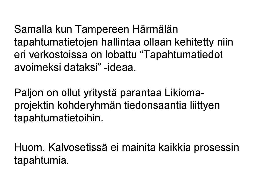 verkostoissa on lobattu “Tapahtumatiedot avoimeksi dataksi” -ideaa. Paljon on ollut yritystä parantaa Likioma- projektin kohderyhmän tiedonsaantia liittyen tapahtumatietoihin. Huom. Kalvosetissä ei mainita kaikkia prosessin tapahtumia.