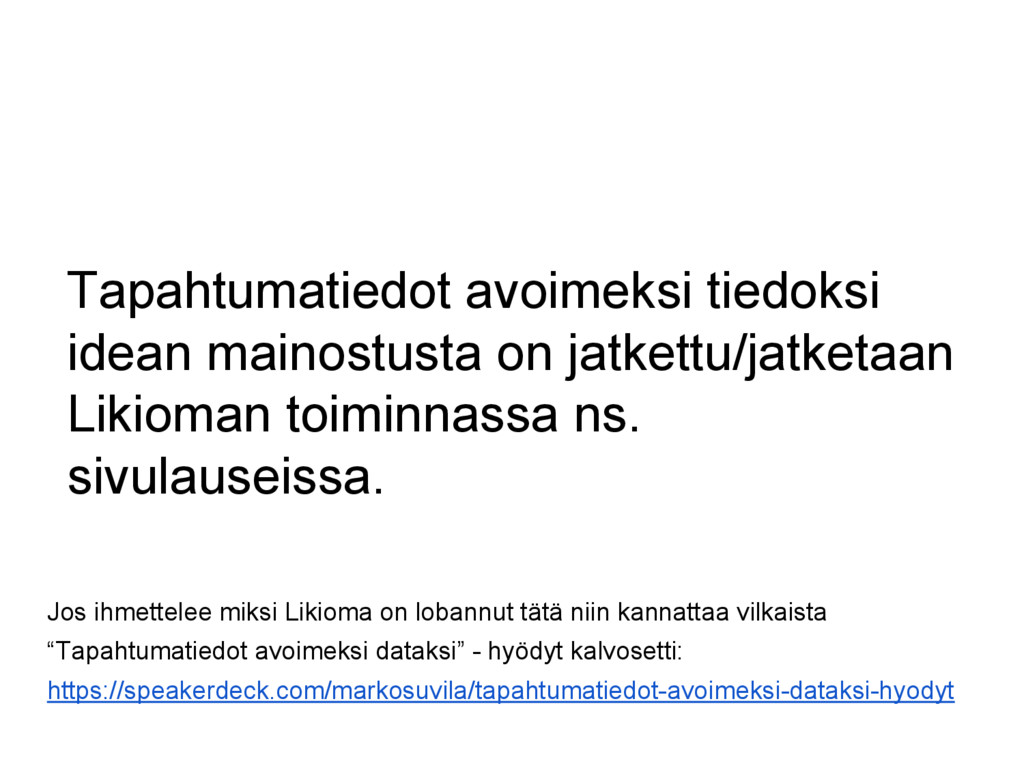 sivulauseissa. Jos ihmettelee miksi Likioma on lobannut tätä niin kannattaa vilkaista “Tapahtumatiedot avoimeksi dataksi” - hyödyt kalvosetti: https://speakerdeck.com/markosuvila/tapahtumatiedot-avoimeksi-dataksi-hyodyt