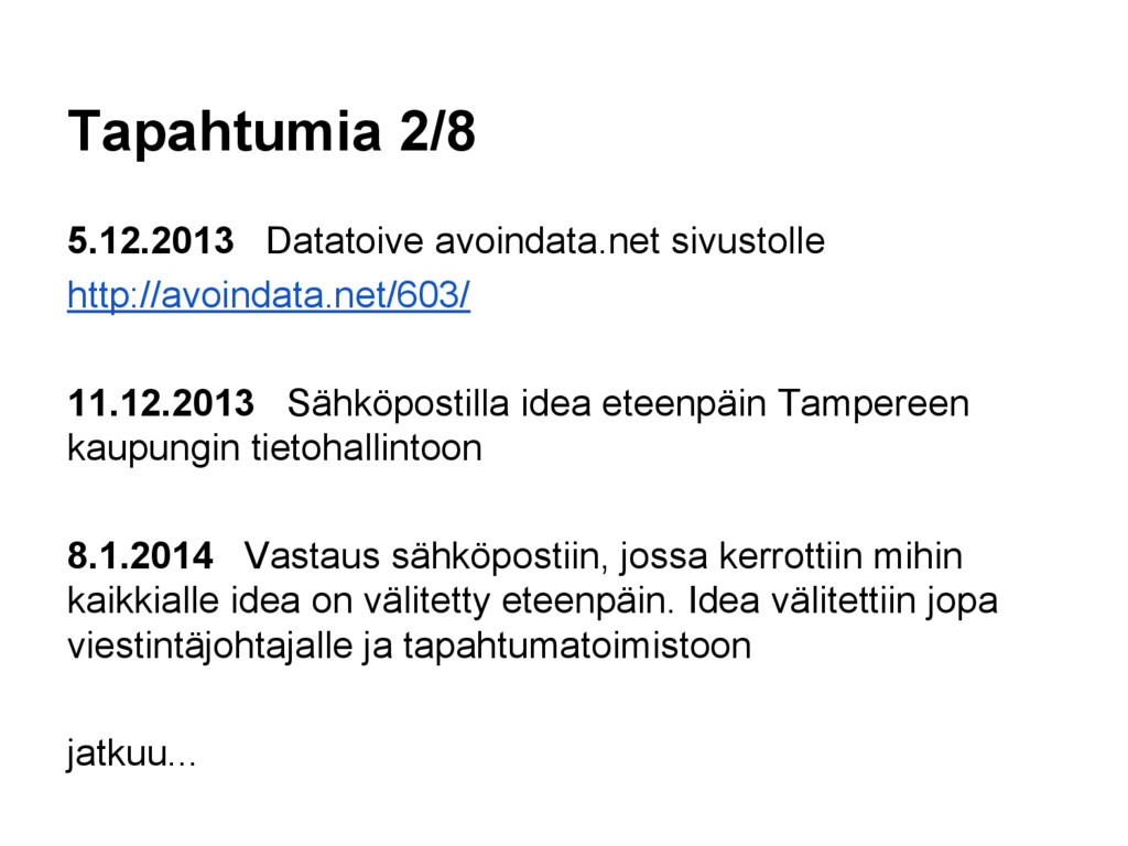 eteenpäin Tampereen kaupungin tietohallintoon 8.1.2014 Vastaus sähköpostiin, jossa kerrottiin mihin kaikkialle idea on välitetty eteenpäin. Idea välitettiin jopa viestintäjohtajalle ja tapahtumatoimistoon jatkuu...