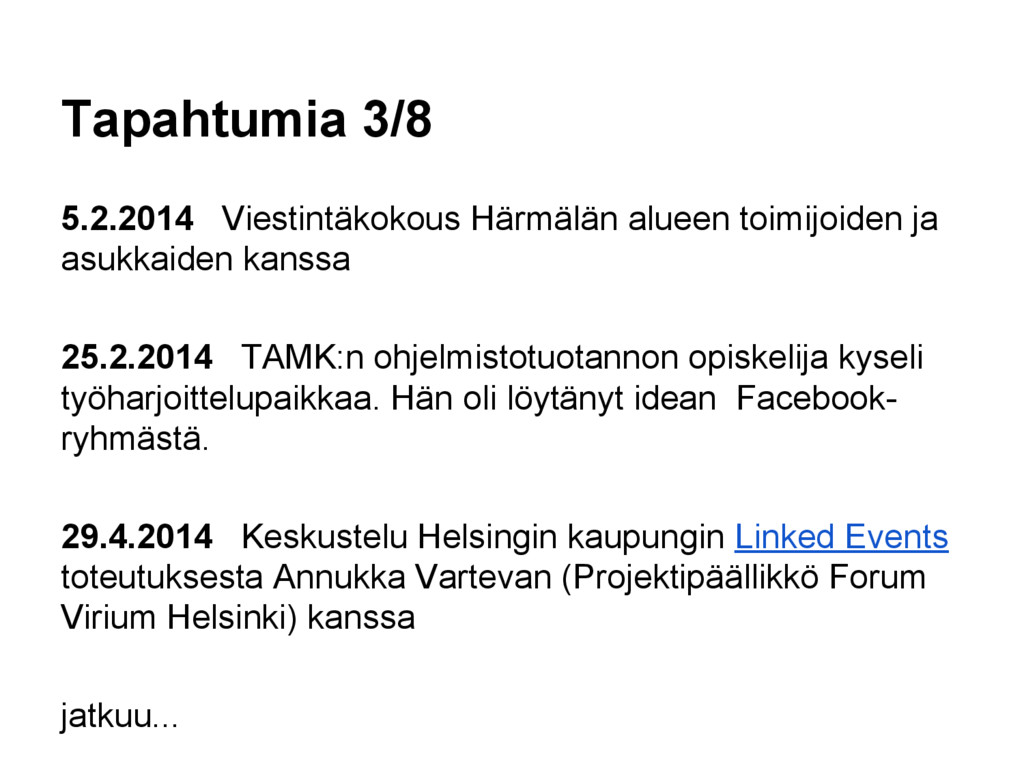 25.2.2014 TAMK:n ohjelmistotuotannon opiskelija kyseli työharjoittelupaikkaa. Hän oli löytänyt idean Facebook- ryhmästä. 29.4.2014 Keskustelu Helsingin kaupungin Linked Events toteutuksesta Annukka Vartevan (Projektipäällikkö Forum Virium Helsinki) kanssa jatkuu...