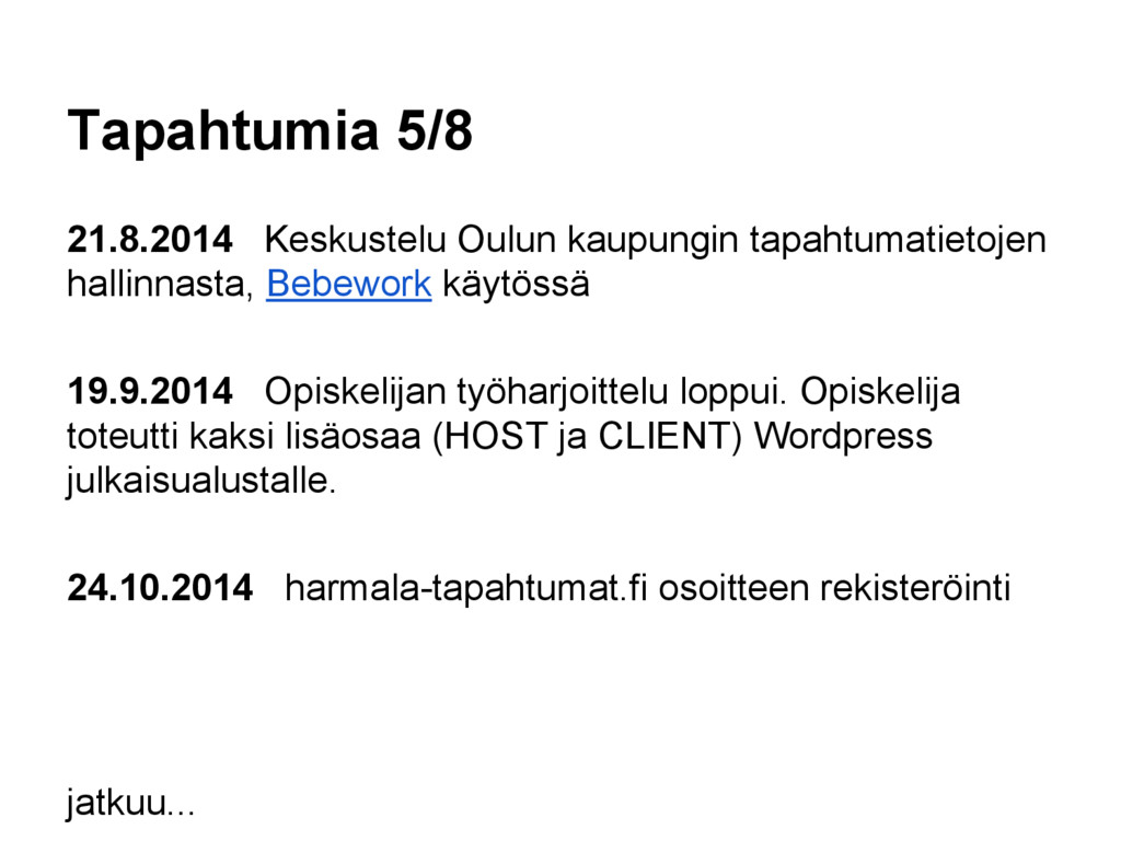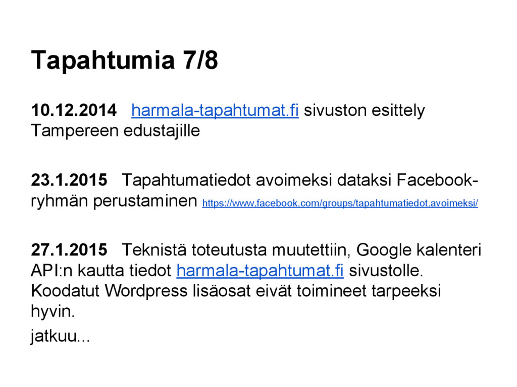 avoimeksi dataksi Facebook- ryhmän perustaminen https://www.facebook.com/groups/tapahtumatiedot.avoimeksi/ 27.1.2015 Teknistä toteutusta muutettiin, Google kalenteri API:n kautta tiedot harmala-tapahtumat.fi sivustolle. Koodatut Wordpress lisäosat eivät toimineet tarpeeksi hyvin. jatkuu...