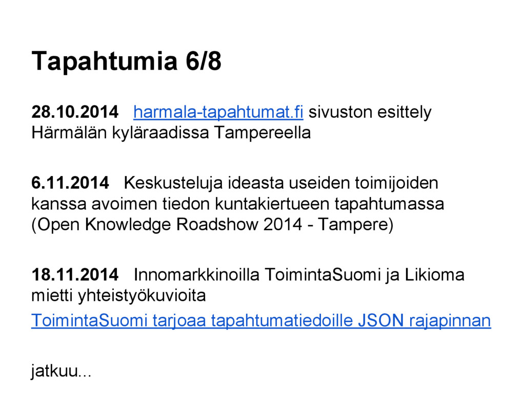 Keskusteluja ideasta useiden toimijoiden kanssa avoimen tiedon kuntakiertueen tapahtumassa (Open Knowledge Roadshow 2014 - Tampere) 18.11.2014 Innomarkkinoilla ToimintaSuomi ja Likioma mietti yhteistyökuvioita ToimintaSuomi tarjoaa tapahtumatiedoille JSON rajapinnan jatkuu...