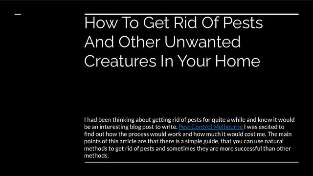 can invade your home, and each one requires a different treatment. Pests can include ants, cockroaches, spiders, mice, rats and other rodents, birds, bats and other mammals, flies, lizards and snakes. Ants: Ants are the most common type of pest in homes. They are attracted to sugar and starch sources and will spread their colonies by raiding food stores or gathering goods to bring back to their nest. You can get rid of ants by using a good ant killer or baiting them with sugar or syrup. Cockroaches: Cockroaches are another common pest that you may want to get rid of from your home. Cockroaches reproduce quickly and come in a variety of colors including black, brown, gray, yellow and tan. To get rid of cockroaches use insecticides or bait traps. Spiders: Spiders can be a nuisance both indoors and outdoors. They build webs to trap prey which can include tiny insects as well as small animals like mice or even small children. To get rid of spiders use an insecticide or take them outside where they belong. Mice: Mice are small creatures that live in families inside homes as well as outdoors. They love to eat food stored away from the reach of humans such as cereal boxes or flour sacks. To get rid of mice use scents like peppermint oil around the edges of food storage areas