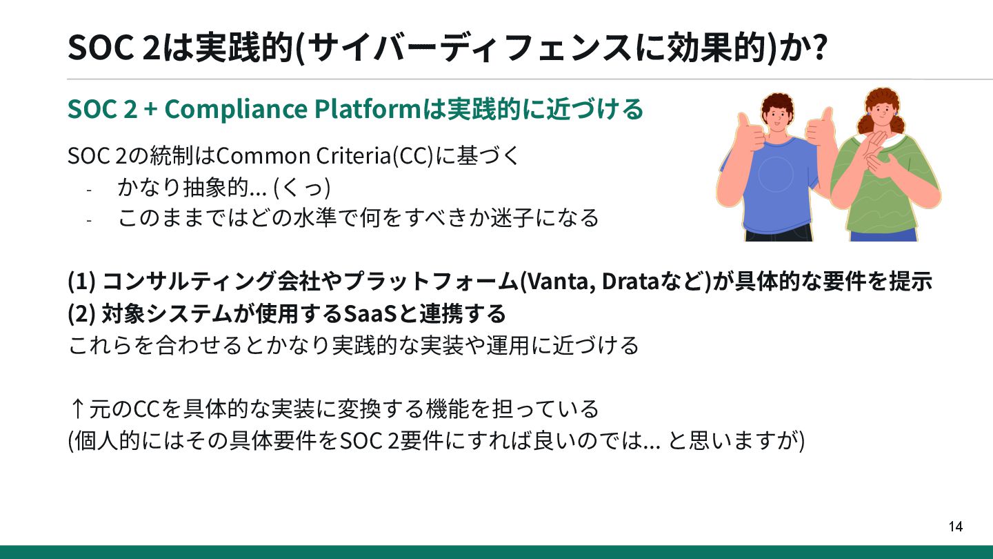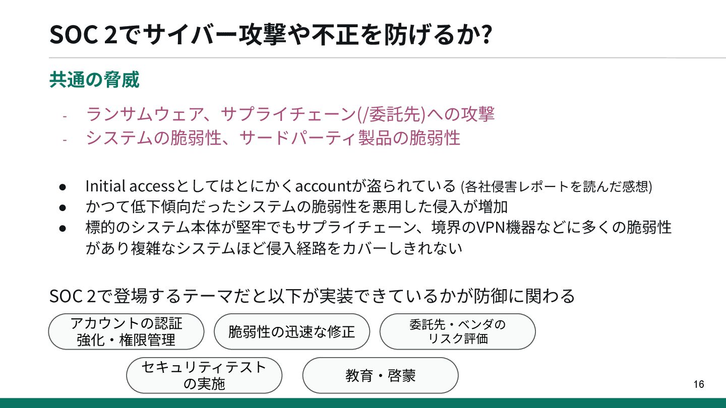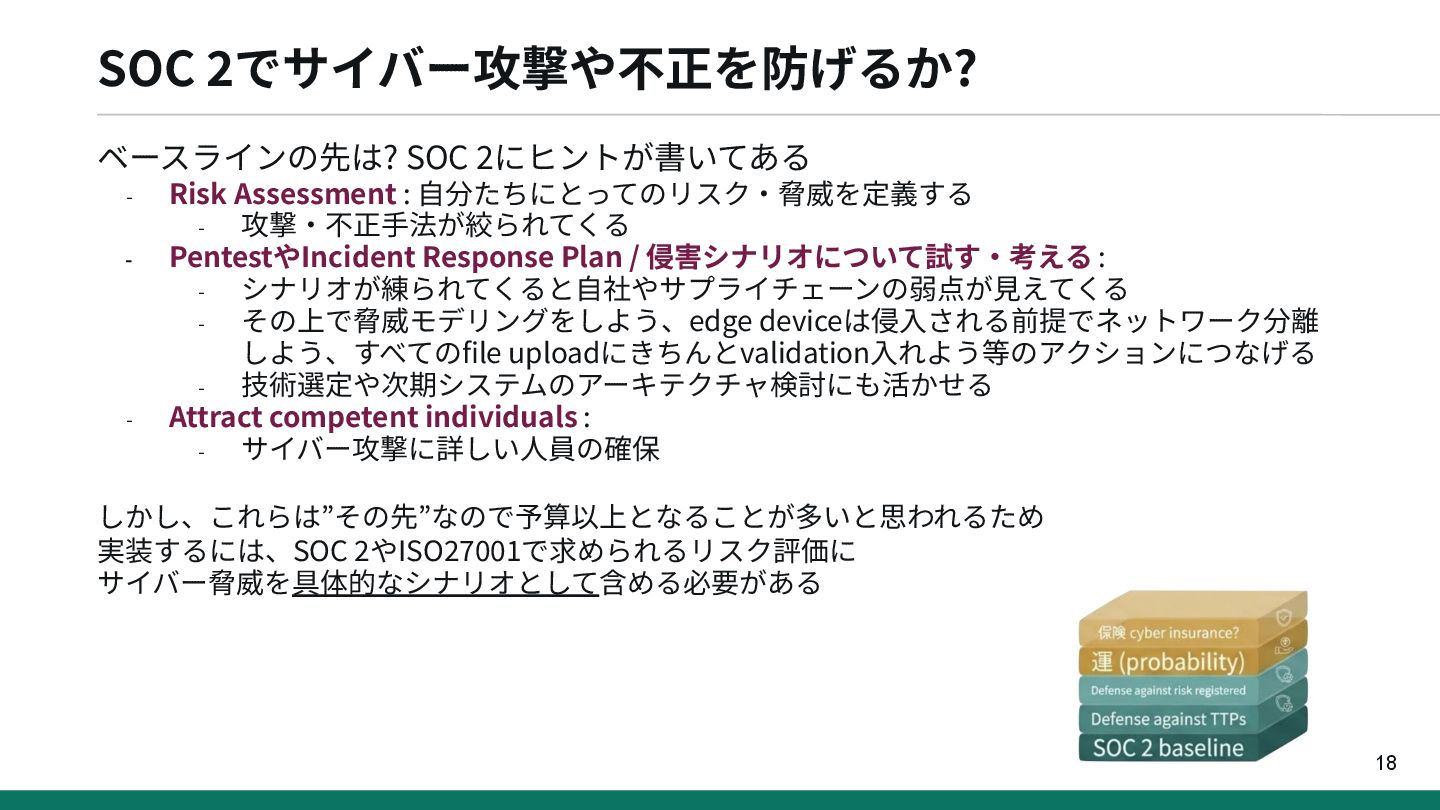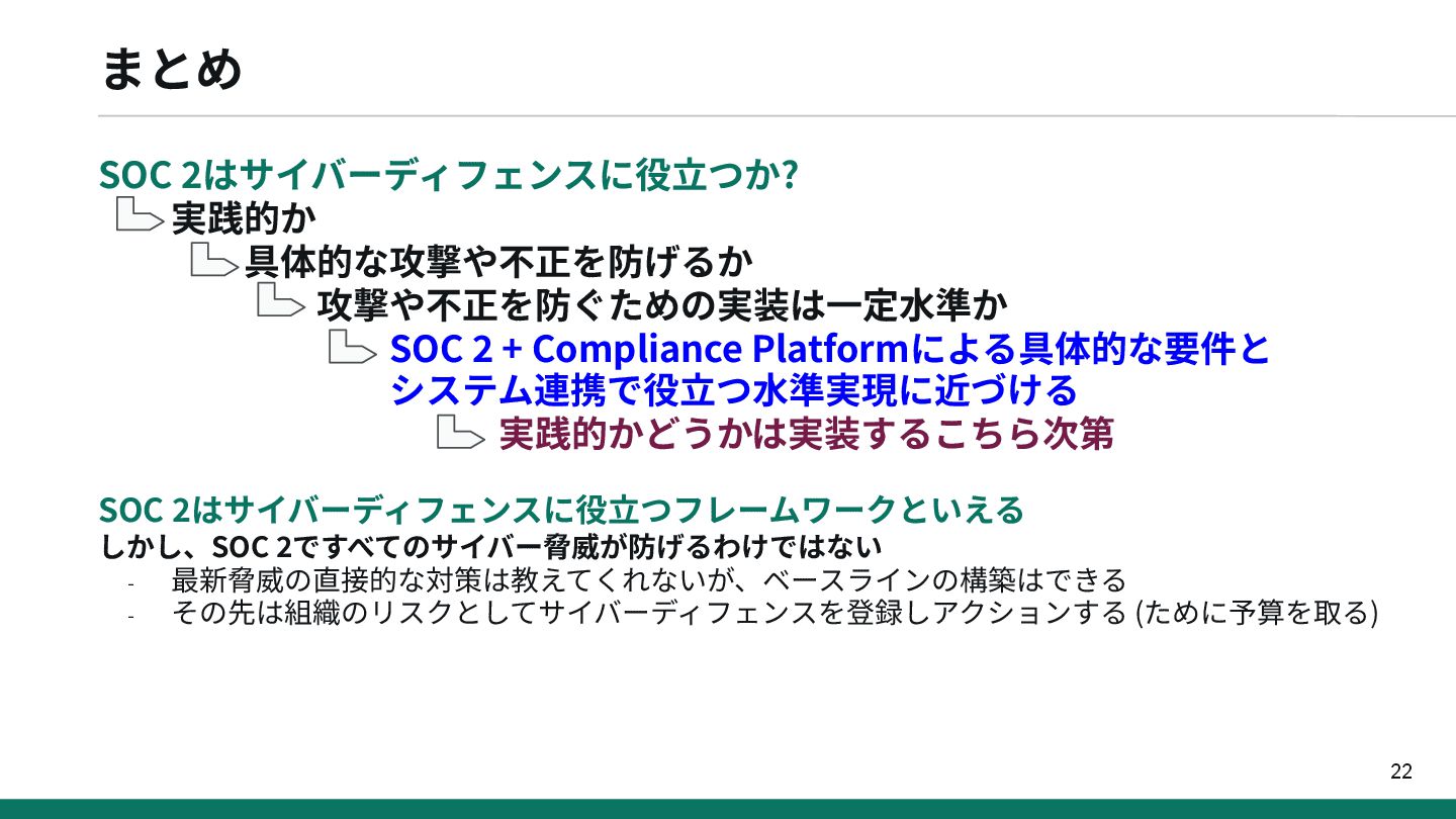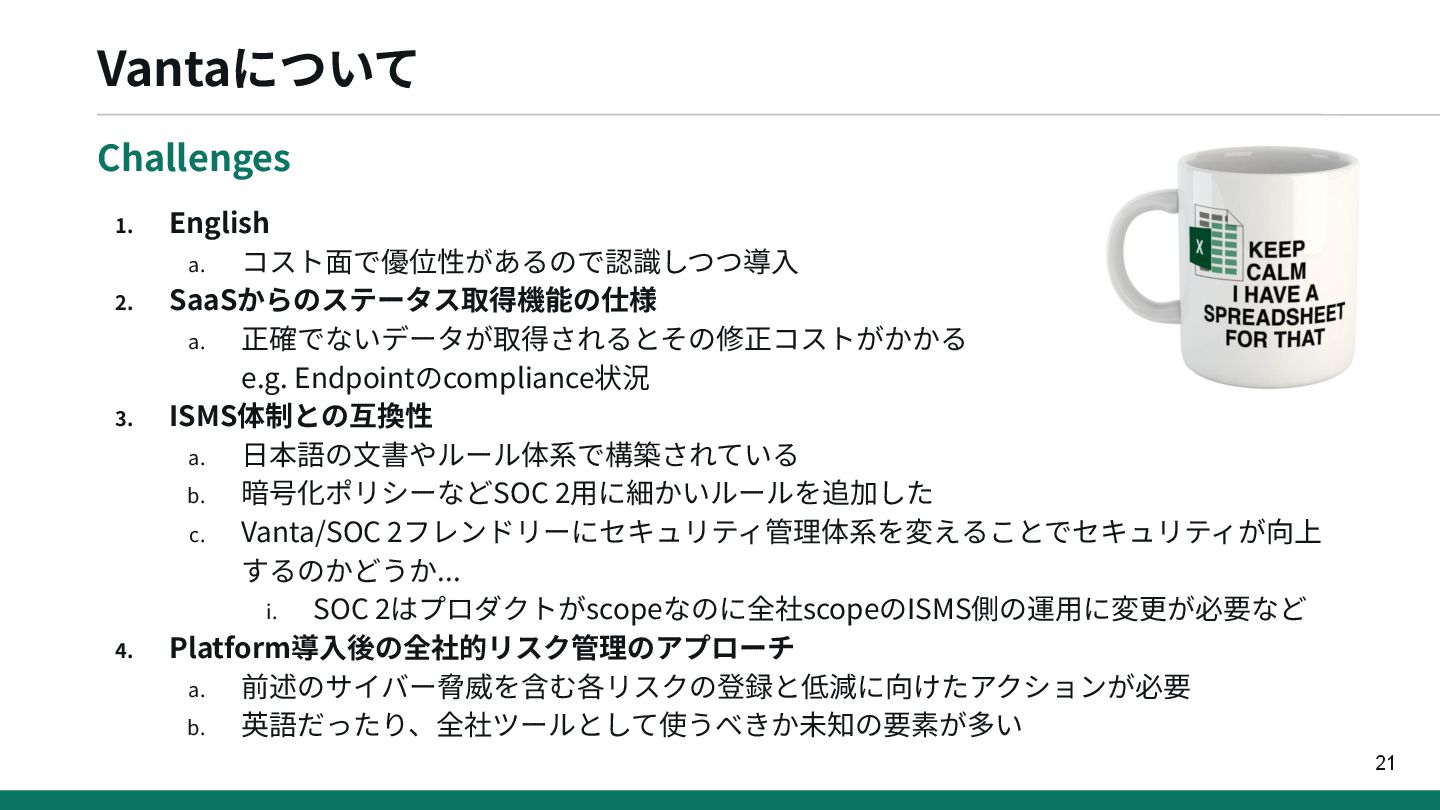 正確でないデータが取得されるとその修正コストがかかる e.g. Endpointのcompliance状況 3. ISMS体制との互換性 a. ⽇本語の⽂書やルール体系で構築されている b. 暗号化ポリシーなどSOC 2⽤に細かいルールを追加した c. Vanta/SOC 2フレンドリーにセキュリティ管理体系を変えることでセキュリティが向上 するのかどうか... i. SOC 2はプロダクトがscopeなのに全社scopeのISMS側の運⽤に変更が必要など 4. Platform導⼊後の全社的リスク管理のアプローチ a. 前述のサイバー脅威を含む各リスクの登録と低減に向けたアクションが必要 b. 英語だったり、全社ツールとして使うべきか未知の要素が多い