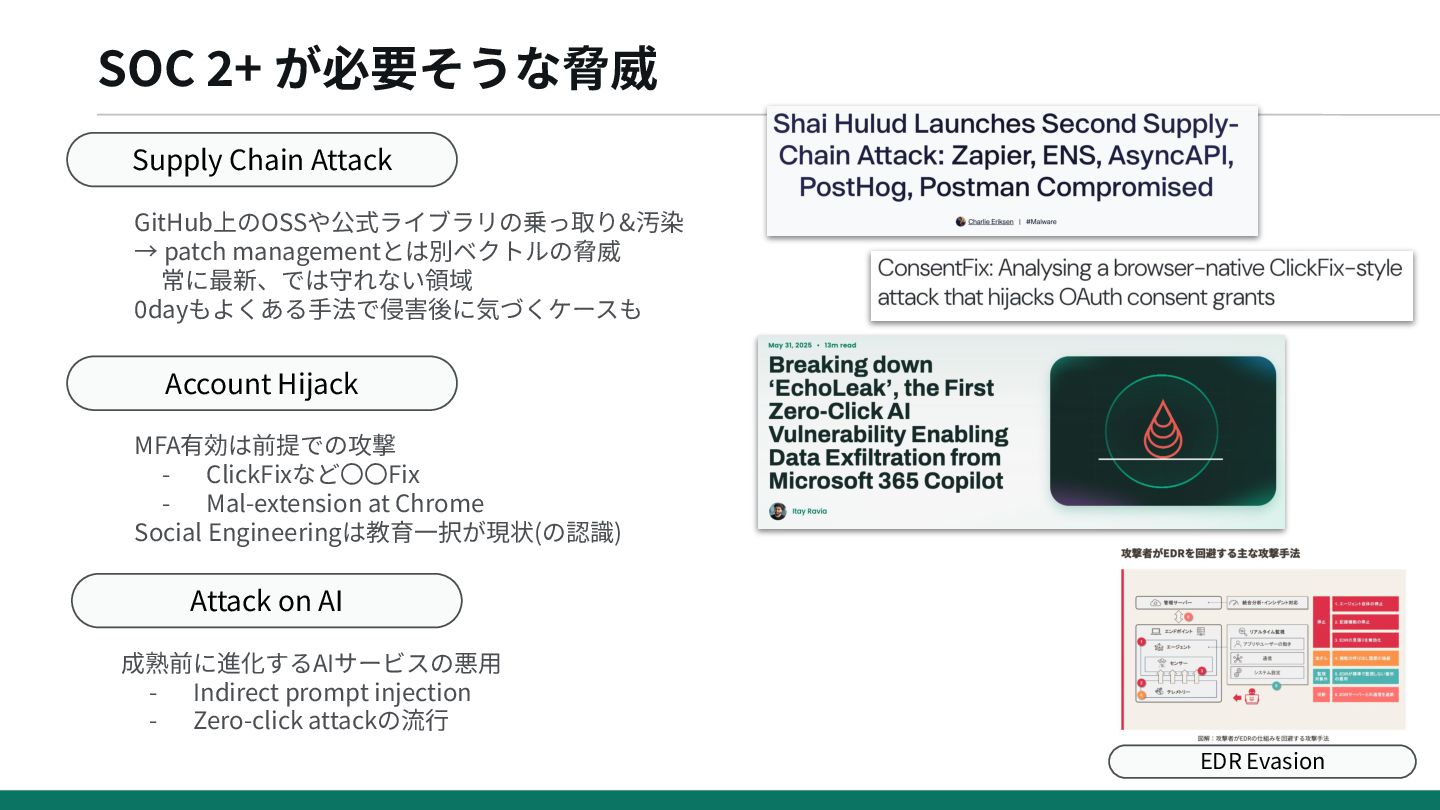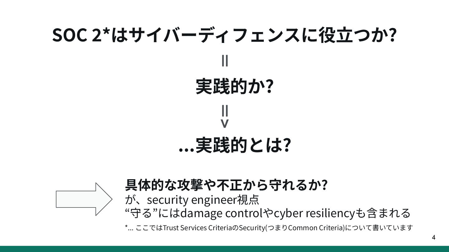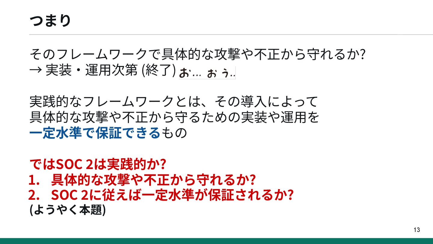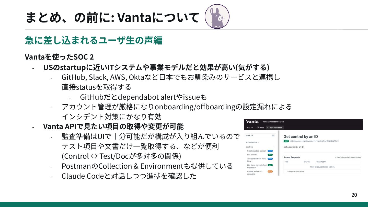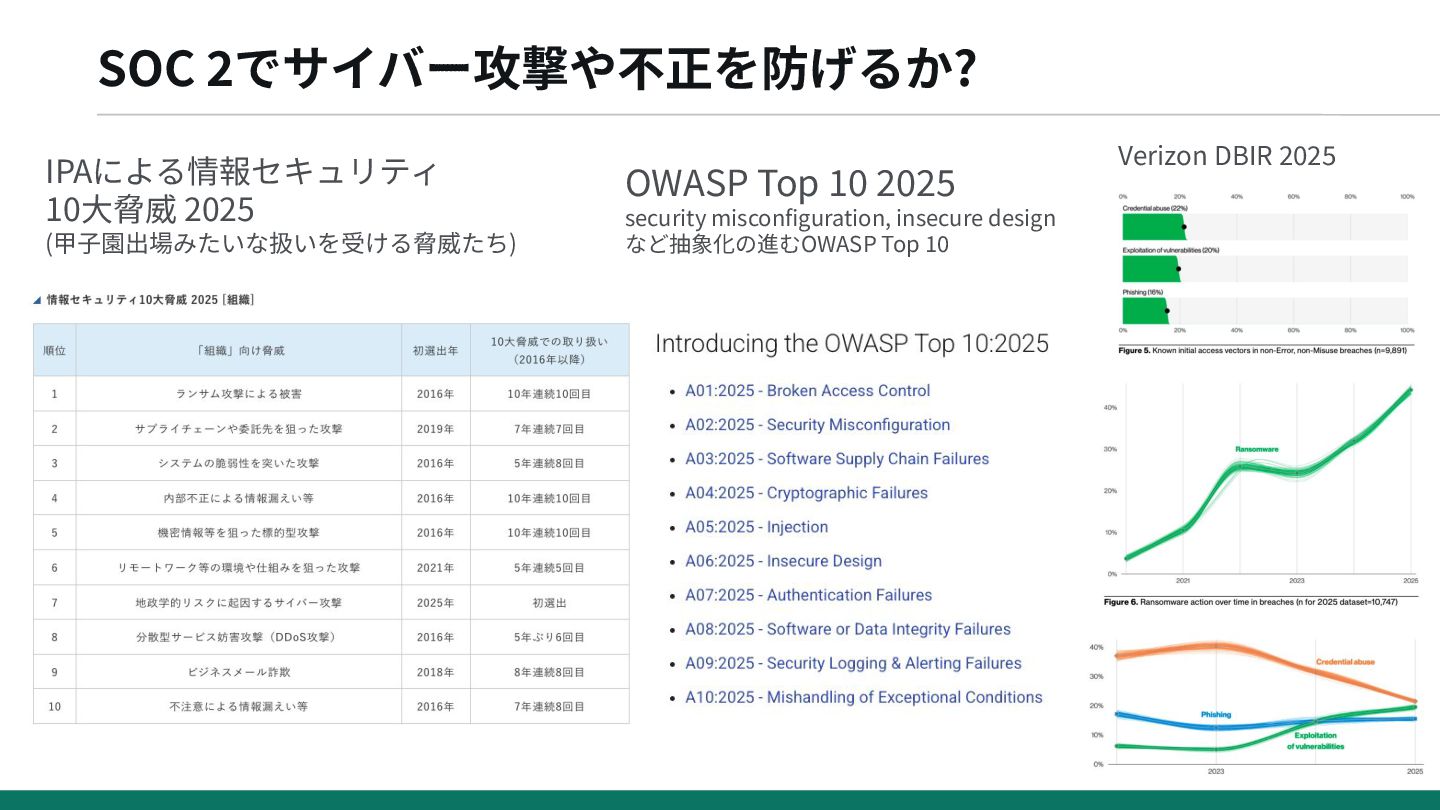 正確でないデータが取得されるとその修正コストがかかる e.g. Endpointのcompliance状況 3. ISMS体制との互換性 a. ⽇本語の⽂書やルール体系で構築されている b. 暗号化ポリシーなどSOC 2⽤に細かいルールを追加した c. Vanta/SOC 2フレンドリーにセキュリティ管理体系を変えることでセキュリティが向上 するのかどうか... i. SOC 2はプロダクトがscopeなのに全社scopeのISMS側の運⽤に変更が必要など 4. Platform導⼊後の全社的リスク管理のアプローチ a. 前述のサイバー脅威を含む各リスクの登録と低減に向けたアクションが必要 b. 英語だったり、全社ツールとして使うべきか未知の要素が多い