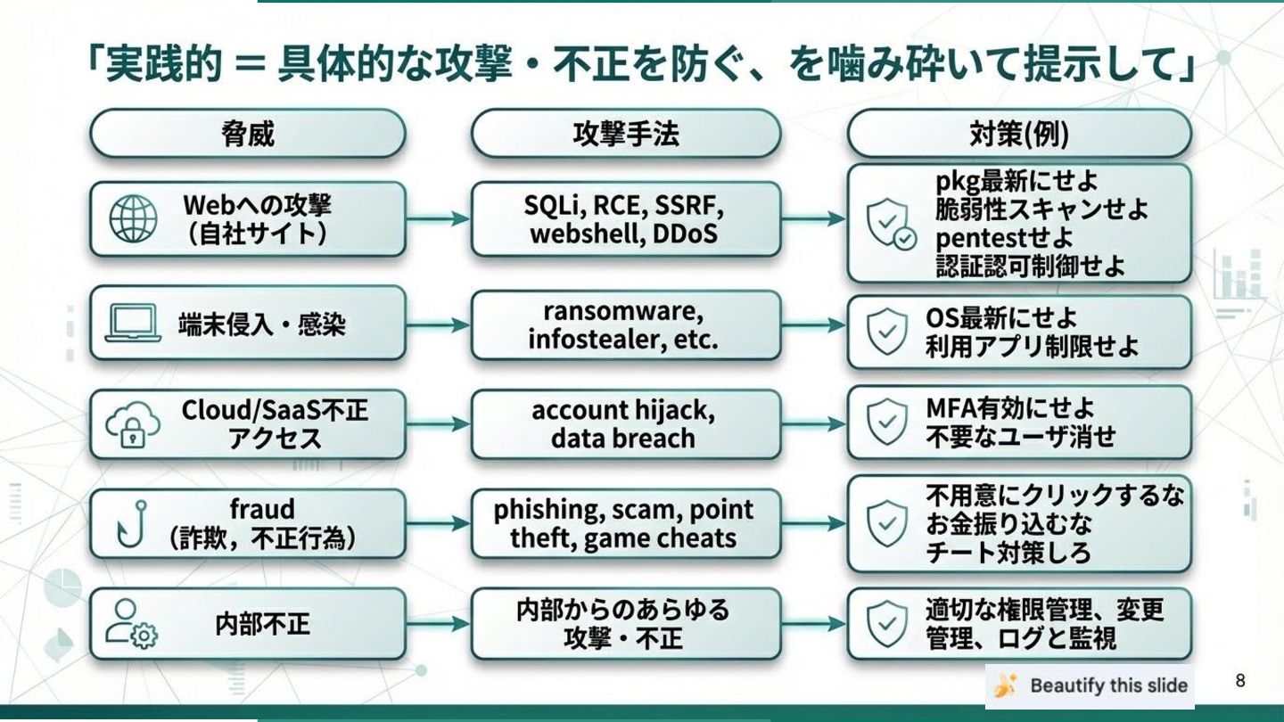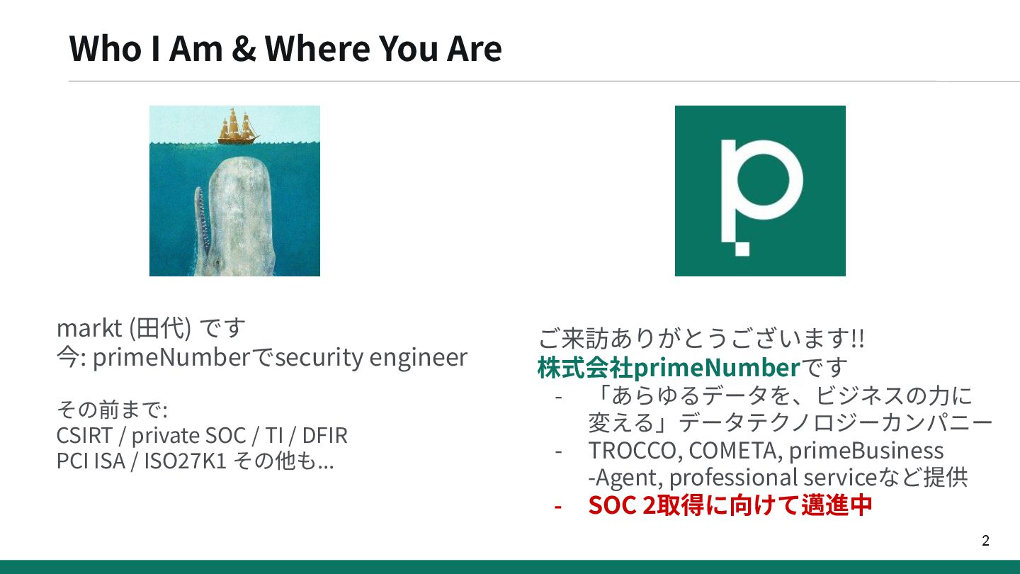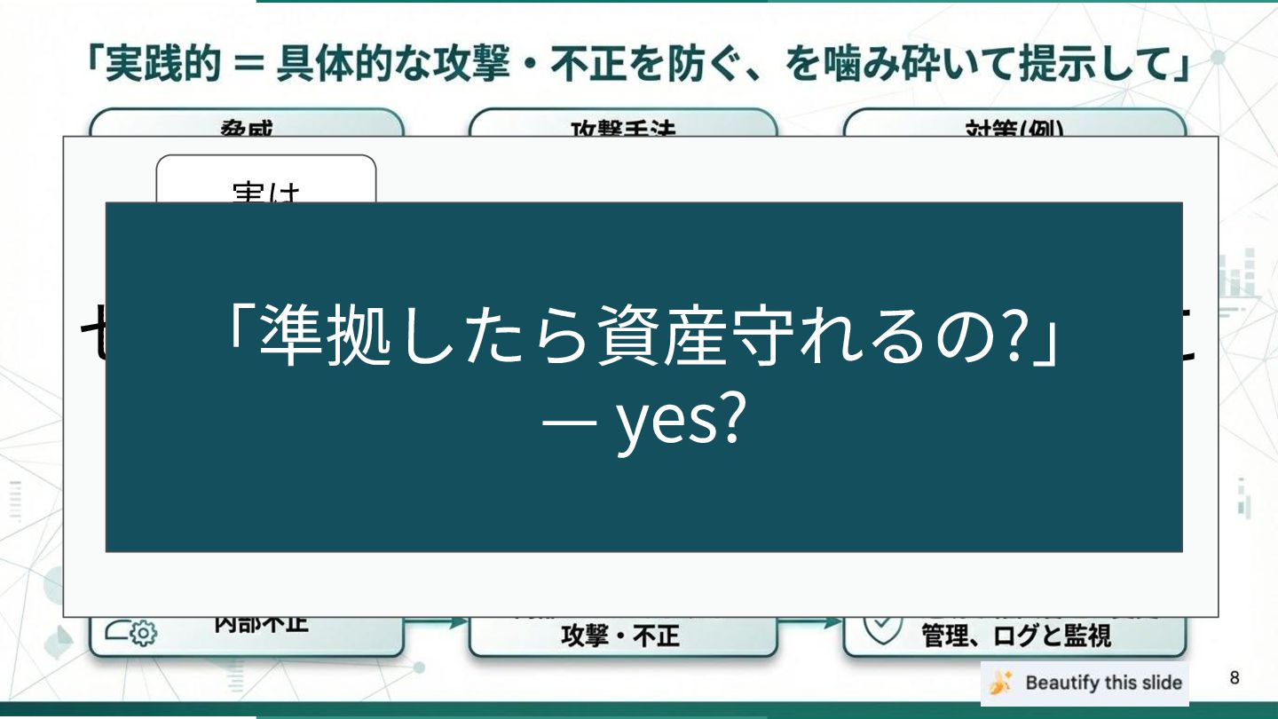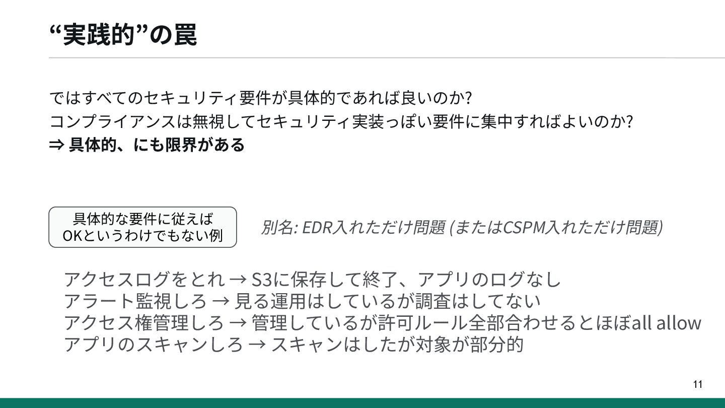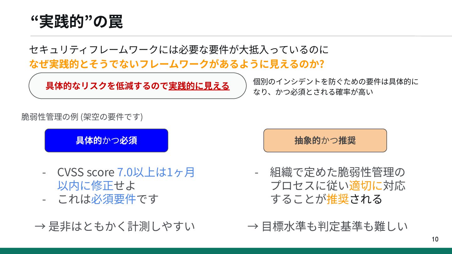 正確でないデータが取得されるとその修正コストがかかる e.g. Endpointのcompliance状況 3. ISMS体制との互換性 a. ⽇本語の⽂書やルール体系で構築されている b. 暗号化ポリシーなどSOC 2⽤に細かいルールを追加した c. Vanta/SOC 2フレンドリーにセキュリティ管理体系を変えることでセキュリティが向上 するのかどうか... i. SOC 2はプロダクトがscopeなのに全社scopeのISMS側の運⽤に変更が必要など 4. Platform導⼊後の全社的リスク管理のアプローチ a. 前述のサイバー脅威を含む各リスクの登録と低減に向けたアクションが必要 b. 英語だったり、全社ツールとして使うべきか未知の要素が多い