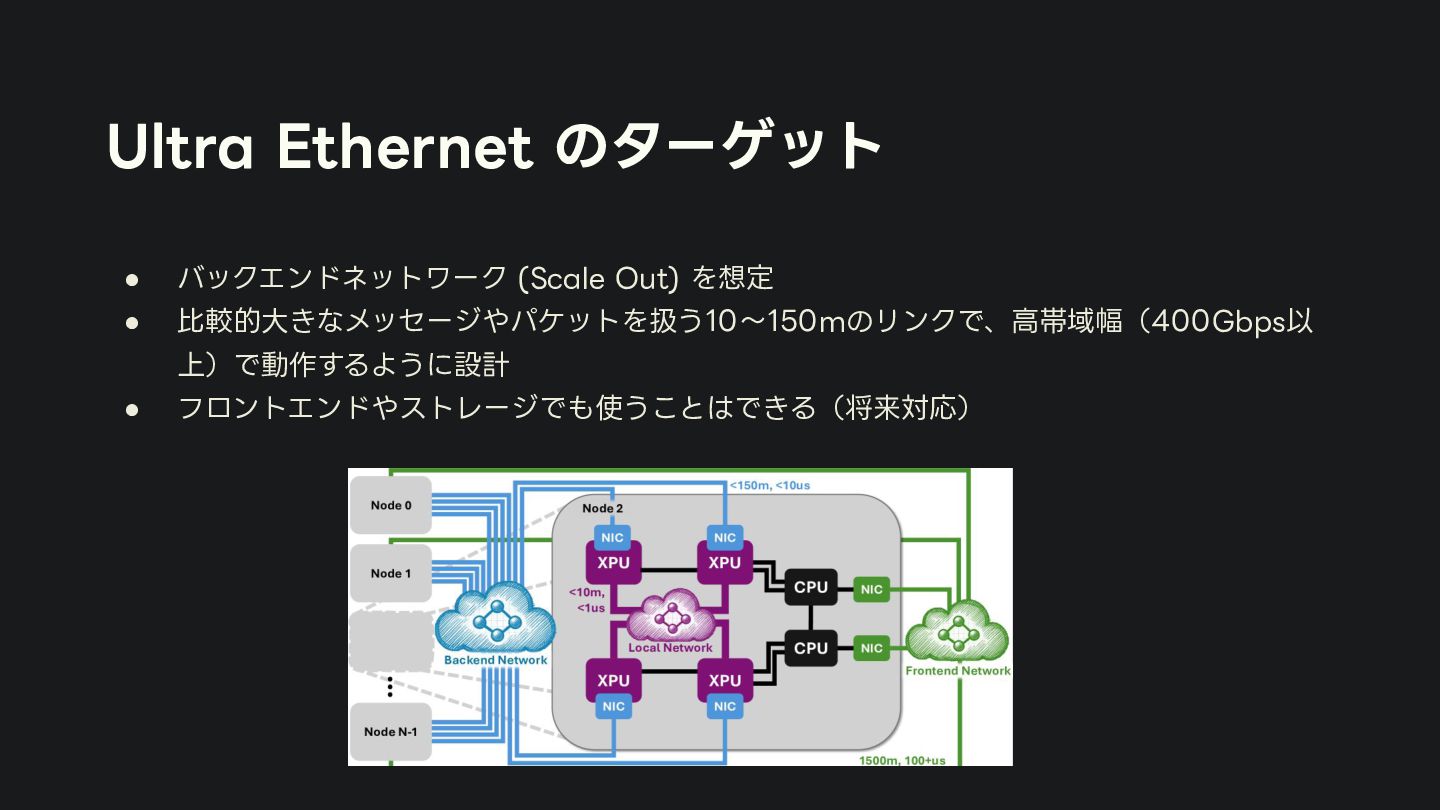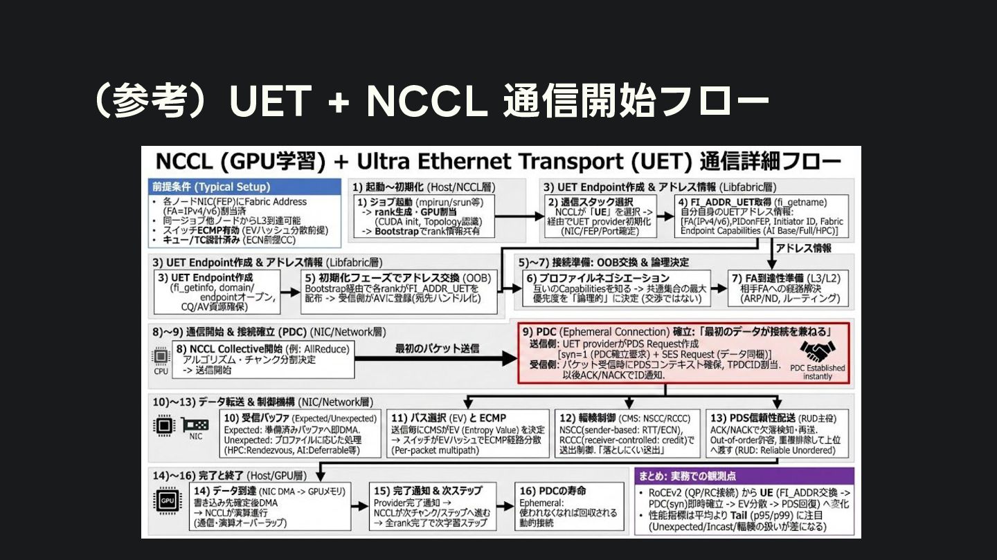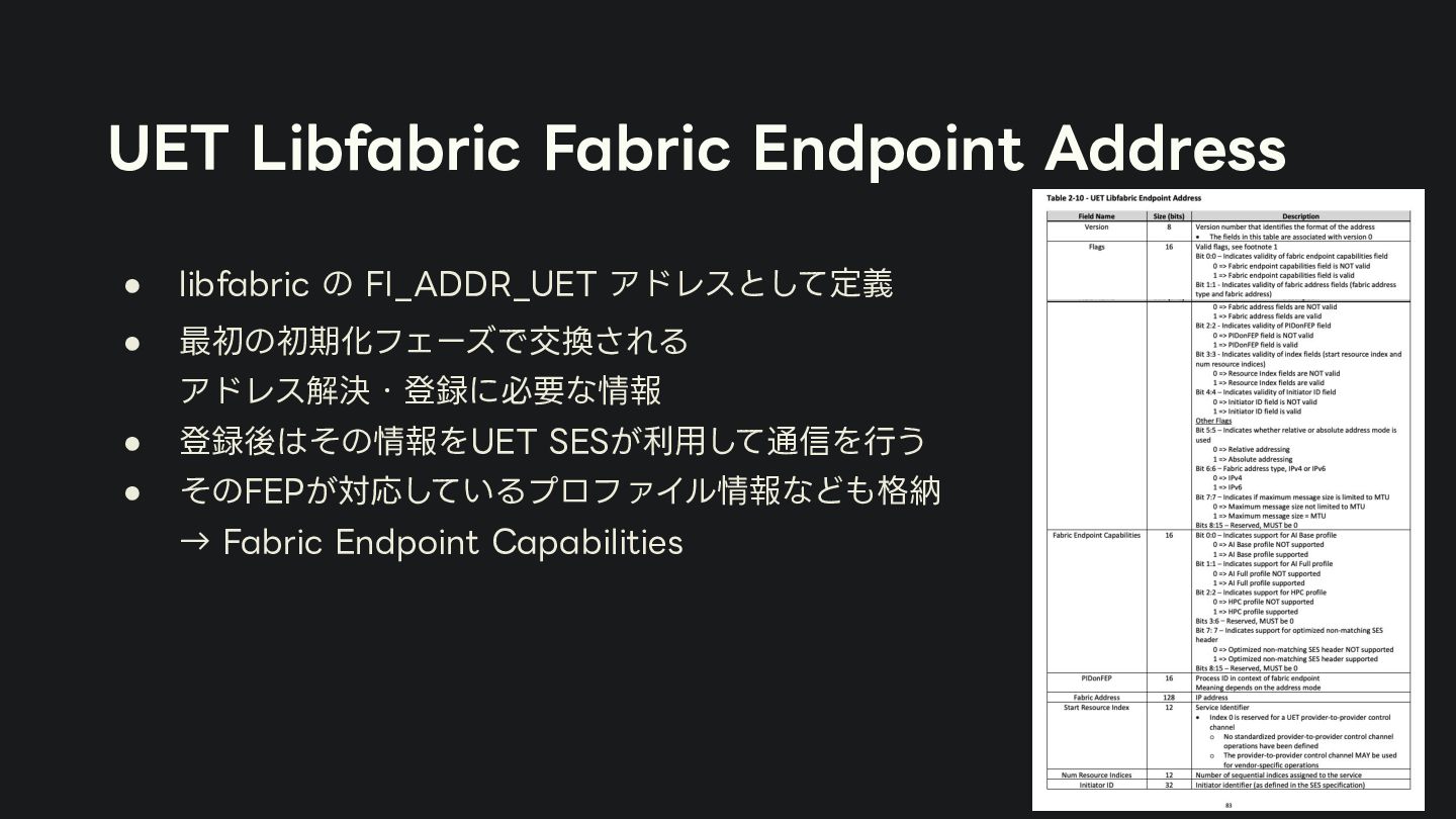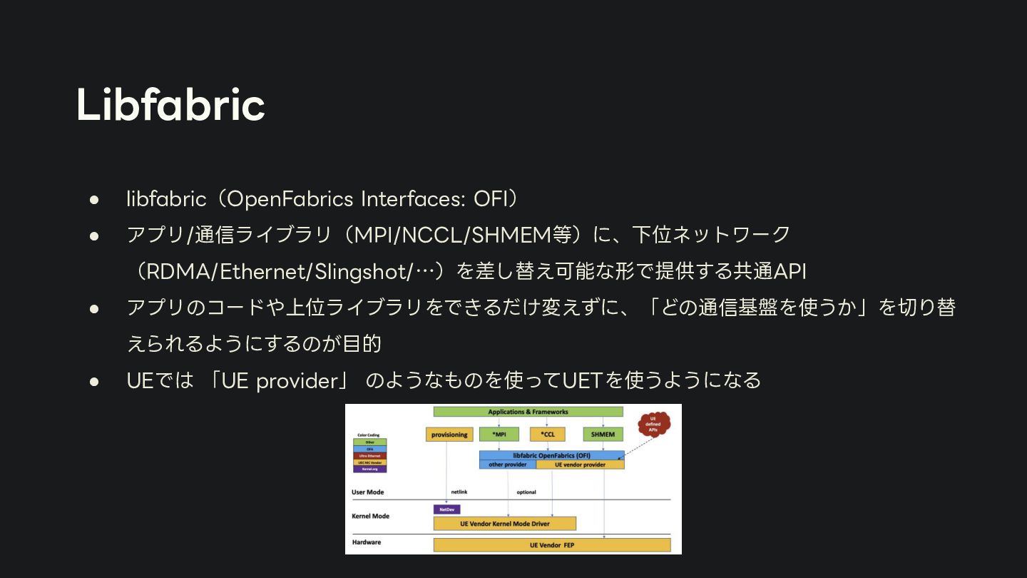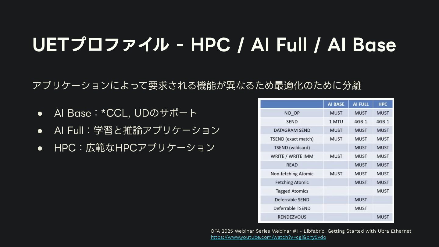 • AI Base:*CCL, UDのサポート • AI Full:学習と推論アプリケーション • HPC:広範なHPCアプリケーション OFA 2025 Webinar Series Webinar #1 - Libfabric: Getting Started with Ultra Ethernet https://www.youtube.com/watch?v=cgiGbny5vdo