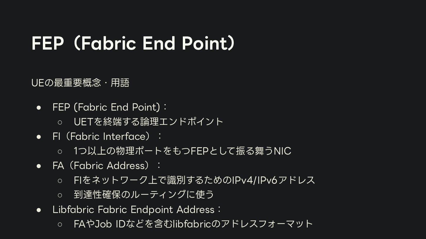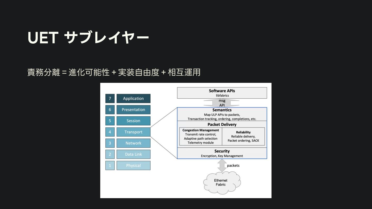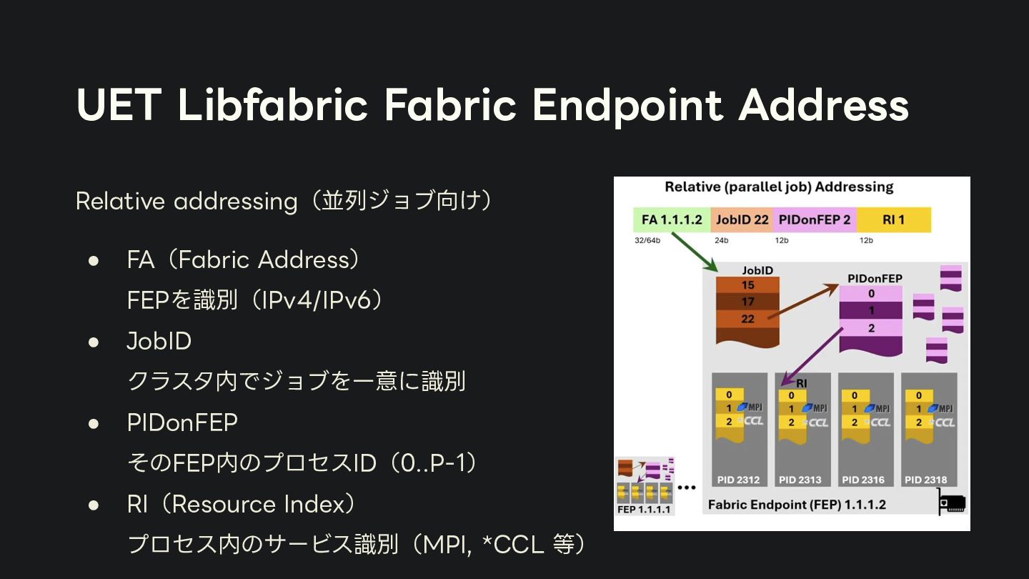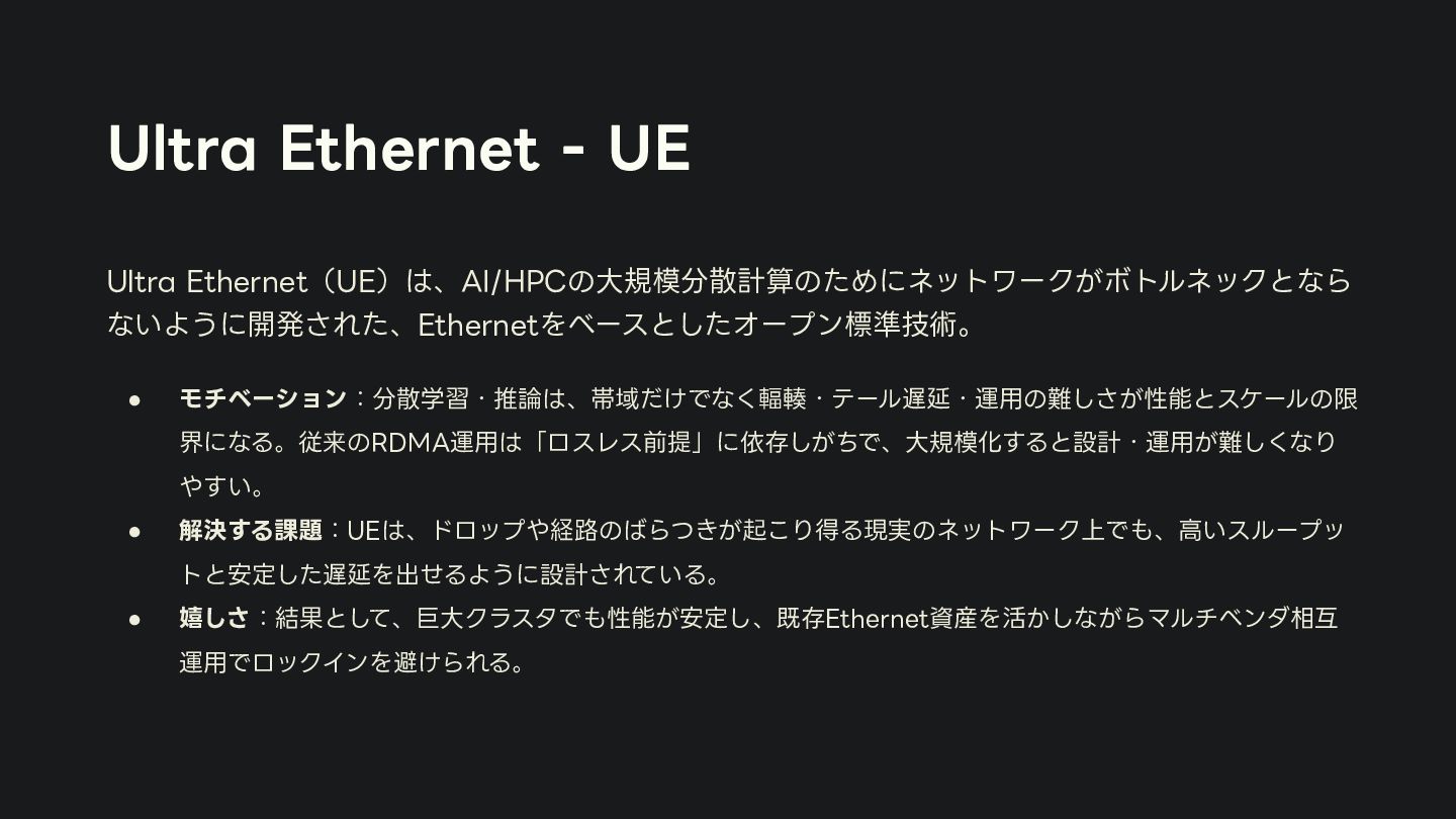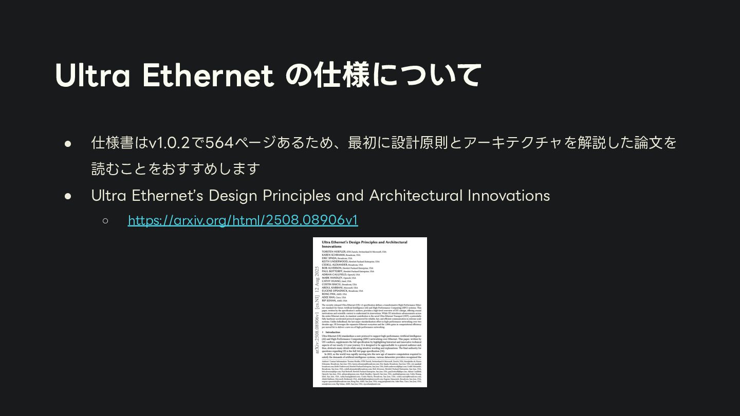 • AI Base:*CCL, UDのサポート • AI Full:学習と推論アプリケーション • HPC:広範なHPCアプリケーション OFA 2025 Webinar Series Webinar #1 - Libfabric: Getting Started with Ultra Ethernet https://www.youtube.com/watch?v=cgiGbny5vdo